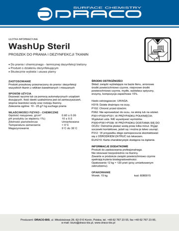 ULOTKA INFORMACYJNA WashUp Steril PROSZEK DO PRANIA I DEZYNFEKCJI TKANIN Do prania i chemicznego - termicznej dezynfekcji bielizny Produkt o działaniu dezynfekującym Skutecznie wybiela i usuwa plamy ZASTOSOWANIE Produkt proszkowy przeznaczony do prania i dezynfekcji wszystkich tkanin z włókien bawełnianych i mieszanych SPOSÓB UŻYCIA Dozować ręcznie lub za pomocą automatycznych urządzeń dozujących. Ilość dawki uzależniona jest od zanieczyszczeń, stopnia twardości wody oraz rodzaju tkaniny. Zalecenia ogólne: 10 - 25 g/1 kg suchego prania WŁAŚCIWOŚCI FIZYKO - CHEMICZNE Gęstość nasypowa, g/cm³ pH produktu (w stężeniu 1%) Zdolność pianotwórcza Temperatura zamarzania Magazynowanie ŚRODKI OSTROŻNOŚCI Skład: związki wybielające na bazie tlenu, anionowe środki powierzchniowo czynne, niejonowe środki powierzchniowo czynne, mydło, wybielacz optyczny, enzymy, kompozycja zapachowa <5%. Hasło ostrzegawcze: UWAGA. H319: Działa drażniąco na oczy. P102: Chronić przed dziećmi. P262: Nie wprowadzać do oczu, na skórę lub na odzież. 0.60 ± 0.05 10 ± 0.5 Umiarkowana < 0˚C 5˚C do 35˚C P301+P330+P331: W PRZYPADKU POŁKNIĘCIA: Wypłukać usta. NIE wywoływać wymiotów. P305+P351+P338: W PRZYPADKU DOSTANIA SIĘ DO OCZU: Ostrożnie płukać wodą przez kilka minut. Wyjąć soczewki kontaktowe, jeżeli są i można je łatwo usunąć. P312 : W przypadku złego samopoczucia skontaktować się z OŚRODKIEM ZATRUĆ lub lekarzem. EUH210: Karta charakterystyki dostępna na żądanie. INFORMACJE DODATKOWE Produkt do zastosowania profesjonalnego. Nie stosować bezpośrednio na tkaniny. Zawarte w produkcie związki powierzchniowo czynne spełniają kryteria biodegradowalności. Opakowanie 12 kg = 120 prań (przy umiarkowanym zabrudzeniu). OPAKOWANIE Worek: 15 kg kod: 6080015 Producent: DRACO-BIS, ul. Młodzieżowa 29, 62-510 Konin, Polska, tel. +48 62 767 23 55, fax +48 62 767 23 85, e-mail: [email protected], www.draco-bis.pl