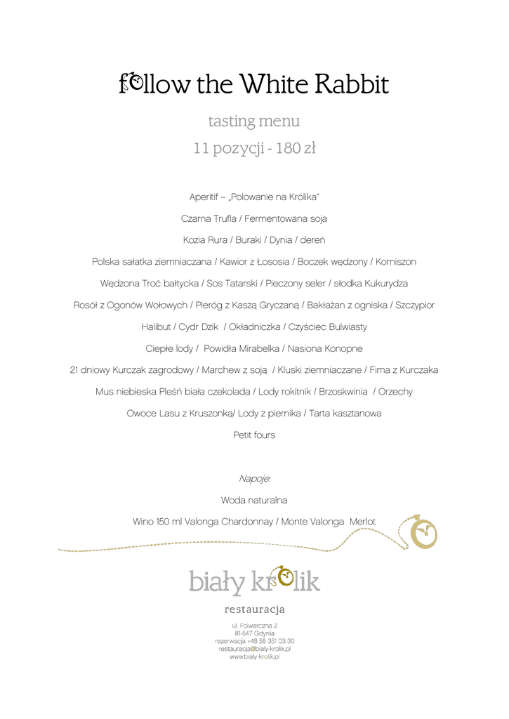 f#llow the White Rabbit tasting menu 11 pozycji - 180 zł Aperitif – „Polowanie na Królika” Czarna Trufla / Fermentowana soja Kozia Rura / Buraki / Dynia / dereń Polska sałatka ziemniaczana / Kawior z Łososia / Boczek wędzony / Korniszon Wędzona Troć bałtycka / Sos Tatarski / Pieczony seler / słodka Kukurydza Rosół z Ogonów Wołowych / Pieróg z Kaszą Gryczaną / Bakłażan z ogniska / Szczypior Halibut / Cydr Dzik / Okładniczka / Czyściec Bulwiasty Ciepłe lody / Powidła Mirabelka / Nasiona Konopne 21 dniowy Kurczak zagrodowy / Marchew z soją / Kluski ziemniaczane / Fima z Kurczaka Mus niebieska Pleśń biała czekolada / Lody rokitnik / Brzoskwinia / Orzechy Owoce Lasu z Kruszonką/ Lody z piernika / Tarta kasztanowa Petit fours Napoje: Woda naturalna Wino 150 ml Valonga Chardonnay / Monte Valonga Merlot