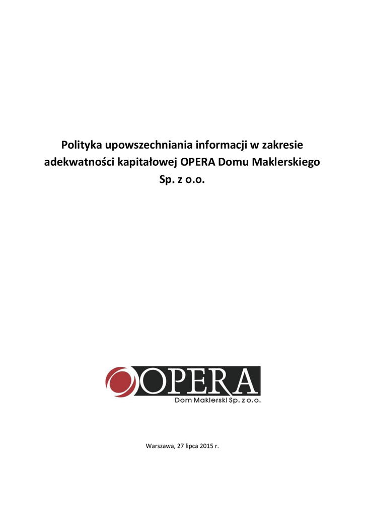 Polityka upowszechniania informacji w zakresie adekwatności kapitałowej OPERA Domu Maklerskiego Sp. z o.o. Warszawa, 27 lipca 2015 r. Spis treści 1. Postanowienia ogólne ..................................................................................................................... 1 2. Zakres upowszechnianych informacji .............................................................................................. 2 3. Forma i częstotliwość upowszechnianych informacji...................................................................... 2 4. Środki upowszechniania informacji ................................................................................................. 2 5. Zasady weryfikacji i zatwierdzania upowszechnianych informacji .................................................. 3 6. Zasady weryfikacji Polityki Informacyjnej........................................................................................ 3 7. Postanowienia końcowe .................................................................................................................. 3 1. Postanowienia ogólne 1.1. Niniejsza Polityka upowszechniania informacji w zakresie adekwatności kapitałowej OPERA Domu Maklerskiego Sp. z o.o., dalej: „Polityka Informacyjna”, określa zasady i zakres ujawniania informacji związanych z adekwatnością kapitałową w domu maklerskim w zgodzie z następującymi aktami prawnymi na poziomie krajowym oraz unijnym: rozporządzeniem Parlamentu Europejskiego i rady (UE) nr 575/2013 z dnia 26 czerwca 2013 roku w sprawie wymogów ostrożnościowych dla instytucji kredytowych i firm inwestycyjnych, zmieniającym rozporządzenie (UE) nr 648/2012, dalej: „Rozporządzenie CRR”, rozporządzeniem wykonawczym Komisji (UE) nr 1423/2013 z 20 grudnia 2013r. ustanawiającym standardy techniczne w zakresie wymogów dotyczących ujawniania informacji na temat funduszy własnych instytucji zgodnie z Rozporządzeniem CRR, rozporządzeniem Ministra Finansów z dnia 26 listopada 2009 r. w sprawie upowszechniania informacji związanych z adekwatnością kapitałową (Dz.U. Nr 210, poz. 1615 ze zm.), dalej: „Rozporządzenie o upowszechnianiu informacji”, rozporządzeniem Ministra Finansów z dnia 2 grudnia 2011 r. w sprawie zasad ustalania przez dom maklerski polityki zmiennych składników wynagrodzeń osób zajmujących stanowiska kierownicze (Dz.U. Nr 263 poz. 1569), ustawą z dnia 29 lipca 2005 r. o obrocie instrumentami finansowymi (t.j. Dz.U. z 2014 r., poz. 94 ze zm.), dalej: „Ustawa o obrocie”. 1.2. Za realizację obowiązków wynikających z Polityki Informacyjnej odpowiada Zarząd OPERA Domu Maklerskiego Sp. z o.o., dalej: „Dom Maklerski”. 1.3. Wszelkie zmiany do niniejszej Polityki Informacyjnej wymagają przyjęcia przez Zarząd Domu Maklerskiego w formie uchwały. 1 2. Zakres upowszechnianych informacji 2.1. Dom Maklerski upowszechnia informacje na temat adekwatności kapitałowej na podstawie danych w ujęciu skonsolidowanym w zakresie określonym w: części ósmej Rozporządzenia CRR, § 2a Załącznika nr 1 do Rozporządzenia o upowszechnianiu informacji. 2.2. W przypadku, gdy upowszechnienie informacji wymagane przepisami określonymi w ust. 2.1. może mieć niekorzystny wpływ na pozycję Domu Maklerskiego na rynku właściwym, w rozumieniu przepisów o ochronie konkurencji i konsumentów1, lub informację uznaje się za zastrzeżoną lub poufną Dom Maklerski podaje przyczynę odstąpienia od ogłoszenia takiej informacji oraz publikuje ogólną informację z tego zakresu nienaruszającą wyżej wymienionych warunków. 3. Forma i częstotliwość upowszechnianych informacji 3.1. Dom Maklerski publikuje informacje dotyczące adekwatności kapitałowej w formie odrębnego dokumentu raz w roku, jednak nie później niż w terminie 30 dni od zatwierdzenia rocznego sprawozdania finansowego przez uprawniony organ Domu Maklerskiego. 3.2. Dom Maklerski może częściej niż raz w roku upowszechnić informacje, które są istotne z uwagi na skalę i profil działalności prowadzonej przez Dom Maklerski, zakres działań poza granicami Rzeczypospolitej Polskiej, zaangażowanie w różnych sektorach finansowych, udział w międzynarodowych rynkach finansowych oraz systemach płatniczych, rachunkowych i rozliczeniowych. 4. Środki upowszechniania informacji 4.1. Informacje z zakresu adekwatności kapitałowej są upowszechniane na stronie internetowej Domu Maklerskiego (www.opera.pl). W przypadku gdy Dom Maklerski nie zamieszcza na stronie internetowej wszystkich informacji podlegających upowszechnieniu, wszystkie informacje podlegające upowszechnieniu podawane są do publicznej wiadomości w siedzibie Domu Maklerskiego: Rondo ONZ 1, 00-124 Warszawa. 4.2. Informacje upowszechniane są w języku polskim. 4.3. W przypadku niezamieszczenia wszystkich informacji podlegających upowszechnieniu na stronie internetowej, Dom Maklerski zamieszcza w tym miejscu adnotację o brakujących informacjach, wskazując w niej siedzibę Domu Maklerskiego jako miejsce, w którym te informacje podlegają ujawnieniu. 1 Zgodnie z art. 4 pkt 9) ustawy z dnia 16 lutego 2007 r. o ochronie konkurencji i konsumentów (t.j. Dz. U. z 2015 r., poz. 184 ze zm.) rynkiem właściwym uznaje się rynek towarów, które ze względu na ich przeznaczenie, cenę oraz właściwości, w tym jakość, są uznawane przez ich nabywców za substytuty oraz są oferowane na obszarze, na którym, ze względu na ich rodzaj i właściwości, istnienie barier dostępu do rynku, preferencje konsumentów, znaczące różnice cen i koszty transportu, panują zbliżone warunki konkurencji. 2 5. Zasady weryfikacji i zatwierdzania upowszechnianych informacji 5.1. Informacje w zakresie adekwatności kapitałowej upowszechniane przez Dom Maklerski są przygotowywane na podstawie sprawozdań finansowych Domu Maklerskiego objętych badaniem przez biegłego rewidenta. 5.2. W przypadku upowszechnianych przez Dom Maklerski