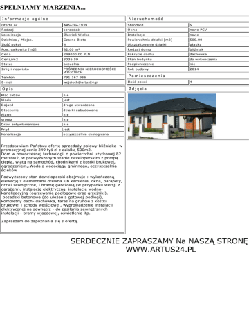 SPEŁNIAMY MARZENIA... Informacje ogólne Nieruchomość Oferta nr ARS-DS-1939 Standard 5 Rodzaj sprzedaż Okna nowe PCV Lokalizacja Zławieś Wielka Instalacje nowe Dzielnica / Miejsc. Czarne Błoto Powierzchnia działki [m2] 500.00 Ilość pokoi 4 Ukształtowanie działki płaska Pow. całkowita [m2] 82.00 m² Rodzaj domu bliźniak Cena 249000.00 PLN Pokrycie dachu dachówka Cena/m2 3036.59 Stan budynku do wykończenia Status aktualna Podpiwniczenie nie Imię i nazwisko POŚREDNIK NIERUCHOMOŚCI WOJCIECH Rok budowy 2014 Telefon 791 167 956 Pomieszczenia E-mail [email protected] Ilość pokoi 4 Zdjęcia Opis Plac zabaw nie Woda jest Dojazd droga utwardzona Otoczenie działki zabudowane Alarm nie Winda nie Drzwi antywłamaniowe nie Prąd jest Kanalizacja oczyszczalnia ekologiczna Przedstawiam Państwu ofertę sprzedaży połowy bliźniaka w promocyjnej cenie 249 tyś zł z działką 500m2. Dom w nowoczesnej technologii o powierzchni użytkowej 82 metrów2, w podwyższonym stanie developerskim z pompą ciepła, wiatą na samochód, chodnikami z kostki brukowej, ogrodzeniem,.Woda z wodociągu gminnego, oczyszczalnia ścieków Podwyższony stan deweloperski obejmuje : wykończoną elewację z elementami drewna lub kamienia, okna, parapety, drzwi zewnętrzne, i bramę garażową (w przypadku wersji z garażem), instalację elektryczną, instalację wodnokanalizacyjną (ogrzewanie podłogowe oraz grzejniki), posadzki betonowe (do ułożenia gotowej podłogi), kompletny dach- dachówka, taras na gruncie z kostki brukowej i schody wejściowe , wyprowadzenie instalacji elektrycznej na zewnątrz - do zasilania zewnętrznych instalacji - bramy wjazdowej, oświetlenia itp. Zapraszam do zapoznania się s ofertą. SERDECZNIE ZAPRASZAMY Na NASZĄ STRONĘ WWW.ARTUS24.PL