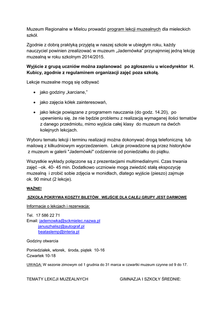 Muzeum Regionalne w Mielcu prowadzi program lekcji muzealnych dla mieleckich szkół. Zgodnie z dobrą praktyką przyjętą w naszej szkole w ubiegłym roku, każdy nauczyciel powinien zrealizować w muzeum „Jadernówka” przynajmniej jedną lekcję muzealną w roku szkolnym 2014/2015. Wyjście z grupą uczniów można zaplanować po zgłoszeniu u wicedyrektor H. Kubicy, zgodnie z regulaminem organizacji zajęć poza szkołą. Lekcje muzealne mogą się odbywać jako godziny „karciane,” jako zajęcia kółek zainteresowań, jako lekcje powiązane z programem nauczania (do godz. 14.20), po upewnieniu się, że nie będzie problemu z realizacją wymaganej ilości tematów z danego przedmiotu, mimo wyjścia całej klasy do muzeum na dwóch kolejnych lekcjach. Wyboru tematu lekcji i terminu realizacji można dokonywać drogą telefoniczną lub mailową z kilkudniowym wyprzedzeniem. Lekcje prowadzone są przez historyków z muzeum w galerii "Jadernówki" codziennie od poniedziałku do piątku. Wszystkie wykłady połączone są z prezentacjami multimedialnymi. Czas trwania zajęć –ok. 40- 45 min. Dodatkowo uczniowie mogą zwiedzić stałą ekspozycję muzealną i zrobić sobie zdjęcia w monidłach, dlatego wyjście (pieszo) zajmuje ok. 90 minut (2 lekcje). WAŻNE! SZKOŁA POKRYWA KOSZTY BILETÓW. WEJŚCIE DLA CAŁEJ GRUPY JEST DARMOWE Informacje o lekcjach i rezerwacja: Tel. 17 586 22 71 Email: [email protected] [email protected] [email protected] Godziny otwarcia Poniedziałek, wtorek, środa, piątek 10-16 Czwartek 10-18 UWAGA: W sezonie zimowym od 1 grudnia do 31 marca w czwartki muzeum czynne od 9 do 17. TEMATY LEKCJI MUZEALNYCH GIMNAZJA I SZKOŁY ŚREDNIE: I. Zagadnienia z historii Polski i historii regionalnej: (na przykład: lekcje historii, wosu, plastyki, godziny wychowawcze) 1.Mielec - lokacja miasta i pierwsze lata "miejskości". 2.Z historii mieleckiego szkolnictwa. 3.Gimnazjum w Mielcu - utworzenie i pierwsze lata działalności. 4.Dawna architektura miejska w obiektywie Jadernych, 5.Dworki i pałace regionu mieleckiego - architektura, otoczenie i mieszkańcy. 6.Mieleckie tradycje lotnicze w I połowie XX wieku. 7.Odzyskanie przez Polskę niepodległości i jej obrona w latach 1918-1921. 8.Centralny Okręg Przemysłowy - założenia projektu i miejsce Mielca w strukturze COP-u. 9.Codzienność PRL okiem fotografa z komentarzem historyka. II. Zagadnienia społeczno-obyczajowe, historia sztuki, nauka i technika: (na przykład: lekcje biblioteczne, języka polskiego, religii, biologii, fizyki, chemii, techniki, wych. fizycznego, plastyki, historii, wosu, wdż, godziny wychowawcze) 1.Genealogia dla każdego - poznaj korzenie swojej rodziny. 2.Kobieta na przełomie XIX i XX wieku - moda, styl życia i pozycja społeczna. 3.Postęp techniczny na przykładzie rozwoju fotografii. 4.XIX stulecie - wiek pary, elektryczności i nie tylko... 5.Historia ciała. 6.Dawne wnętrza. 7.Ginące zawody. 8.Zegar - historia pomiaru czasu. 9.Książka dawniej i dziś. 10.Stroje minionych epok. 11.Kultura osobliwości. 12.Kolekcjonerstwo i powstawanie pierwszych muzeów. 13.Wynalazki w drodze do kina... 14.Sztuka ogrodowa. 15.Anioły w sztuce. 16.Konserwacja mebli. 17.Krzyż - różne warianty i symbolika. 18.Kościół katolicki a prawosławny - symbolika architektury sakralnej. 19.Historia koloru. 20.Rodzina na przestrzeni wieków. 21.Zwyczaje świąteczne. 22.Historia sztuki - przegląd okresów: o o o o o o sztuka prehistoryczna sztuka starożytna(Egipt, Grecja, Rzym) sztuka wczesnochrześcijańska sztuka bizantyjska sztuka średniowiecza (romańska i gotycka) sztuka nowożytna (renesans, manieryzm, barok, rokoko, klasycyzm, romantyzm, historyzm, eklektyzm) o sztuka II połowy XIX w. (akademizm, szkoła Barbizon, realizm, symbolizm, postimpresjonizm, neoimpresjonizm) o sztuka nowoczesna o sztuka współczesna. ZAPRASZAMY