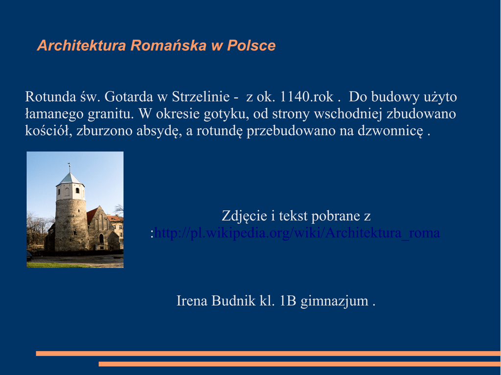 Architektura Romańska w Polsce Rotunda św. Gotarda w Strzelinie - z ok. 1140.rok . Do budowy użyto łamanego granitu. W okresie gotyku, od strony wschodniej zbudowano kościół, zburzono absydę, a rotundę przebudowano na dzwonnicę . Zdjęcie i tekst pobrane z :http://pl.wikipedia.org/wiki/Architektura_roma Irena Budnik kl. 1B gimnazjum .
