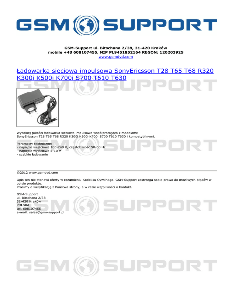 GSM-Support ul. Bitschana 2/38, 31-420 Kraków mobile +48 608107455, NIP PL9451852164 REGON: 120203925 www.gsmdvd.com Ładowarka sieciowa impulsowa SonyEricsson T28 T65 T68 R320 K300i K500i K700i S700 T610 T630 Wysokiej jakości ładowarka sieciowa impulsowa współpracująca z modelami: SonyEricsson T28 T65 T68 R320 K300i K500i K700i S700 T610 T630 i kompatybilnymi. Parametry techniczne: - napięcie wejściowe 100-240 V, częstotliwość 50-60 Hz - napięcie wyjściowe 5-10 V - szybkie ładowanie ©2012 www.gsmdvd.com Opis ten nie stanowi oferty w rozumieniu Kodeksu Cywilnego. GSM-Support zastrzega sobie prawo do możliwych błędów w opisie produktu. Prosimy o weryfikację z Państwa strony, a w razie wątpliwości o kontakt. GSM-Support ul. Bitschana 2/38 31-420 Kraków POLSKA tel. 608107455 e-mail: [email protected] Powered by TCPDF (www.tcpdf.org)