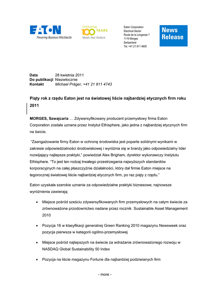 Eaton Corporation Electrical Sector Route de la Longeraie 7 1110 Morges Switzerland Tel. +41 21 811 4600 28 kwietnia 2011 Data Do publikacji Niezwłocznie Michael Präger, +41 21 811 4743 Kontakt Piąty rok z rzędu Eaton jest na światowej liście najbardziej etycznych firm roku 2011 MORGES, Szwajcaria … Zdywersyfikowany producent przemysłowy firma Eaton Corporation została uznana przez Instytut Ethisphere, jako jedna z najbardziej etycznych firm na świcie. “Zaangażowanie firmy Eaton w ochronę środowiska jest poparte solidnymi wynikami w zakresie odpowiedzialności środowiskowej i wyróżnia się w branży jako odpowiedzialny lider rozwijający najlepsze praktyki,” powiedział Alex Brigham, dyrektor wykonawczy Instytutu Ethisphere. “To jest ten rodzaj trwałego przestrzegania najwyższych standardów korporacyjnych na całej płaszczyźnie działalności, który dał firmie Eaton miejsce na tegorocznej światowej liście najbardziej etycznych firm, po raz piąty z rzędu.” Eaton uzyskała szerokie uznanie za odpowiedzialne praktyki biznesowe; najnowsze wyróżnienia zawierają: Miejsce pośród sześciu zdywersyfikowanych firm przemysłowych na całym świecie za zrównoważone przodownictwo nadane przez rocznik Sustainable Asset Management 2010 Pozycja 16 w klasyfikacji generalnej Green Ranking 2010 magazynu Newsweek oraz pozycja pierwsza w kategorii ogólno-przemysłowej Miejsce pośród najlepszych na świecie za wdrażanie zrównoważonego rozwoju w NASDAQ Global Sustainability 50 Index Pozycja na liście magazynu Fortune dla najbardziej podziwianych firm - more - Eaton/Page 2 Uznana po raz piąty z rzędu przez Corporate Responsibility Officer Magazine pośród 100 najlepszych obywateli korporacyjnych Cytowana w chińskim magazynie Business Watch w zestawieniu Green Company Top 10 oraz Fast Company Top 100 „Jesteśmy dumni z uznania przez Ethisphere naszego zaangażowania w wartości etyczne, które wyróżniają nas jako firmę,” powiedziała Deborah Severs, wiceprezydent – Globalna Etyka i Zasady, Eaton. „Eaton koncentruje się na prowadzeniu biznesu sprawiedliwie poprzez działania, które zawierają najwyższe standardy uczciwości i prawości.” Aby wyłonić zwycięzców Ethisphere zrecenzowała tysiące nominacji pośród firm z ponad 100 krajów oraz 36 gałęzi przemysłu. Proces badawczy i selekcji zawierał przegląd kodeksów etycznych firm, historie sądowe i wykroczeń regulacyjnych, oceny inwestycji w innowacje i zrównoważone praktyki biznesowe, patrząc na działania zmierzające do poprawy obywatelstwa korporacyjnego oraz studiując nominacje kierownictwa wyższego szczebla, partnerów przemysłowych, dostawców i klientów. Więcej informacji na temat Instytutu Ethisphere jest dostępna na www.ethisphere.com. Eaton Corporation jest zdywersyfikowaną firmą specjalizującą się w zarządzaniu energią, ze sprzedażą 13,7 mld $ w 2010. Celebrując swoją 100 rocznicę w roku 2011, Eaton jest globalnym liderem w zakresie komponentów i systemów jakości zasilania, rozdziału i sterowania; podzespołów hydraulicznych, systemów i usług dotyczących urządzeń przemysłowych i mobilnych, systemów paliwowych, hydraulicznych i pneumatycznych dla lotnictwa i kosmonautyki cywilnej i militarnej, systemów napędów samochodów osobowych i ciężarowych w zakresie eksploatacji, zużycia paliwa i bezpieczeństwa. Eaton zatrudnia około 70 000 pracowników i sprzedaje produkty dla klientów w ponad 150 krajach. Więcej informacji znajduje się na stronie www.eaton.com. ###