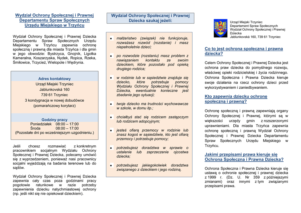 Wydział Ochrony Społecznej i Prawnej Departamentu Spraw Społecznych Urzędu Miejskiego w Trzyńcu Wydział Ochrony Społecznej i Prawnej Dziecka szukaj jeżeli: Wydział Ochrony Społecznej i Prawnej Dziecka Departamentu Spraw Społecznych Urzędu Miejskiego w Trzyńcu zapewnia ochronę społeczną i prawną dla miasta Trzyńca i dla gmin w jego obwodzie: Bystrzyca, Gnojnik, Ligotka Kameralna, Koszarzyska, Nydek, Ropica, Rzeka, Śmiłowice, Trzycież, Wielopole i Wędrynia. małżeństwo (związek) nie funkcjonuje, rozważasz rozwód (rozstanie) i masz niepełnoletnie dzieci; Adres kontaktowy Urząd Miejski Trzyniec Jablunkovská 160 739 61 Trzyniec 3 kondygnacja w nowej dobudówce (pomarańczowy korytarz) w rodzinie lub w sąsiedztwie znajduje się dziecko, które potrzebuje pomocy Wydziału Ochrony Społecznej i Prawnej Dziecka, ewentualnie konieczne jest zbadanie jego sytuacji; Godziny pracy Poniedziałek 08:00 – 17:00 Środa 08:00 – 17:00 (Pozostałe dni po wcześniejszym uzgodnieniu.) Jeśli chcesz rozmawiać z konkretnym pracownikiem socjalnym Wydziału Ochrony Społecznej i Prawnej Dziecka, polecamy umówić się z wyprzedzeniem, ponieważ nasi pracownicy socjalni wyjeżdzają na badania terenowe lub do sądów. Wydział Ochrony Społecznej i Prawnej Dziecka zapewnia cały czas poza godzinami pracy pogotowie ratunkowe w razie potrzeby zapewnienia dziecku natychmiastowej ochrony (np. jeśli nikt się nie opiekował dzieckiem). po rozwodzie (rozstaniu) masz problem z nawiązaniem kontaktu ze swoim dzieckiem, które pozostało pod opieką drugiego rodzica; twoje dziecko ma trudności wychowawcze w szkole, w domu itp.; chciałbyś stać się rodzicem zastępczym lub rodzicem adopcyjnym; jesteś ofiarą przemocy w rodzinie lub znasz kogoś w sąsiedztwie, kto jest ofiarą przemocy i potrzebuje pomocy; potrzebujesz doradztwa w sprawie o ustalenie lub zaprzeczenie ojcostwa dziecka; potrzebujesz jakiegokolwiek doradztwa związanego z dzieckiem i jego rodziną. Urząd Miejski Trzyniec Departament Spraw Społecznych Wydział Ochrony Społecznej i Prawnej Dziecka Jablunkovská 160, 739 61 Trzyniec Co to jest ochrona społeczna i prawna dziecka? Celem Ochrony Społecznej i Prawnej Dziecka jest ochrona praw dziecka do pomyślnego rozwoju, właściwej opieki rodzicielskiej i życia rodzinnego. Ochrona Społeczna i Prawna Dziecka kieruje swoje działania na rzecz ochrony dzieci przed wykorzystywaniem i zaniedbywaniem. Kto zapewnia dziecku ochronę społeczną i prawną? Ochronę społeczną i prawną zapewniają organy Ochrony Społecznej i Prawnej, którymi są w większości urzędy gmin z rozszerzonymi uprawnieniami. Dla miasta Trzyńca zapewnia ochronę społeczną i prawną Wydział Ochrony Społecznej i Prawnej Dziecka Departamentu Spraw Społecznych Urzędu Miejskiego w Trzyńcu. Jakimi przepisami prawa kieruje się Ochrona Społeczna i Prawna Dziecka? Ochrona Społeczna i Prawna Dziecka kieruje się ustawą o ochronie społecznej i prawnej dziecka z 1999 r. (Dz. U. Nr 359 z późniejszymi zmianami) oraz innymi z tym związanymi przepisami prawa. Prace socjalne w Wydziale Ochrony Społecznej i Prawnej Dziecka Pracownicy socjalni Wydziału Ochrony Społecznej i Prawnej Dziecka: pełnią funkcję opiekuna dzieci niepełnoletnich na rozprawach sądowych dotyczących praw dzieci (powierzenie dzieci pod opiekę jednego z rodziców przy rozwodzie, ustalenia i zmiany alimentów itp.) nadzorują rodziny, które z różnych powodów samodzielnie nie zapewniają jakościowej opieki i wychowania dzieci sprawują nadzór nad rodziną, nad którą został ustanowiony nadzór przez sąd lub inny organ udzielają fachowego doradztwa w zakresie ochrony społecznej i prawnej dzieci i inne są pośrednikami usług doradztwa, mediacji i innych usług Kontakty do pracowników socjalnych Luciána Heczková, DiS. 558 306 334, [email protected] Mgr. Martina Kajzarová 558 306 329, [email protected] Mgr. Kateřina Křehulová 558 306 353, [email protected] Mgr. Lucie Kubikova 558 306 342, [email protected] Bc. Eva Plucnarová 558 306 340, [email protected] Taťána Pryčková 558 306 345, [email protected] Mgr. Karina Szczotková 558 306 348, [email protected] Prace socjalne w Oddziale Rodzinnej Opieki Zastępczej Wydziału Ochrony Społecznej i Prawnej Dziecka Pracownicy socjalni w Oddziale Rodzinnej Opieki Zastępczej: przyjmują wnioski o przysposobienie (adopcję), ustanowienie rodziny zastępczej, ustanowienie tymczasowej rodziny zastępczej, ustanowienie opiekuna prawnego udzielają doradztwa w zakresie rodzinnej opieki zastępczej współpracują z rodzicami zastępczymi i opiekunami prawnymi nadzorują prawidłowy rozwój dzieci umieszczonych w rodzinie zastępczej i pod opieką opiekuna prawnego i inne wykonują czynności związane z zawartymi umowami o pełnienie funkcji rodziny zastępczej są pośrednikami usług organizacji uprawnionych do sprawowania ochrony społecznej i prawnej Kontakty do pracowników socjalnych Oddziału Rodzinnej Opieki Zastępczej Bc. Kristina Hahnová 558 306 341, [email protected] Lucie Sikorová, DiS. 558 306 346, [email protected] Prace socjalne w Oddziale Kuratorów dla Nieletnich Pracownicy socjalni w Oddziale Kuratorów dla Nieletnich: pracują z dziećmi i nieletnimi z poważnymi problemami behawioralnymi, którzy zaniedbują obowiązki szkolne, używają alkoholu lub innych środków uzależniających, popełniają przestępstwa, prowadzą życie bezczynne itp. uczestniczą w postępowaniu karnym i wykroczeniowym prowadzonym przeciwko nieletnim, pełnią funkcję opiekuna nieletniego w postępowaniach karnych i wykroczeniowych udzielają również fachowego doradztwa w zakresie zaburzeń zachowania u dzieci i nieletnich osobom odpowiedzialnym za ich wychowanie i inne Kontakty do pracowników socjalnych Oddziału Kuratorów dla Nieletnich Mgr. Martina Běhálková 558 306 333, [email protected] Bc. Zuzana Kubiesová 558 306 343, [email protected] Kontakty do k