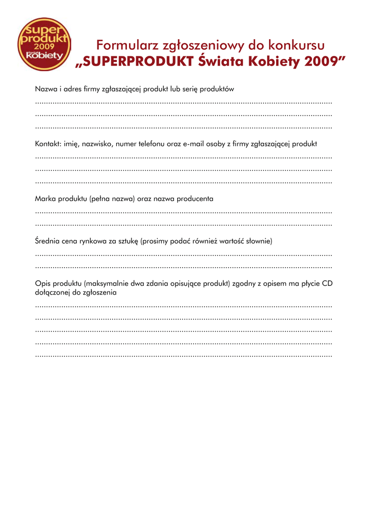 Formularz zgłoszeniowy do konkursu „SUPERPRODUKT Świata Kobiety 2009” Nazwa i adres firmy zgłaszającej produkt lub serię produktów ........................................................................................................................................ ........................................................................................................................................ ........................................................................................................................................ Kontakt: imię, nazwisko, numer telefonu oraz e-mail osoby z firmy zgłaszającej produkt ........................................................................................................................................ ........................................................................................................................................ ........................................................................................................................................ Marka produktu (pełna nazwa) oraz nazwa producenta ........................................................................................................................................ ........................................................................................................................................ Średnia cena rynkowa za sztukę (prosimy podać również wartość słownie) ........................................................................................................................................ ........................................................................................................................................ Opis produktu (maksymalnie dwa zdania opisujące produkt) zgodny z opisem ma płycie CD dołączonej do zgłoszenia ........................................................................................................................................ ........................................................................................................................................ ........................................................................................................................................ ........................................................................................................................................ ........................................................................................................................................ Nazwa kategorii: (prosimy o wpisanie nazwy zgłaszanego produktu w miejscu właściwej kategorii lub podkategorii) 1.Kosmetyki Nazwa podkategorii: Włosy Ciało Makijaż Pielęgnacja twarzy Apteczne – pielęgnacja ciała Apteczne – pielęgnacja twarzy Zapachy Dla mężczyzn 2. Artykuły higieniczne 3. Żywność Nazwa podkategorii: Dania do szybkiego przygotowania Produkty gotowe Dodatki i przyprawy Napoje Produkty dietetyczne Słodycze Żywność dla zwierząt 4. Leki OTC Nazwa podkategorii: Przeciwbólowe Na przeziębienie Preparaty witaminowe Nutrikosmetyki 5. Dom Nazwa podkategorii: Chemia gospodarcza Drobny sprzęt AGD do domu Drobny sprzęt AGD do użytku osobistego / dla urody Prosimy o podanie imienia, nazwiska, telefonu kontaktowego, e-mail oraz adresu korespondencyjnego dla maksymalnie dwóch przedstawicieli firmy, do których zostaną wysłane zaproszenia na uroczystą Galę, która odbędzie się w styczniu 2010 roku w Warszawie. Powinny to być osoby upoważnione przez zgłaszającą firmę do odbioru ewentualnej nagrody w konkursie SUPERPRODUKT 2009. 1. .................................................................................................................................... ........................................................................................................................................ ........................................................................................................................................ 2. .................................................................................................................................... ........................................................................................................................................ ........................................................................................................................................ Wypełniony formularz wraz z produktami prosimy przesłać na: Magdalena Żelazowska Wydawnictwa Bauer Sp. z o.o., Sp.k. Dział Marketingu ul. Motorowa 1 04-035 Warszawa KONTAKT Magdalena Żelazowska tel. (0 22) 51 70 512 fax: (0 22) 51 70 363 e-mail: [email protected] Na zgłoszenia czekamy do dnia 30 września 2009 roku.