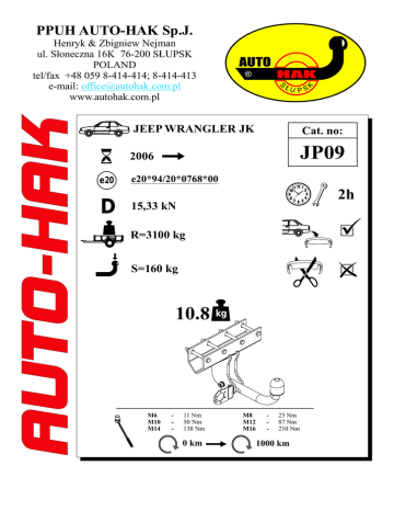 PPUH AUTO-HAK Sp.J. Henryk & Zbigniew Nejman ul. Słoneczna 16K 76-200 SŁUPSK POLAND tel/fax +48 059 8-414-414; 8-414-413 e-mail: [email protected] www.autohak.com.pl AUTO HAK ® JEEP WRANGLER JK JP09 2006 e 20 D e20*94/20*0768*00 2h 15,33 kN R=3100 kg S=160 kg 10.8 kg M6 M10 M14 - 11 Nm 50 Nm 138 Nm 0 km M8 M12 M16 - 25 Nm 87 Nm 210 Nm 1000 km OD PRODUCENTA: PL Dziękujemy za wybór produkowanego przez naszą firmę zaczepu kulowego. Jego niezawodność została potwierdzona licznymi testami oraz opiniami zadowolonych klientów. Jednakże niezawodność zaczepów kulowych jest zależna również od prawidłowego montażu oraz prawidłowej eksploatacji. Z tego powodu prosimy Państwa o staranne przeczytanie niniejszej instrukcji montażu oraz przestrzeganie właściwych wskazówek. Zaczep należy zamontować w miejscach do tego celu przeznaczonych przez producenta samochodu. FROM MANUFACTURER: GB Thank you for buying our product. Their reliability has been confirmed in many tests. Reliability of towbar depends also on correct assembly and right operation. For this reasons we kindly ask to read carefully this instruction and apply to hints. The towbar should be install in points described by a car producer. VON DEM HERSTELLER: D Die Zuverlässigkeit der Anhängekupplung ist jedoch auch von der ordnungsgemäßen Montage und der richtigen Nutzung abhängig. Daher werden Sie gebeten, sorgfältig die folgende Montageanleitung zu lesen und sich an die entsprechenden Anweisungen zu halten. Die Anhängekupplung muss an den vom Fahrzeughersteller vorgeschriebenen Befestigungsstellen montiert werden. DE LA PART DU FABRICANT: F Merci d'avoir choisi le dispositif d'attelage à boule produit par notre société. Son fiabilité a été confirmée dans de nombreux tests et par les opinions des clients satisfaits. Toutefois, la fiabilité des dispositifs d'attelage à boule dépend aussi d'installation et d'exploitation correcte. Pour cette raison, nous vous demandons de lire attentivement cette instruction de montage et de respecter les conseils. Le dispositif d'attelage à boule doit être monté dans des emplacements prévus a ce but par le fabricant de voiture. FRA PRODUCENTEN: DK Tak fordi De har valgt vores anhængertræk. Dets pålidelighed er blevet bekræftet i mange undersøgelser samt af tilfredse kunder. Vores anhængertræks pålidelighed er også afhængig af korrekt montering og korrekt betjening. Af denne grund beder vi Dem at læse denne instruktion grundigt og overholde de korrekte anvisninger. DE PRODUCTOR: E Gracias por la elección del enganche de bola producido por nuestra empresa. Su fiabilidad fue confirmada por numerosos testos y opiniones de los clientes quienes estuvieron contentos. Sin embargo la fiabilidad de enganche de bola depende también de un montaje adecuado y su explotación adecuada. Por esa causa por favor leer atentamente la instrucción del montaje y observar adecuadas indicadoras. VAN DE FABRIKANT: NL Bedankt voor de aanschaf van onze kogeltrekhaak. Hoe betrouwbaar die is blijkt wel uit vele tests en meningen van tevreden klanten. Toch is de betrouwbaarheid van een kogeltrekhaak er mede van afhankelijk dat deze correct gemonteerd is en op de juiste manier wordt gebruikt. Daarom wordt u verzocht deze montagehandleiding zorgvuldig te lezen en de aanwijzingen te volgen. FRA PRODUSENTEN: N Takk for at dere har valgt kulefestet produsert av vårt firma. Driftssikkerheten på kulefestet har blitt bekreftet av flere tester og tilbakemeldinger fra fornøyde kunder. Allikevel er driftssikkerheten også avhengig av en korrekt montering og riktig bruk. Derfor ber vi dere om å lese denne monteringsinstruksen nøye og anbefaler at dere følger veiledningen. ETT BUDSKAP FRÅN TILLVERKAREN: S Vi skulle vilja tacka er för ert val och inköp. Våra dragkrokars pålitlighet har bevisats av olika tester samt referenser från nöjda kunder. Man får inte glömma att dragkrokars pålitlighet beror också på rätt installation och rätt bruk. Därför skulle vi vilja be att ni läser noga denna installationsanvisning och följer alla regler och tips som den anger. Dragkroken ska installeras i ett ställe som blivit påpekade av biltillverkaren. DAL FABBRICANTE: IT -2- Vi ringraziamo per aver scelto il gancio di traino a sfera prodotto dalla nostra azienda. La sua affidabilità è stata confermata da numerosi test e dalle opinioni positive dei clienti. Tuttavia, il perfetto funzionamento dei ganci di traino a sfera dipende anche dalla correttezza del montaggio e dall'utilizzo appropriato. Per questo motivo, Vi preghiamo di leggere attentamente le presenti istruzioni di montaggio e di attenervi alle indicazioni in esse contenute. Il gancio di traino deve essere montato nei punti predisposti a tal fine dal fabbricante del veicolo. PL GB D F Należy zagwarantować przestrzeń swobodną według załącznika VII, ilustracja 30 wytycznej 94/20/WE przy dopuszczalnym ciężarze całkowitym pojazdu. The clearance specified in appendix VII, diagram 30 of guideline 94/20/EC must be guaranteed at laden weight of the vehicle. Der Freiraum nach Anhang VII,Abbildung 30 der Richtlinie94/20/EG ist zu gewährleistenbei zulässigem Gesamtgewichtdes Fahrzeuges. L’ e s p a c e l i b r e d o i t ê t r e garanticonformément à l’annexe VII,illustration 30 de la directive94/20/CE pour poids total encharge autorisé du véhicule. A-A DK I overensstemmelse med bilag VII, figur 30 til retningslinie 94/20/EF for køretøjets tilladte totalvægt skal der garanteres en friplads. E Hay que garantizar un espacio suelto según archivo adjunto VII, ilustración 30 trazado 94/20/WE de peso admisible y total del vehículo. NL N Det skal sørges for fritt rom ifølge vedlegget VII, illustrasjon 30 retningslinjen 94/20/WE ved den tillatte totale vekten av fartøyet. S Man ska garantera ett fritt tillgängligt utrymme - se bilaga VII, diagram 30 enligt riktlinjer 94/20/WE vid ett fordons maximala belastning. IT B