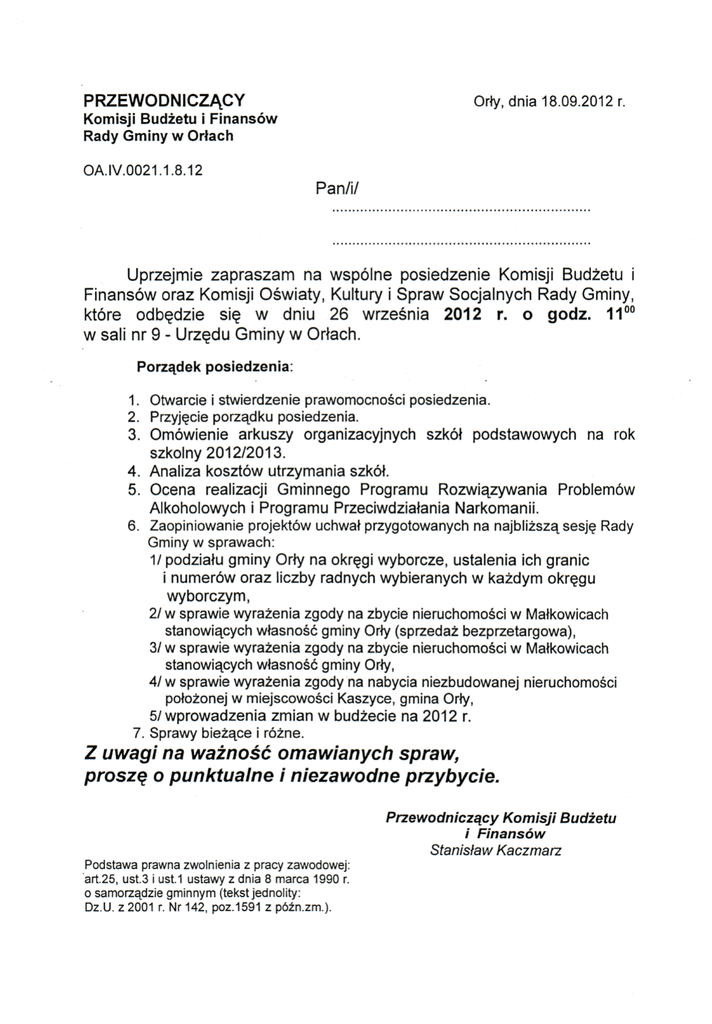 PRZEWODNICZĄCY Komisji Budżetu i Finansów Rady Gminy w Orłach Orły, dnia 18.09.2012 r. OA.IV.0021.1.8.12 Pan/i/ Uprzejmie zapraszam na wspólne posiedzenie Komisji Budżetu i Finansów oraz Komisji Oświaty, Kultury i Spraw Socjalnych Rady Gminy, które odbędzie się w dniu 26 września 2012 r. o godz. 11 °° w sali nr 9 - Urzędu Gminy w Orłach. Porządek posiedzenia: 1. Otwarcie i stwierdzenie prawomocności posiedzenia. 2. Przyjęcie porządku posiedzenia. 3. Omówienie arkuszy organizacyjnych szkół podstawowych na rok szkolny 2012/2013. 4. Analiza kosztów utrzymania szkół. 5. Ocena realizacji Gminnego Programu Rozwiązywania Problemów Alkoholowych i Programu Przeciwdziałania Narkomanii. 6. Zaopiniowanie projektów uchwał przygotowanych na najbliższą sesję Rady Gminy w sprawach: 1/ podziału gminy Orły na okręgi wyborcze, ustalenia ich granic i numerów oraz liczby radnych wybieranych w każdym okręgu wyborczym, 21 w sprawie wyrażenia zgody na zbycie nieruchomości w Małkowicach stanowiących własność gminy Orły (sprzedaż bezprzetargowa), 3/ w sprawie wyrażenia zgody na zbycie nieruchomości w Małkowicach stanowiących własność gminy Orły, 4/w sprawie wyrażenia zgody na nabycia niezbudowanej nieruchomości położonej w miejscowości Kaszyce, gmina Orły, 5/wprowadzenia zmian w budżecie na 2012 r. 7. Sprawy bieżące i różne. Z uwagi na ważność omawianych spraw, proszę o punktualne i niezawodne przybycie. Podstawa prawna zwolnienia z pracy zawodowej: art.25, ust.3 i ust.1 ustawy z dnia 8 marca 1990 r. o samorządzie gminnym (tekst jednolity: Dz.U. z 2001 r. Nr 142, poz.1591 z późn.zm.). Przewodniczący Komisji Budżetu i Finansów Stanisław Kaczmarz
