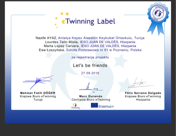 Nazife AYAZ, Antalya Kepez Alaeddin Keykubat Ortaokulu, Turcja Lourdes Tello Miota, IESO JUAN DE VALDÉS, Hiszpania Marta López Cervera, IESO JUAN DE VALDÉS, Hiszpania Ewa Łoszyńska, Szkoła Podstawowa nr 61 w Poznaniu, Polska za rejestrację projektu Let's be friends 27.09.2016 Mehmet Fatih DÖĞER Krajowe Biuro eTwinning Turcja Marc Durando Centralne Biuro eTwinning Félix Serrano Delgado Krajowe Biuro eTwinning Hiszpania
