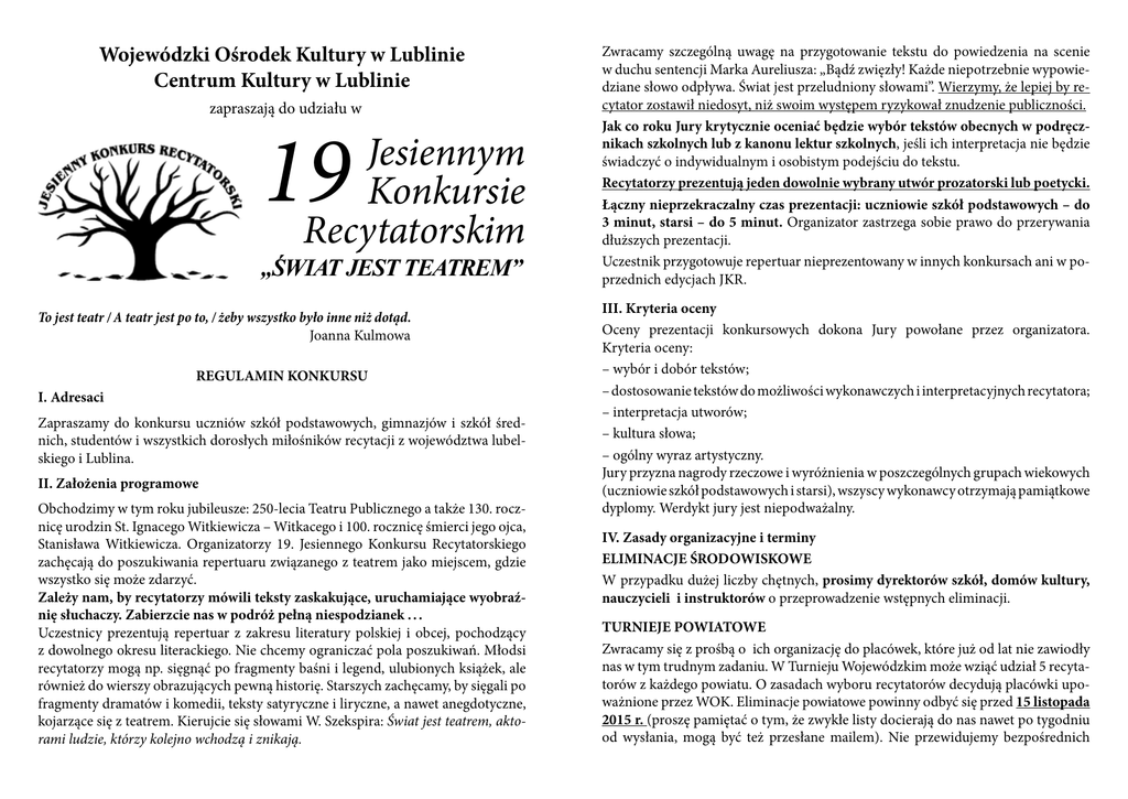 Wojewódzki Ośrodek Kultury w Lublinie Centrum Kultury w Lublinie zapraszają do udziału w 19 Jesiennym Konkursie Recytatorskim Äĝ:,$7-(677($75(0´ To jest teatr / A teatr jest po to, / żeby wszystko było inne niż dotąd. Joanna Kulmowa REGULAMIN KONKURSU I. Adresaci Zapraszamy do konkursu uczniów szkół podstawowych, gimnazjów i szkół średnich, studentów i wszystkich dorosłych miłośników recytacji z województwa lubelskiego i Lublina. II. Założenia programowe Obchodzimy w tym roku jubileusze: 250-lecia Teatru Publicznego a także 130. rocznicę urodzin St. Ignacego Witkiewicza – Witkacego i 100. rocznicę śmierci jego ojca, Stanisława Witkiewicza. Organizatorzy 19. Jesiennego Konkursu Recytatorskiego zachęcają do poszukiwania repertuaru związanego z teatrem jako miejscem, gdzie wszystko się może zdarzyć. Zależy nam, by recytatorzy mówili teksty zaskakujące, uruchamiające wyobraźnię słuchaczy. Zabierzcie nas w podróż pełną niespodzianek . . . Uczestnicy prezentują repertuar z zakresu literatury polskiej i obcej, pochodzący z dowolnego okresu literackiego. Nie chcemy ograniczać pola poszukiwań. Młodsi recytatorzy mogą np. sięgnąć po fragmenty baśni i legend, ulubionych książek, ale również do wierszy obrazujących pewną historię. Starszych zachęcamy, by sięgali po fragmenty dramatów i komedii, teksty satyryczne i liryczne, a nawet anegdotyczne, kojarzące się z teatrem. Kierujcie się słowami W. Szekspira: Świat jest teatrem, aktorami ludzie, którzy kolejno wchodzą i znikają. Zwracamy szczególną uwagę na przygotowanie tekstu do powiedzenia na scenie w duchu sentencji Marka Aureliusza: „Bądź zwięzły! Każde niepotrzebnie wypowiedziane słowo odpływa. Świat jest przeludniony słowami”. Wierzymy, że lepiej by recytator zostawił niedosyt, niż swoim występem ryzykował znudzenie publiczności. Jak co roku Jury krytycznie oceniać będzie wybór tekstów obecnych w podręcznikach szkolnych lub z kanonu lektur szkolnych, jeśli ich interpretacja nie będzie świadczyć o indywidualnym i osobistym podejściu do tekstu. Recytatorzy prezentują jeden dowolnie wybrany utwór prozatorski lub poetycki. Łączny nieprzekraczalny czas prezentacji: uczniowie szkół podstawowych – do 3 minut, starsi – do 5 minut. Organizator zastrzega sobie prawo do przerywania dłuższych prezentacji. Uczestnik przygotowuje repertuar nieprezentowany w innych konkursach ani w poprzednich edycjach JKR. III. Kryteria oceny Oceny prezentacji konkursowych dokona Jury powołane przez organizatora. Kryteria oceny: – wybór i dobór tekstów; – dostosowanie tekstów do możliwości wykonawczych i interpretacyjnych recytatora; – interpretacja utworów; – kultura słowa; – ogólny wyraz artystyczny. Jury przyzna nagrody rzeczowe i wyróżnienia w poszczególnych grupach wiekowych (uczniowie szkół podstawowych i starsi), wszyscy wykonawcy otrzymają pamiątkowe dyplomy. Werdykt jury jest niepodważalny. IV. Zasady organizacyjne i terminy ELIMINACJE ŚRODOWISKOWE W przypadku dużej liczby chętnych, prosimy dyrektorów szkół, domów kultury, nauczycieli i instruktorów o przeprowadzenie wstępnych eliminacji. TURNIEJE POWIATOWE Zwracamy się z prośbą o ich organizację do placówek, które już od lat nie zawiodły nas w tym trudnym zadaniu. W Turnieju Wojewódzkim może wziąć udział 5 recytatorów z każdego powiatu. O zasadach wyboru recytatorów decydują placówki upoważnione przez WOK. Eliminacje powiatowe powinny odbyć się przed 15 listopada 2015 r. (proszę pamiętać o tym, że zwykłe listy docierają do nas nawet po tygodniu od wysłania, mogą być też przesłane mailem). Nie przewidujemy bezpośrednich zgłoszeń uczestników do Konkursu Wojewódzkiego. Zaznaczamy, że organizator będzie honorował jedynie karty opatrzone pieczęcią instytucji odpowiedzialnej za kwalifikacje powiatowe. Prosimy organizatorów eliminacji powiatowych o przesłanie kart zgłoszeń 5 recytatorów w nieprzekraczalnym terminie 16 listopada 2015 r. (mogą być przesłane faxem) na adres: WOK w Lublinie, ul. Dolna Panny Marii 3, 20-010 Lublin, tel./fax (81) 532 37 75, e-mail: [email protected] będą się 29 września 2015 r. o godz. 10.00 w Wojewódzkim Ośrodku Kultury w Lublinie, ul. Dolna Panny Marii 3. Warsztaty poprowadzi Pan Mateusz Nowak. Prosimy o zgłoszenie uczestnictwa w warsztatach do dnia 22 września drogą elektroniczną na adres: e-mail: [email protected]. W ramach szkolenia zapraszamy również na spektakl Mateusza Nowaka „Od przodu i od tyłu”. Spektakl uhonorowano licznymi nagrodami na znaczących festiwalach teatralnych w Polsce. Liczba miejsc ograniczona! TURNIEJE POWIATOWE – OGŁOSZENIA .................................................................................................................................. POWIAT LUBARTOWSKI Placówki kultury upoważnione do delegowania recytatorów z poszczególnych powiatów: .................................................................................................................................. ELIMINACJE 4 LISTOPADA 2015 ROKU - ŚRODA GODZ. 1000 LUBARTOWSKI OŚRODEK KULTURY UL. RYNEK II 1, .................................................................................................................................. 21-100 LUBARTÓW. TERMIN ZGŁOSZEŃ DO 27.10.2015 R .................................................................................................................................. TURNIEJ WOJEWÓDZKI Wojewódzkie przesłuchania recytatorów odbędą się w dniach 25-26 listopada 2015 r. w Wojewódzkim Ośrodku Kultury w Lublinie, ul. Dolna Panny Marii 3 od godz. 10.00. Uczestnicy otrzymają pisemne zawiadomienie o terminie występu. Uczestników oraz ich nauczycieli lub instruktorów obowiązuje obecność od początku do końca trwania przesłuchań konkursowych w każdym z turniejów. Zachęcamy do udziału w omówieniach jurorskich 