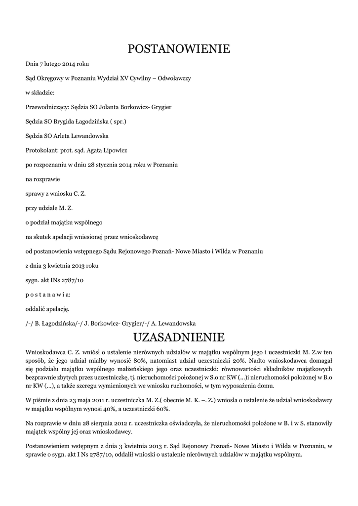 POSTANOWIENIE Dnia 7 lutego 2014 roku Sąd Okręgowy w Poznaniu Wydział XV Cywilny – Odwoławczy w składzie: Przewodniczący: Sędzia SO Jolanta Borkowicz- Grygier Sędzia SO Brygida Łagodzińska ( spr.) Sędzia SO Arleta Lewandowska Protokolant: prot. sąd. Agata Lipowicz po rozpoznaniu w dniu 28 stycznia 2014 roku w Poznaniu na rozprawie sprawy z wniosku C. Z. przy udziale M. Z. o podział majątku wspólnego na skutek apelacji wniesionej przez wnioskodawcę od postanowienia wstępnego Sądu Rejonowego Poznań- Nowe Miasto i Wilda w Poznaniu z dnia 3 kwietnia 2013 roku sygn. akt INs 2787/10 p o s t a n a w i a: oddalić apelację. /-/ B. Łagodzińska/-/ J. Borkowicz- Grygier/-/ A. Lewandowska UZASADNIENIE Wnioskodawca C. Z. wniósł o ustalenie nierównych udziałów w majątku wspólnym jego i uczestniczki M. Z.w ten sposób, że jego udział miałby wynosić 80%, natomiast udział uczestniczki 20%. Nadto wnioskodawca domagał się podziału majątku wspólnego małżeńskiego jego oraz uczestniczki: równowartości składników majątkowych bezprawnie zbytych przez uczestniczkę, tj. nieruchomości położonej w S.o nr KW (...)i nieruchomości położonej w B.o nr KW (...), a także szeregu wymienionych we wniosku ruchomości, w tym wyposażenia domu. W piśmie z dnia 23 maja 2011 r. uczestniczka M. Z.( obecnie M. K. –. Z.) wniosła o ustalenie że udział wnioskodawcy w majątku wspólnym wynosi 40%, a uczestniczki 60%. Na rozprawie w dniu 28 sierpnia 2012 r. uczestniczka oświadczyła, że nieruchomości położone w B. i w S. stanowiły majątek wspólny jej oraz wnioskodawcy. Postanowieniem wstępnym z dnia 3 kwietnia 2013 r. Sąd Rejonowy Poznań- Nowe Miasto i Wilda w Poznaniu, w sprawie o sygn. akt I Ns 2787/10, oddalił wnioski o ustalenie nierównych udziałów w majątku wspólnym. Podstawę powyższego rozstrzygnięcia stanowiły następujące ustalenia faktyczne i rozważania Sądu pierwszej instancji: Wnioskodawca C. Z.i uczestniczka M. Z.zawarli związek małżeński w dniu 3 marca 1994 r. W ich małżeństwie obowiązywał ustrój wspólności majątkowej małżeńskiej. W czasie trwania małżeństwa nie została ustanowiona rozdzielność majątkowa – ani sądownie ani umownie. Żadne z małżonków nie było ubezwłasnowolnione oraz nie została orzeczona separacja przez Sąd. Wyrokiem z dnia 3 lipca 2009 r. Sąd Okręgowy w O., w sprawie o sygn. akt IV RC (...), rozwiązał małżeństwo C. Z.i M. Z.przez rozwód z winy obu stron. Orzeczenie to stało się prawomocne w dniu 22 grudnia 2009 r. M. Z.i C. Z.po zawarciu małżeństwa zamieszkiwali w B.w wynajętym mieszkaniu. M. Z.studiowała i dorywczo pracowała jako kelnerka. Z kolei C. Z.początkowo studiował i pracował, a następnie pracował na uniwersytecie jako pracownik naukowy. C. Z.otrzymywał wówczas wynagrodzenie: w 1994 r. 47.350(...), w 1995 r. 51.350 (...), w 1996 r. 51.350 (...), w 1997 r. – 49.430 (...). W okresie od stycznia do grudnia 1996 r. M. Z.pracowała w spółce (...) Sp. z o.o.jako hostessa. Z tego tytułu w 1996r. otrzymała łącznie wynagrodzenie w kwocie 16.541,20 (...)brutto. Od stycznia do sierpnia 1997 r. M. Z.wykonywała dla firmy (...)zlecenia za wynagrodzeniem około 500-600 (...)miesięcznie. W okresie od kwietnia do sierpnia 1997 r. M. Z.odbywała praktykę jako praktykanta, a następnie od września 1997 r. do listopada 1997 r. pracowała w oparciu o umowę o dzieło w (...)B., z wynagrodzeniem 5.500 (...)brutto. M. Z.zrezygnowała z tego zatrudnienia w związku z otrzymaniem przez męża pracy w Polsce i wyjazdem do Polski. W 1998 r. C. Z.otrzymał ofertę pracy w Polsce, w O., jako (...)B., a następnie ich (...). Małżonkowie podjęli decyzję o wspólnym przeprowadzeniu się do Polski. Wiązało się to z koniecznością przerwania przez M. Z.studiów w B.i pracy w (...)B., o czym była mowa powyżej. Początkowo, po przyjeździe do Polski, małżonkowie Z.zamieszkiwali w wynajętym mieszkaniu w O.. Podjęli jednak decyzję o zakupie własnej nieruchomości z domem. Małżonkowie nie mieli własnych środków wystarczających na zakup nieruchomości. W związku z powyższym rodzice C. Z.mieli uczestniczyć w finansowaniu zakupu. Miało odbyć się to w ten sposób, że C.i M. Z.mieli otrzymać ze S.B.kwotę 80.000 (...)pożyczki, z której 40.000 (...)pochodziło z wkładu rodziców wnioskodawcy do tej kasy oszczędnościowej. W dniu 22 grudnia 2000 r. M. Z.nabyła prawo własności nieruchomości położnej w S., dla której Sąd Rejonowy w O.prowadzi księgę wieczystą nr (...)za kwotę 11.766 zł. W akcie notarialnym nabycia nieruchomości M. Z.oświadczyła, że prawo to nabywa z majątku odrębnego, a jej mąż jest cudzoziemcem. Nieruchomość tę M. Z.sprzedała na rzecz Z. K.bez zgody i wiedzy wnioskodawcy w dniu 16 stycznia 2007 r. za kwotę 35.000 zł. Otrzymane środki nawet w części nie zostały przekazane wnioskodawcy. W dniu 28 grudnia 2000 r. M. Z.nabyła od S. S.prawo własności nieruchomości położnej w B., dla której Sąd Rejonowy w O.prowadzi księgę wieczystą nr (...)za kwotę 240.000 zł. W akcie notarialnym nabycia nieruchomości M. Z.oświadczyła, że prawo to nabywa z majątku odrębnego ponieważ jej mąż jest cudzoziemcem. Część ceny w kwocie 80.000 zł została zapłacona przy zawarciu umowy, natomiast reszta w kwocie 160.000 zł miała być zapłacona do dnia 31 stycznia 2001 r. Nieruchomość tę M. Z.sprzedała bez zgody i wiedzy wnioskodawcy w dniu 3 lipca 2007 r. na rzecz E.i W. N.za kwotę 540.000 zł. Otrzymane środki nawet w części nie zostały przekazane wnioskodawcy. M. Z.nie miała własnych środków, oszczędności pozwalających jej na zapłatę ceny za którąkolwiek z tych nieruchomości. Mimo zatem zapisu w akcie notarialnym, nieruchomość w B.była zakupiona wspólnie przez małżonków, było to między nimi uzgodnione. Pierwsza rata ceny 80.000 zł pochodziła ze środków otrzymanych od rodzic