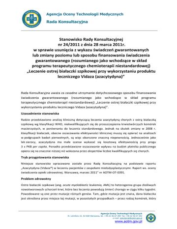 Agencja Oceny Technologii Medycznych Rada Konsultacyjna Stanowisko Rady Konsultacyjnej nr 24/2011 z dnia 28 marca 2011r. w sprawie usunięcia z wykazu świadczeń gwarantowanych lub zmiany poziomu lub sposobu finansowania świadczenia gwarantowanego (rozumianego jako wchodzące w skład programu terapeutycznego chemioterapii niestandardowej) „Leczenie ostrej białaczki szpikowej przy wykorzystaniu produktu leczniczego Vidaza (azacytydyna)” Rada Konsultacyjna uważa za zasadne utrzymanie dotychczasowego sposobu finansowania świadczenia gwarantowanego (rozumianego jako wchodzące w skład programu terapeutycznego chemioterapii niestandardowej) „Leczenie ostrej białaczki szpikowej przy wykorzystaniu produktu leczniczego Vidaza (azacytydyna)”. Uzasadnienie stanowiska Radzie przedstawiono analizę kliniczną dotyczącą leczenia azacytydyną chorych z ostrą białaczką szpikową wg klasyfikacji WHO, niekwalifikujących się do przeszczepienia krwiotwórczych komórek macierzystych, w porównaniu do leczenia standardowego. Jednak na skutek zmiany w 2008 r. klasyfikacji białaczek, obecne oszacowania efektywności klinicznej muszą się opierać na analizach w podgrupach badań pierwotnych, są więc obarczone znaczną niepewnością. Jednocześnie jako lek sierocy, azacytydyna ma małe szanse wykazać się kosztową efektywnością przy progu 3 x PKB per capita. Ponadto przedstawione oszacowanie wpływu na budżet płatnika publicznego opiera się na znacznie niższej niż wskazana przez ekspertów liczbie kwalifikujących się chorych. Tryb przygotowania stanowiska Niniejsze stanowisko opracowane zostało przez Radę Konsultacyjną na podstawie raportu „Azacytydyna (Vidaza®) w leczeniu pacjentów z zespołami mielodysplastycznymi. Raport ws. oceny świadczenia opieki zdrowotnej. Warszawa, marzec 2011” nr AOTM-OT-0391. Problem zdrowotny Ostre białaczki szpikowe (ang. acute myeloblastic leukemia, AML) to heterogenna grupa złośliwych nowotworowych schorzeń krwi, które bez leczenia powodują śmierć chorego w ciągu kilku tygodni. Powodowane są one przez mutacje różnych genów. Tam, gdzie mutacja jest znana, dana białaczka jest określona przez miejsce tej mutacji, w pozostałych przypadkach – przez rodzaj komórek, który Agencja Oceny Technologii Medycznych Al. Lotników 22, 02-668 Warszawa, tel. +48 22 56 67 200 fax +48 22 56 67 202 e-mail: [email protected] www.aotm.gov.pl Stanowisko Rady Konsultacyjnej AOTM nr 24/2011 z dnia 28 marca 2011r. dominuje w obrazie klinicznym. Rocznie w Polsce na ostre białaczki szpikowe zapada około 700 osób dorosłych.1 Obecnie, zgodnie z wprowadzoną w 2008 r. klasyfikacją WHO, ostrą białaczkę rozpoznaje się, jeśli liczba blastów w szpiku wynosi >20%, a nie >30%, jak to przyjmowały zasady podziału FAB (klasyfikacja French-American-British,). Oznacza to rezygnację z postaci zespołu „MDS RAEB w transformacji”, który jest obecnie traktowany jako ostra białaczka.1 Zmiana klasyfikacji wpłynęła na wiarygodność analiz danych dotycących efektywności klinicznej azacytydyny (AZA), stwarzając konieczność retrospektywnej analizy podgrup badania wykonanego w okresie stosowania klasyfikacji FAB. Obecna standardowa terapia Rozpoznanie i rozpoczęcie leczenia ostrych białaczek powinno być prowadzone wyłącznie w wyspecjalizowanych jednostkach o najwyższym poziomie referencyjności, które uzyskały akredytację potwierdzającą odpowiedni standard. Paliatywne i objawowe (przetaczanie składników krwi) leczenie w przypadku oporności na terapię, a także osób bardzo starych lub niezdolnych do transportu, prowadzi się na oddziale internistycznym najbliższym miejsca zamieszkania pacjenta.1 Wyróżnia się następujące fazy postępowania w ostrych białaczkach: 1 – ustalenie dokładnego rozpoznania, czynników ryzyka i wybór leczenia; – leczenie indukujące remisję całkowitą (CR); – konsolidacja remisji (ta faza u chorych wysokiego ryzyka może obejmować wczesną transplantację komórek krwiotwórczych); – leczenie po uzyskaniu remisji całkowitej dostosowane do stopnia ryzyka i stanu biologicznego: o allotransplantacja szpiku lub komórek krwiotwórczych z krwi (ang. peripheral blood stem cell transplant, BMT/PBSCT), o autotransplantacja komórek krwiotwórczych z krwi lub szpiku (ang. autologous peripheral blood stem cell transplant, APBSCT)/autologous bone marrow transplantation, ABMT), o leczenie podtrzymujące remisję, – – o obserwacja i szybkie leczenie w razie objawów wznowy; leczenie postaci opornych: o leczenie drugiej linii podane w zaleceniach, o leczenie w ramach programów badawczych, o leczenie paliatywne; leczenie nawrotów choroby: o leczenie reindukujące remisję pierwszej linii lub drugiej linii (zależnie od czasu wznowy i jej charakteru), o leczenie w ramach programów badawczych, o leczenie paliatywne. Oceniana terapia Azacytydyna (Vidaza®): grupa farmakoterapeutyczna – lek przeciwnowotworowy; analog pirymidyn; kod ATC: L01BC07.2 2/5 Stanowisko Rady Konsultacyjnej AOTM nr 24/2011 z dnia 28 marca 2011r. Vidaza® jest wskazana do leczenia pacjentów dorosłych, niekwalifikujących się do przeszczepienia krwiotwórczych komórek macierzystych, z:2 – zespołami mielodysplastycznymi (ang. myelodysplastic syndromes, MDS) o pośrednim2 i wysokim ryzyku, zgodnie z Międzynarodowym Punktowym Systemem Rokowniczym (ang. International Prognostic Scoring System, IPSS) – przewlekłą białaczką mielomonocytową (ang. chronic myelomonocytic leukaemia, CMML) z 10-29% blastów szpiku bez choroby mieloproliferacyjnej, – ostrą białaczką szpikową (ang. acute myeloid leukaemia, AML) z 20-30% blastów i wieloliniową dysplazją zgodnie z klasyfikacją Światowej Organizacji Zdrowia (WHO). W 2002 r. EMA uznała preparat Vidaza® za lek sierocy w odniesieniu do MDS, a w 2007 r. w odniesieniu do AML (CMML kwalifikowano tym czasie jako rodzaj MDS).3 Azacytydyna działa przeciwnowotwo