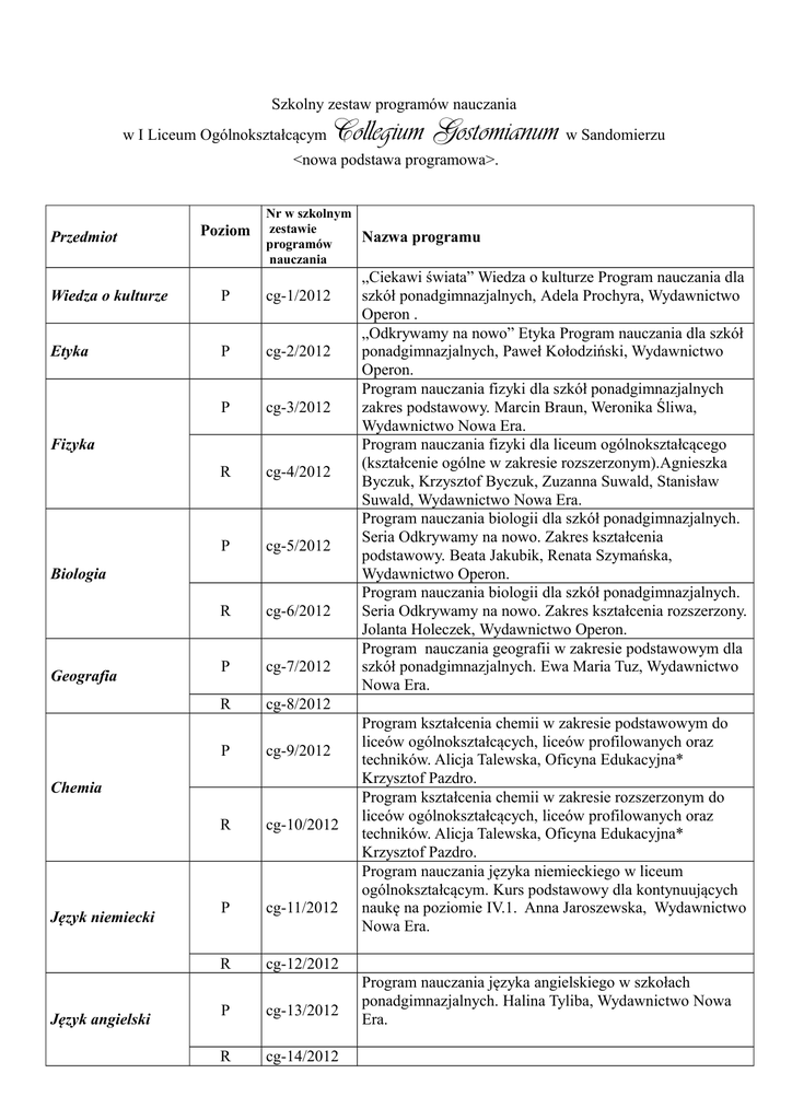Szkolny zestaw programów nauczania w I Liceum Ogólnokształcącym Collegium Gostomianum w Sandomierzu <nowa podstawa programowa>. Przedmiot Poziom Nr w szkolnym zestawie programów nauczania Wiedza o kulturze P cg-1/2012 Etyka P cg-2/2012 P cg-3/2012 R cg-4/2012 P cg-5/2012 R cg-6/2012 P cg-7/2012 R cg-8/2012 Fizyka Biologia Geografia P cg-9/2012 R cg-10/2012 P cg-11/2012 R cg-12/2012 Chemia Język niemiecki Język angielski P cg-13/2012 R cg-14/2012 Nazwa programu „Ciekawi świata” Wiedza o kulturze Program nauczania dla szkół ponadgimnazjalnych, Adela Prochyra, Wydawnictwo Operon . „Odkrywamy na nowo” Etyka Program nauczania dla szkół ponadgimnazjalnych, Paweł Kołodziński, Wydawnictwo Operon. Program nauczania fizyki dla szkół ponadgimnazjalnych zakres podstawowy. Marcin Braun, Weronika Śliwa, Wydawnictwo Nowa Era. Program nauczania fizyki dla liceum ogólnokształcącego (kształcenie ogólne w zakresie rozszerzonym).Agnieszka Byczuk, Krzysztof Byczuk, Zuzanna Suwald, Stanisław Suwald, Wydawnictwo Nowa Era. Program nauczania biologii dla szkół ponadgimnazjalnych. Seria Odkrywamy na nowo. Zakres kształcenia podstawowy. Beata Jakubik, Renata Szymańska, Wydawnictwo Operon. Program nauczania biologii dla szkół ponadgimnazjalnych. Seria Odkrywamy na nowo. Zakres kształcenia rozszerzony. Jolanta Holeczek, Wydawnictwo Operon. Program nauczania geografii w zakresie podstawowym dla szkół ponadgimnazjalnych. Ewa Maria Tuz, Wydawnictwo Nowa Era. Program kształcenia chemii w zakresie podstawowym do liceów ogólnokształcących, liceów profilowanych oraz techników. Alicja Talewska, Oficyna Edukacyjna* Krzysztof Pazdro. Program kształcenia chemii w zakresie rozszerzonym do liceów ogólnokształcących, liceów profilowanych oraz techników. Alicja Talewska, Oficyna Edukacyjna* Krzysztof Pazdro. Program nauczania języka niemieckiego w liceum ogólnokształcącym. Kurs podstawowy dla kontynuujących naukę na poziomie IV.1. Anna Jaroszewska, Wydawnictwo Nowa Era. Program nauczania języka angielskiego w szkołach ponadgimnazjalnych. Halina Tyliba, Wydawnictwo Nowa Era. Historia Wiedza o społeczeństwie Edukacja dla bezpieczeństwa Matematyka Podstawy przedsiębiorczości P cg-15/2012 R cg-16/2012 P R cg-17/2012 cg-18/2012 P cg-19/2012 R cg-20/2012 P cg-21/2012 R cg-22/2012 P cg-23/2012 P cg-24/2012 P cg-25/2012 R cg-26/2012 P cg-27/2012 Wychowanie fizyczne Filozofia przyrody z bioetyką Wychowanie do cg-28/2012 P cg-29/2012 P cg-30/2012 Program nauczania języka angielskiego dla liceum ogólnokształcącego i technikum, IV etap edukacyjny. Poziom IV.1 dla kontynuujących naukę w zakresie podstawowym; na podbudowie wymagań poziomu III.0 i III. 1 dla III etapu edukacyjnego. Joanna Sosnowska Maria Małgorzata Wieruszewska, Wydawnictwo Oxford University Press 2012. Program nauczania języka angielskiego dla liceum ogólnokształcącego i technikum, IV etap edukacyjny. Poziom IV.1 dla kontynuujących naukę w zakresie rozszerzonym na podbudowie wymagań poziomu III.1 dla III etapu edukacyjnego. Joanna Sosnowska, Maria Małgorzata Wieruszewska, Wydawnictwo Oxford University Press 2012. Poznać przeszłość. Wiek XX. Zakres podstawowy. Program nauczania do historii dla szkół ponadgimnazjalnych. Marek Jekel, Wydawnictwo Nowa Era. Program nauczania przedmiotu wiedza o społeczeństwie w szkole ponadgimnazjalnej. Zakres podstawowy, W centrum uwagi. Mariusz Menz, Wydawnictwo Nowa Era. Program nauczania z rozkładem materiału do edukacji dla bezpieczeństwa w szkołach ponadgimnazjalnych” autorstwa Mieczysława Borowieckiego, Zbigniewa Pytasza i Edwarda Rygały, Wydawnictwo Szkolne PWN 2012. Program nauczania w liceach i w technikach. Zakres podstawowy. Marcin Kurczab, Elżbieta Kurczab, Elżbieta Świda, Oficyna Edukacyjna* Krzysztof Pazdro. Prosto do matury. Program nauczania matematyki dla szkół ponadgimnazjalnych kończących się maturą. Kształcenie ogólne w zakresie podstawowym. Piotr Grabowski. Nowa Era. Program nauczania w liceach i w technikach. Zakres rozszerzony. Marcin Kurczab, Elżbieta Kurczab, Elżbieta Świda, Oficyna Edukacyjna* Krzysztof Pazdro. Program nauczania podstaw przedsiębiorczości dla szkół ponadgimnzjalnych –Krok w przedsiębiorczość. Marek Niesłuchowski, Nowa Era. Program nauczania wychowania fizycznego dla IV etapu edukacyjnego Urszula Kieraczak "Zdrowie - Sport Rekreacja" - Impuls, Kraków 2012 wraz z poprawkami wprowadzonymi przez Macieja Borowskiego, Mirosława Kukiełkę, Barbarę Złocką-Węgrzynowską, Ewelinę Błajszczak i Marcina Sytę dostosowującymi program do warunków lokalowych i zainteresowań młodzieży w I LO Collegium Gostomianum w Sandomierzu. Autorski program nauczania- filozofia przyrody z bioetyka. Joanna Pieronkiewicz-Szpernal Autorski program nauczania- wychowanie do życia w życia w rodzinie Religia P cg-31/2012 Język włoski P cg-32/2012 Informatyka P cg-33/2012 Informatyka P cg-34/2012 Język polski Język polski P+R P+R cg-35/2012 cg-36/2012 rodzinie. Aleksandra Stola. Program nauczania religii w szkole ponadgimnazjalnej. Ks. Stanisław Łabendowicz. Wydawnictwo Diecezji Radomskiej AVE. Program nauczania języka włoskiego dla początkujących w szkołach ponadgimnazjalnych. Dagmara Kozik. Wydawnictwo Nowela Program nauczania. Informatyka dla szkół ponadgimnazjalnych zakres podstawowy. Grażyna Koba. Wydawnictwo Migra. Informatyka. Program nauczania dla szkół ponadgimnazjalnych. Zakres podstawowy. Arkadiusz Gawełek. Wydawnictwo Operon. Język polski. – seria „Odkrywamy na nowo”. Zakres podstawowy i rozszerzony. Program nauczania dla szkół ponadgimnazjalnych. Ewa Dunaj, Bogna Zagórska. Wydawnictwo Operon. Zrozumieć tekst – zrozumieć człowieka. Katarzyna Olejnik. Zakres podstawowy i rozszerzony . Wydawnictwa Szkolne i Pedagogiczne.