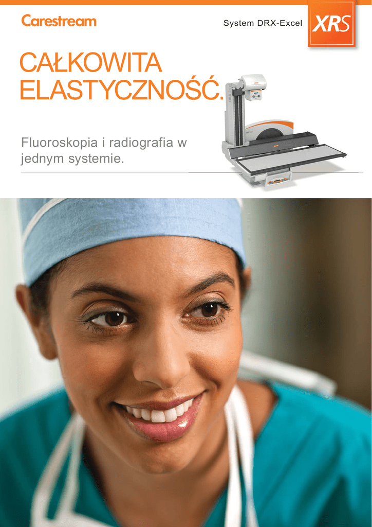 System DRX-Excel CAŁKOWITA ELASTYCZNOŚĆ. Fluoroskopia i radiografia w jednym systemie. ROZWIĄZANIE DWA W JEDNYM. Popularność fluoroskopii w charakterze obrazowania diagnostycznego gwałtownie rośnie – i jest ku temu dobry powód. Fluoroskopia zapewnia wyjątkową jakość obrazu i umożliwia wykonanie wielu rodzajów badań. Obecnie technologia ta została zoptymalizowana dla szpitali i centrów obrazowania dzięki systemowi DRX-Excel firmy CARESTREAM. Łączy on funkcje fluoroskopii i radiografii ogólnej w jednym, kompaktowym aparacie. Przyspiesza także pracę, zapewnia łatwą i wygodną pracę oraz dostarcza wysokiej jakości obrazów. To całkowita elastyczność. WSZECHSTRONNOŚĆ W PRZYSTĘPNEJ CENIE DLA SZPITALI I CENTRÓW OBRAZOWANIA. Poznaj idealne połączenie wydajności i ekonomii. System DRX-Excel dostarcza funkcji niezbędnych do radiograficznych badań ogólnych i badań fluoroskopowych w jednym systemie – w bardzo atrakcyjnej cenie. Wszechstronność systemu na tym się nie kończy: jest on dostępny w postaci dwóch modeli, aby sprostać Twoim potrzebom i organizacji pracy: • Konfiguracja tradycyjna, z wykorzystaniem kliszy lub kaset CR bądź bezprzewodowego detektora DRX dla radiografii, wzmacniacza obrazu dla fluoroskopii. • Lub konfiguracja dRF z pojedynczym, cyfrowym detektorem z płaskim panelem dla fluoroskopii i radiografii. Po prostu lepsze rozwiązanie. Jeśli szukasz kombinacji systemu fluoroskopii/RAD, kupuj rozważnie. W porównaniu do systemu DRX-Excel różne modele konkurencyjne mają istotne wady. Należą do nich: • • • • • Odległość źródło-obraz ograniczona do 150 cm. Krótsze blaty. Konieczność ręcznego obracania lampy. Mniejsze maksymalne obciążenie stołów. Brak ruchu stołu w cztery strony. System DRX-Excel omija te ograniczenia – dostarczając wyjątkowych doświadczeń technikom i pacjentom. Ta łatwa w użyciu konsola posiada duży, kolorowy ekran dotykowy i intuicyjne elementy sterujące. Integruje wszystkie ruchy stołu, ustawienia generatora i funkcje APR w jednym, wydajnym interfejsie. Automatyczne pozycjonowanie pozwala skrócić czas przygotowania do badania. Opcjonalny system DRX-1 ze zintegrowaną konsolą zapewnia moc X-Factor i umożliwia wykonanie wszystkich badań radiologicznych: na stole, w poprzek stołu lub w pozycji stojącej. 2 KOMPLETNIE WYPOSAŻONA ELASTYCZNOŚĆ. Zestaw funkcji systemu DRX-Excel zapewnia najwyższą wydajność obrazowania. Ergonomiczna konstrukcja i dbałość o detale zapewniają komfort pacjenta i wydajność użytkownika. Skupienie się na wydajności systemu przyspiesza pracę. A przechwytywanie obrazów w wysokiej rozdzielczości i obróbka sprzyjają doskonałej jakości obrazu i szybkim, precyzyjnym rozpoznaniom. Relaksujące oświetlenie i możliwość wyboru muzyki zwiększają komfort pacjenta. Rozszerzona funkcja SID jest lepsza niż oferowana przez konkurencję, akwizycja obrazów w dowolnej odległości w zakresie od 110 do 180 cm. Dynamiczny wbudowany w stół detektor z płaskim panelem łączy wysoką rozdzielczość przestrzenną i tryb szczegółowy do badań fluoroskopowych, radiologicznych badań ogólnych i badań kości, a wzmacniacz obrazu z kamerą CCD wysokiej rozdzielczości maksymalizuje jakość obrazu w trakcie fluoroskopii. Zmotoryzowany ruch lampy i kolumny maksymalizuje prędkość i wygodę. Obrazowanie pacjenta wynoszące 196 cm umożliwia pełne badanie bez zmiany pozycji, nawet u bardzo wysokich osób. Maksymalne obciążenie stołu wynosi 200 kg, co umożliwia ułożenie na nim cięższych pacjentów. Pomiary DAP umożliwiają ustalenie dokładnej dawki promieniowania, jaką otrzymał pacjent. Wysokość stołu wynosząca 79 cm – łatwy dostęp dla większości pacjentów. W pełni zmotoryzowana, łatwa w użyciu kompresja do badań jamy brzusznej i innych. System sterowania działa zdalnie lub przyłóżkowo. Ściśle obserwuj pacjenta. Muzyka dla uszu pacjenta. Wbudowana kam kamera wideo dostarcza obrazu na żywo, dzięki czemu czem można monitorować pozycję og pacjenta i jego ogólny status w trakcie całego badania. Mikrofo Mikrofon w konsoli umożliwia rozmowę z pacjentem w celu przekazania mu instrukcji i dodania otuchy zawsze wtedy, kiedy jest to potrzebne. DRX-Exc (DRX-Excel Plus) może System DRX-Excel wybra muzykę, aby zrelaksować i odtwarzać wybraną zabawić pacjentó pacjentów w trakcie badania. Istnieje możliwość wybor wyboru niestandardowego menu utworów w trakci trakcie instalacji systemu. Ponadto można wybrać, aby utworom towarzyszyły kojące efekty świetlne. 3 INTELIGENTNE ROZWIĄZANIA RTG NIEWAŻNE DOKĄD ZMIERZASZ, Idealny na dziś. Gotowy na jutro. Firma Carestream jest gotowa, aby pomóc Ci zaplanować najskuteczniejszą drogę do przyszłości związanej z obrazowaniem RTG. Skalowalna budowa sprzętu i modułowe komponenty oznaczają wysoką wydajność dziś oraz łatwe, niedrogie aktualizacje w kolejnych latach. SPRAWIMY, ŻE DOTRZESZ NA MIEJSCE. Zaplanujmy wspólnie przeniesienie Twoich urządzeń – zyskasz pewność, że aktualna inwestycja w sprzęt będzie dobrze zwracać się r\w przyszłości. DYNAMICZNE FUNKCJE STOŁU. OPCJE WYSOKIEJ WYDAJNOŚCI. System DRX-Excel oferuje zaawansowany, zdalnie sterowany stół o wyjątkowej elastyczności do wielu zastosowań. Jego ergonomia i wydajność optymalizują cały proces badania – zapewniając wygodę operatorowi oraz komfort i brak stresu dla pacjenta. Ruch stołu w cztery strony ułatwia pozycjonowanie pacjenta. Stół można nachylać pod kątem +90º/-30º, aby umożliwić wiele rodzajów badań. Stacja do łączenia obrazów łączy wiele obrazów w jeden dla ułatwienia interpretacji badań kręgosłupa i kończyn dolnych. Maksymalne obciążenie stołu wynosi 200 kg, co umożliwia ułożenie na nim cięższych pacjentów. carestream.com/drx-excel © Carestream Health, 2015. CARESTREAM jest znakiem handlowym firmy Carestream Hea