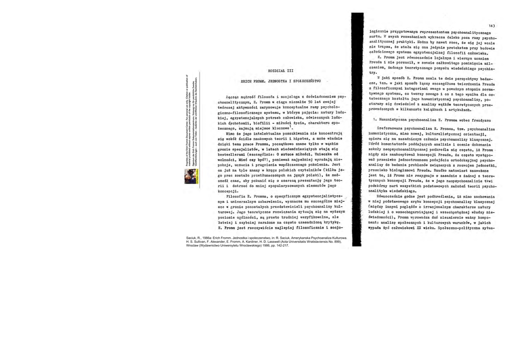 Saciuk, R., 1986a: Erich Fromm. Jednostka i spoleczenstwo, in: R. Saciuk, Amerykanska Psychoanaliza Kulturowa.
