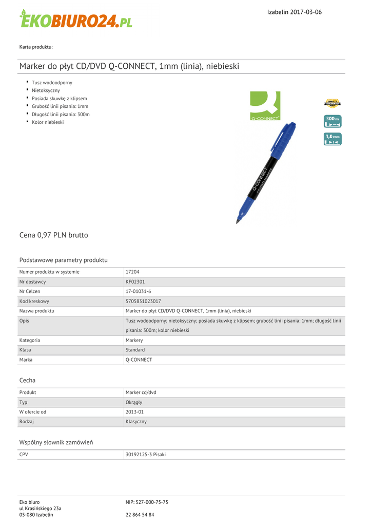 Izabelin 2017-03-06 Karta produktu: Marker do płyt CD/DVD Q-CONNECT, 1mm (linia), niebieski Tusz wodoodporny Nietoksyczny Posiada skuwkę z klipsem Grubość linii pisania: 1mm Długość linii pisania: 300m Kolor niebieski Cena 0,97 PLN brutto Podstawowe parametry produktu Numer produktu w systemie 17204 Nr dostawcy KF02301 Nr Celcen 17-01031-6 Kod kreskowy 5705831023017 Nazwa produktu Marker do płyt CD/DVD Q-CONNECT, 1mm (linia), niebieski Opis Tusz wodoodporny; nietoksyczny; posiada skuwkę z klipsem; grubość linii pisania: 1mm; długość linii pisania: 300m; kolor niebieski Kategoria Markery Klasa Standard Marka Q-CONNECT Cecha Produkt Marker cd/dvd Typ Okrągły W ofercie od 2013-01 Rodzaj Klasyczny Wspólny słownik zamówień CPV 30192125-3 Pisaki Eko biuro ul Krasińskiego 23a 05-080 Izabelin NIP: 527-000-75-75 22 864 54 84 Izabelin 2017-03-06 Karta katalogowa produktu cd. Marker do płyt CD/DVD Q-CONNECT, 1mm (linia), niebieski Certyfikaty Nowy produkt w ofercie Standard Hit Standard Wymiary Końcówka (mm) 1 Dł. linii (m) 300 Grubość linii (mm) 1 Kolor Kolor Niebieski Pozostałe zdjęcia produktu Serdecznie zapraszamy do współpracy Eko biuro zespół. Eko biuro ul Krasińskiego 23a 05-080 Izabelin NIP: 527-000-75-75 22 864 54 84