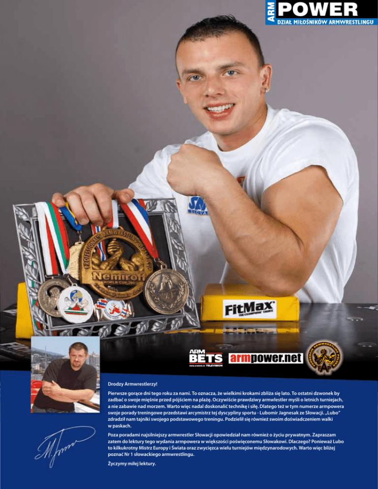 Drodzy Armwrestlerzy! Pierwsze gorące dni tego roku za nami. To oznacza, że wielkimi krokami zbliża się lato. To ostatni dzwonek by zadbać o swoje mięśnie przed pójściem na plażę. Oczywiście prawdziwy armwlestler myśli o letnich turniejach, a nie zabawie nad morzem. Warto więc nadal doskonalić technikę i siłę. Dlatego też w tym numerze armpowera swoje porady treningowe przedstawi arcymistrz tej dyscypliny sportu - Lubomir Jagnesak ze Słowacji. „Lubo” zdradził nam tajniki swojego podstawowego treningu. Podzielił się również swoim doświadczeniem walki w paskach. Poza poradami najsilniejszy armwrestler Słowacji opowiedział nam również o życiu prywatnym. Zapraszam zatem do lektury tego wydania armpowera w większości poświęconemu Słowakowi. Dlaczego? Ponieważ Lubo to kilkukrotny Mistrz Europy i Świata oraz zwycięzca wielu turniejów międzynarodowych. Warto więc bliżej poznać Nr 1 słowackiego armwrestlingu. Życzymy miłej lektury. 80 Lubomir, jak to się stało, że zacząłeś ćwiczyć armwrestling? Było to w wieku szkolnym. Miałem wtedy bodajże 12 lat. Zacząłem trenować z moim wujkiem, który uprawiał armwrestling. To właśnie on wciągnął mnie do tego sportu. Pamiętasz swój pierwszy turniej? Po roku treningów pojechałem na moje pierwsze zawody. Był to słowacki turniej. Wtedy ważyłem 63 kg. Najniższą kategorią startową była kategoria 75 kg. Musiałem więc siłować się z trochę cięższymi zawodnikami. Ostatecznie byłem drugi na podium, zaraz za swoim wujkiem. Czy cały czas trenował cię wujek? Wujek trenował mnie przez pierwsze trzy lata. Wprowadzał mnie w tajniki tej dyscypliny sportu. Mając piętnaście lat zacząłem już sam trenować i sam jeździć na zawody. Gdzie trenujesz? Cały czas trenowałem w mojej rodzinnej miejscowości – Rabca. Dziś mam własną siłownię FitMax GYM. W DOBREJ FORMIE mogę walczyć z każdym I NIE BOJĘ SIĘ NIKOGO ROZMOWA Z LUBOMIREM JAGNESAKIEM Jeszcze kilka lat temu, jeżeli ktoś pytał o zawodników słowackiego armwrestlingu, padało tylko jedno nazwisko – Jan Germanus. Dziś oprócz Janka ikoną armwrestlingu na Słowacji jest Lubomir Jagnesak z przygranicznej miejscowości Rabca. C hoć „Lubo” na co dzień prowadzi w rodzinnym mieście siłownię FitMax GYM i dystrybuuje na terenie Słowacji suplementy diety i odżywki dla sportowców polskiej marki FitMax, zawsze znajdzie czas na swoje hobby, jakim jest armwrestling. Kilkakrotny tytuł mistrza Słowacji, Europy czy świata dziś zobowiązuje Lu- nr 6 / 2011 bomira do dalszej aktywności w tym sporcie. Jak to się stało, że wybrał akurat siłowanie na ręce? Po jakim czasie zdobył tytuł mistrza Europy i świata? Jak na co dzień trenuje? Odpowiedzi na te i inne pytania przeczytacie w poniższym wywiadzie, którego Lubomir udzielił specjalnie dla Armpowera. Przez te wszystkie lata startowałeś na wielu turniejach. Pamiętasz może, który dla ciebie był najcięższy? Było wiele ciężkich turniejów. Ale nie pamiętam, który był najcięższy. Myślę, że start na mistrzostwach świata, gdzie będąc juniorem walczyłem również w seniorach. Czy na Słowacji armwrestling jest popularna dyscypliną? Jest u nas około 50 klubów, więc myślę, że tak jak chyba u was w Polsce. Czy na Słowacji jest dużo zawodów, w których możesz uczestniczyć? Regionalnych turniejów jest mało. Praktycznie są tylko trzy puchary Słowacji i międzynarodowy turniej Senecka Ruka. Jaki jest twój największy sukces sportowy? Mój pierwszy tytuł mistrza świata. Było to w 2006 w Manchester – Anglia. W mojej kategorii do 75 kg startowało 36 osób. Ja wtedy walczyłem w seniorach. W tej kategorii startowały takie nazwiska jak: Engin Terzi z Turcji, Cvetan Gashevski z Bułgarii czy Jan Amolins z Łotwy. Na rękę prawą byłem najlepszy i zdobyłem tytuł mistrza świata. Na lewą niestety w eliminacjach niefortunnie połama- W y wiad 81 łem nadgarstek podczas walki z Enginem Terzi. Po jakim czasie trenowania zostałeś mistrzem świata? Po trzech latach treningu zdobyłem tytuł mistrza świata juniorów, a po pięciu latach tytuł mistrza świata seniorów. Praktycznie od roku 2002 byłem na podium mistrzostw Europy i świata. Kiedy poczułeś, że jesteś w tym dobry? Praktycznie od samego początku. Jak zacząłem wygrywać lokalne turnieje, a potem zdobywać medale na mistrzostwach Europy i świata wiedziałem, że jest u mnie potencjał. Może przejdźmy teraz do treningów. Wyjaśnij nam, jak ty ćwiczysz? Wszystko zależy, na jakie zawody się przygotowuję. Generalnie trenuję 3–4 razy w tygodniu. Dwa razy wykonuję typowy trening armwrestlingowy, jeden raz trening ze sparingpartnerem, dwa razy trening siłowy całego ciała. Oczywiście 1–2 razy w tygodniu dla podtrzymania kondycji i dynamiki biegam. Kto jest twoim sparingpartnerem? Nie mam stałego sparingpartnera. Głównie trenuję sam. Jak do mojej siłowni FitMax Gym w mieście Rabca przyjeżdżają chłopaki z Polski, to wykorzystuję to i sparuję z nimi. Często też sparuję ze słowackim zawodnikiem - Peterem Kasan. Sparuję również z Rustamem Babajewem z Ukrainy. Czasami odwiedzamy się i wymieniamy poglądami. Rustam Babajew jest chyba dla mnie najlepszym sparingpartnerem Masz jakieś siłowe rekordy? Mam kilka. Na przykład podnoszenie na nadgarstek 100 kg jedną ręką. W armwrestlingu jednak nie chodzi o rekordy. Trening powinien być wykonywany dokładnie, w odpowiednich kątach oraz w zależności od tego, jak czujesz swoją rękę i jakie masz możliwości na dany dzień odpowiednio dobranymi ciężarami. A suplementacja jest ważnym elementem w twoich treningach? Bardzo ważna. Po zawodach czasami boli. A do tego, jak się odnowi stara kontuzja, to praktycznie zawsze boli. O ile jest to możliwe, na treningach robię 100% swoich możliwości. Na zawodach natomiast 150%. Bez suplementacji mój organizm nie dałby rady. Najważni