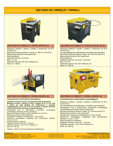 GIĉTARKI DO OBRĉCZY I SPIRALI HOOP-SPIRAL MACHINES GIƖTARKA DO OBRƖCZY I SPIRALI 85 HOOP-SPIRAL MACHINE MODELMODEL 85 GIƖTARKA DO OBRƖCZY I SPIRALI HOOP-SPIRAL MACHINE MODELMODEL 86 2R 86 2R Wykonuje i spirale o Ğrednicach For makingobrĊcze hoops and spirals zonprĊtów rods from ∅ 6 to ∅ 25.od Ø 6 do Ø 25 mm Minimum diameter of rings and spirals: ab. 300 mm Minimalna ĞrednicanoobrĊczy i spirali: ok. 300 mm max Ø 12 Maximum diameter: limit Maksymalna Ğrednica: bez ograniczeĔ 1 speed Jedna prĊdkoĞü 15 m per minute Feed speed: PrĊdkoĞü robocza:1,5 25+m/min Motor 1,5 Kw Moc: 1,5 kW Overall dimensions: 60 x 80 x 95 h. cm Caákowite wymiary:ab. 60185 x 80 Weight: Kgsx 95(wys) cm Masa: ok. 185 kg Wykonuje i spirale z prĊtów o Ğrednicach For making obrĊcze hoops and spirals on rods from ∅ 6 to ∅ 32 od Ø 6 do Ø 32 mm as well as high strength reinforcing rod). (homogeneous (ze stali gáadkiej lubrings profilowanej wysokiej Minimum diameter of and spirals:oab. 300 mmwytrzymaáoĞci) Minimalna ĞrednicanoobrĊczy i spirali: ok. 300 mm max Ø 12 Maximum diameter: limit Ğrednica: bez ograniczeĔ 2Maksymalna speeds Dwiespeed: prĊdkoĞci 20 m per minute – 15 m per minute Feed PrĊdkoĞü robocza:2,6 34+m/min Motor: 2,6 Kw- 23 m/min Moc: 2,6 kW Overall dimensions: 80 x 90 x 95 h. cm Caákowite wymiary:ab. 80300 x 90 Weight: Kgsx 95(wys) cm Masa: ok. 300 kg GIƖTARKA DO OBRƖCZY I SPIRALI 88 HOOP-SPIRAL MACHINE MODELMODEL 88 GIƖTARKA DO OBRƖCZY I SPIRALI 89 HOOP-SPIRAL MACHINE MODELMODEL 89 zwith hydraulicznym wyzwalającym HYDRAULICmechanizmem RELEASE DEVICE z hydraulicznym mechanizmem with HYDRAULIC RELEASE DEVICEwyzwalającym Urządzenie moĪe w pozycji pionowej lub poziomej. The machine can pracowaü work: Wytwarza i spirale ze stali z krĊgów do Ø 12 position. mm oraz • from coil obrĊcze up to ∅ 12 • in vertical position • in horizontal z prĊtów (ze stali gáadkiej lub profilowanej o wysokiej For making hoops as wellpoziomej as high wytrzymaáoĞci) odand Ø 6spirals do Øon 32rods mm (homogeneous pracując w pozycji reinforcing from ∅w6pozycji to ∅ 32 pionowej. when working in horizontal istrength od Ø 6 do Ø 20 mmrod) pracując WyposaĪony jest w ∅ 20 hydrauliczny wyzwalający position and from ∅ 6 to when workingmechanizm in vertical position. umoĪliwiający produkcjĊrelease obrĊczy niepeánych. Equipped with hydraulic device, allowing to make partial hoopings. Minimalna Ğrednicaof obrĊczy i spirali: 200/250 mm max Ø 12 Minimum diameter rings and spirals: 200/250 mm Maksymalna Ğrednica: bez ograniczeĔ Maximum diameter: no limit Posiada dwa obiegowe motoreduktory o mocy 2,6 kW Equipped with two epicyclic reduction units with 2,6 Kw motors. The releMechanizm wyzwalający napĊdzany jest hydraulicznie silnikiem device is controlled by a hydraulic power unit with 1,5 Kw motor. oase mocy 1,5 kW Two speeds selected by switch. Dwie przeáączane prĊdkoĞci Feed speed: m per- minute – 20 m per minute PrĊdkoĞü robocza: 4525m/min 34 m/min Caákowite wymiary: 105 cm Overall dimensions: 105xx140 140xx120(wys) 120 h. cm Masa: Weight:ok. 450 kg ab. 450 Kgs For making obrĊcze hoops and spirals on rods from ∅ 6 to ∅ 40 od Ø 6 Wykonuje i spirale z prĊtów o Ğrednicach (homogeneous do Ø 40 mm as well as high strength reinforcing rod) with hydraulic release device, allowing toomake partialwytrzymaáoĞci) hoopings. (ze stali gáadkiej lub profilowanej wysokiej Minimum diameterjest of rings and spirals: ab. 250 mm WyposaĪony w hydrauliczny mechanizm wyzwalający Maximum diameter: no limit obrĊczy niepeánych. umoĪliwiający produkcjĊ Equipped withĞrednica two epicyclic reduction units with Kwmm motors. Minimalna obrĊczy i spirali: ok.2,6 250 max Ø 12 The release device is controlled a hydraulic power unit with 1,5 Kw Maksymalna Ğrednica: bezby ograniczeĔ motor. Posiada dwa obiegowe motoreduktory o mocy 2,6 kW Two speeds selected by switch. napĊdzany jest hydraulicznie Mechanizm wyzwalający Feed speed: 20 kW m per minute – 15 m per minute silnikiem o mocy 1,5 Overall dimensions: prĊdkoĞci 135 x 130 x 95 h. cm Dwie przeáączane Weight: Kgs - 23 m/min PrĊdkoĞü robocza:ab. 34600 m/min Caákowite wymiary: 135 x 130 x 95(wys) cm Masa: ok. 500 kg *Stojak z rolkami nie jest standardowym *The stand with rollers is wyposaĪeniem an option. OSCAM S.p.A 10127 TORINO (Italia) - Via Canelli, 104/106 Tel. +39 011.663.56.56 (r.a.) - Fax +39 011.663.31.40 e-mail: [email protected] www.oscam.com 14 PULA STERNICKI STOKàOSA Sp.j. ul. Tetmajera 13; 05-080 Izabelin tel/fax 0-22 722 63 72; tel 0-601 24 37 30, 0-605 834 806 e-mail: [email protected] www.pula.waw.pl