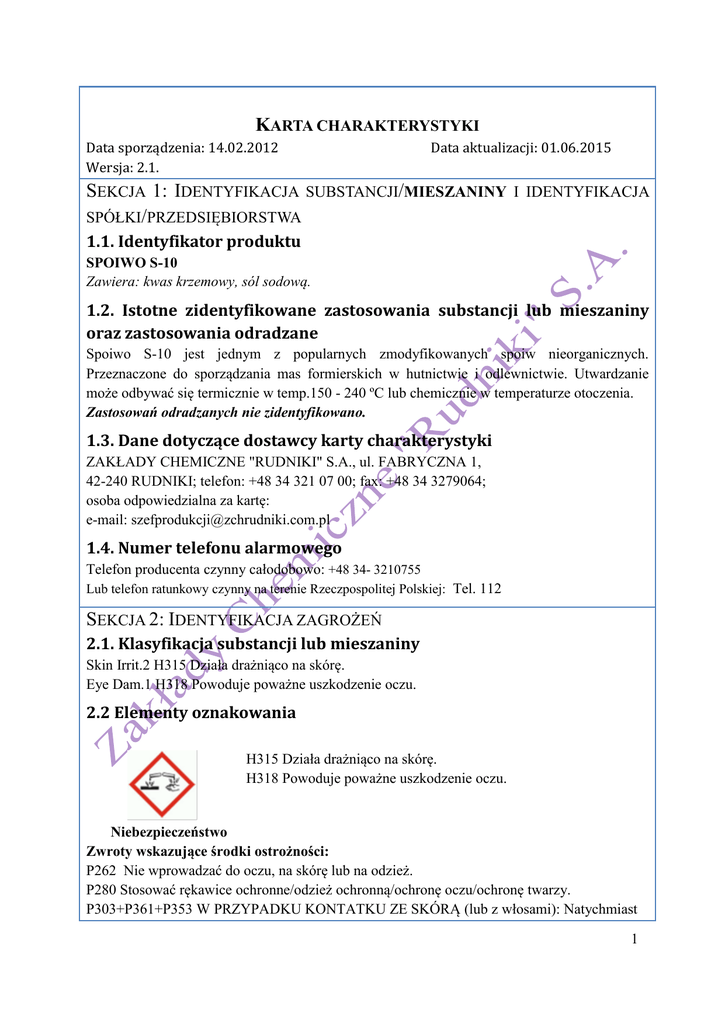KARTA CHARAKTERYSTYKI Data sporządzenia: 14.02.2012 Wersja: 2.1. Data aktualizacji: 01.06.2015 SEKCJA 1: IDENTYFIKACJA SUBSTANCJI/MIESZANINY I IDENTYFIKACJA SPÓŁKI/PRZEDSIĘBIORSTWA 1.1. Identyfikator produktu SPOIWO S-10 Zawiera: kwas krzemowy, sól sodową. 1.2. Istotne zidentyfikowane zastosowania substancji lub mieszaniny oraz zastosowania odradzane Spoiwo S-10 jest jednym z popularnych zmodyfikowanych spoiw nieorganicznych. Przeznaczone do sporządzania mas formierskich w hutnictwie i odlewnictwie. Utwardzanie może odbywać się termicznie w temp.150 - 240 ºC lub chemicznie w temperaturze otoczenia. Zastosowań odradzanych nie zidentyfikowano. 1.3. Dane dotyczące dostawcy karty charakterystyki ZAKŁADY CHEMICZNE "RUDNIKI" S.A., ul. FABRYCZNA 1, 42-240 RUDNIKI; telefon: +48 34 321 07 00; fax: +48 34 3279064; osoba odpowiedzialna za kartę: e-mail: [email protected] 1.4. Numer telefonu alarmowego Telefon producenta czynny całodobowo: +48 34- 3210755 Lub telefon ratunkowy czynny na terenie Rzeczpospolitej Polskiej: Tel. 112 SEKCJA 2: IDENTYFIKACJA ZAGROŻEŃ 2.1. Klasyfikacja substancji lub mieszaniny Skin Irrit.2 H315 Działa drażniąco na skórę. Eye Dam.1 H318 Powoduje poważne uszkodzenie oczu. 2.2 Elementy oznakowania H315 Działa drażniąco na skórę. H318 Powoduje poważne uszkodzenie oczu. Niebezpieczeństwo Zwroty wskazujące środki ostrożności: P262 Nie wprowadzać do oczu, na skórę lub na odzież. P280 Stosować rękawice ochronne/odzież ochronną/ochronę oczu/ochronę twarzy. P303+P361+P353 W PRZYPADKU KONTATKU ZE SKÓRĄ (lub z włosami): Natychmiast 1 zdjąć całą zanieczyszczoną odzież. Spłukać skórę pod strumieniem wody/prysznicem. P305+P351+P338 W PRZYPADKU DOSTANIA SIĘ DO OCZU: Ostrożnie płukać wodą przez kilka minut. Wyjąć soczewki kontaktowe, jeżeli są i można je łatwo usunąć. Informacje dodatkowe: Pełne brzmienie akronimów: zob. SEKCJA 16. 2.3. Inne zagrożenia Mieszanina nie spełnia kryteriów PBT lub vPvB zgodnie z załącznikiem XIII REACH. SEKCJA 3: SKŁAD/INFORMACJA O SKŁADNIKACH 3.2. Mieszaniny Nazwa chemiczna substancji: Kwas krzemowy, sól sodowa o module MR >1,6≤2,6 Zawartość substancji czystej w mieszaninie: 35%(Na2O+SiO2), resztę stanowi woda i dodatek modyfikujący nie podlegający klasyfikacji. Powszechnie stosowana nazwa własna substancji: szkło wodne sodowe o module >1,6≤2,6 Nazwa EC: sodium silicate; nr WE 215-687-4; Nazwa CAS: silicic acid , sodium salt; nr CAS: 1344-09-8; Nazwa IUPAC: sodium hydroxy(oxo)silanolate Wzór chemiczny: Na2O. nO2Si numer rejestracji REACH: 01-2119448725-31-0017 Nr indeksowy (rozporządzenie CLP, Załącznik VI): brak Opis substancji: Substancja nieorganiczna typu UVCB. Jest roztworem wodnym kompozycji oligomerów anionów krzemianowych SIO4 połączonych z kationami sodu. Budowa strukturalna substancji i jej właściwości są zależne od stosunku molowego SiO2 do Na2O nazywanego inaczej modułem molowym MR. Opisywany produkt o MR >1,6≤2,6 charakteryzują zawartości (dla stężenia 100% substancji Na2O. nO2Si) MR >1,6≤2,6 Zawartość SiO2 > 61 -72% Zawartość Na2O < 39-28% Opis zanieczyszczeń: Zanieczyszczenia występują w ilości poniżej 1% masowy i nie mają wpływu na klasyfikację substancji. Są to naturalne tlenki metali będących zanieczyszczeniem piasku kwarcowego (surowca), np. tlenki: glinu, wapnia, tytanu, magnezu, żelaza itp. SEKCJA 4: ŚRODKI PIERWSZEJ POMOCY 4.1. Opis środków pierwszej pomocy PO WDYCHANIU aerozolu substancji w przypadku złego samopoczucia wyprowadzić na świeże powietrze. W PRZYPADKU KONTAKTU ZE SKÓRĄ (lub z włosami): Natychmiast usunąć/zdjąć całą zanieczyszczoną odzież. Spłukać skórę pod strumieniem wody/prysznicem. W PRZYPADKU DOSTANIA SIĘ MIESZANINY DO OCZU: Ostrożnie płukać wodą przez co najmniej 10 minut. Wyjąć soczewki kontaktowe, jeżeli są i można je łatwo usunąć. Zapewnić pomoc lekarza okulisty. W PRZYPADKU POŁKNIĘCIA: wypłukać usta, nie wywoływać wymiotów. 2 W PRZYPADKU WYSTĄPIENIA NIEKORZYSTNYCH SKUTKÓW ZDROWOTNYCH: skontaktować się z lekarzem. 4.2. Najważniejsze ostre i opóźnione objawy oraz skutki narażenia Mieszanina ciekła, o charakterze alkalicznym. Kontakt ze skórą powoduje poważne podrażnienia. Przypadkowe wprowadzenie substancji do oka grozi poważnym, często trwałym uszkodzeniem oka. Połknięcie mieszaniny powoduje uszkodzenie śluzówki. 4.3. Wskazania dotyczące wszelkiej natychmiastowej pomocy lekarskiej i szczególnego postępowania z poszkodowanym W przypadku przedostania się mieszaniny do oczu i nie ustąpienia podrażnienia lub zaczerwienienia oczu po przemyciu dużą ilością wody należy natychmiast udzielić poszkodowanemu pomocy lekarza okulisty. W przypadku długotrwałych i powtarzających się podrażnień skóry należy skontaktować się z lekarzem. W przypadku przedostania rozpylonej mieszaniny do układu oddechowego należy poszkodowanego natychmiast wyprowadzić na świeże powietrze, a jeżeli objawy podrażnienia nie ustaną, skontaktować się z lekarzem. W przypadku nie zamierzonego połknięcia należy dać poszkodowanemu do picia dużą ilość wody. Wezwać lekarza \ pogotowie. Każdorazowo, w przypadku korzystania z pomocy lekarskiej zaleca się przedstawić udzielającemu pomocy niniejszą kartę charakterystyki. SEKCJA 5: POSTĘPOWANIE W PRZYPADKU POŻARU 5.1. Środki gaśnicze Mieszanina niepalna i nie podtrzymująca palenia. W przypadku zaistnienia pożaru stosować środki odpowiednie dla materiałów znajdujących się w pobliżu. Brak danych o środkach nie zalecanych przy gaszeniu pożaru. 5.2. Szczególne zagrożenia związane z substancją lub mieszaniną Mieszanina ciekła, niepalna, niewybuchowa. Reaguje z kwasami mineralnymi. 5.3. Informacje dla straży pożarnej Należy unikać bezpośredniego kontaktu z nieosłonięta skórą i z oczami. Stosować ogólne środki indywidualnej ochrony osobistej. Mieszanina roz