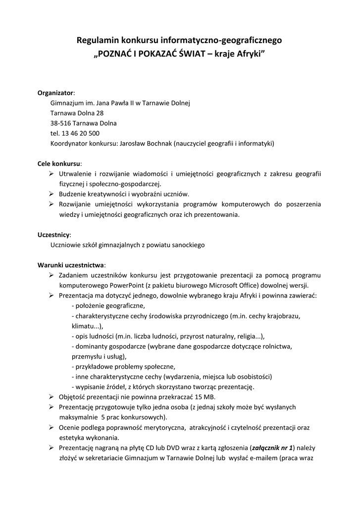 Regulamin konkursu informatyczno-geograficznego „POZNAĆ I POKAZAĆ ŚWIAT – kraje Afryki” Organizator: Gimnazjum im. Jana Pawła II w Tarnawie Dolnej Tarnawa Dolna 28 38-516 Tarnawa Dolna tel. 13 46 20 500 Koordynator konkursu: Jarosław Bochnak (nauczyciel geografii i informatyki) Cele konkursu: Utrwalenie i rozwijanie wiadomości i umiejętności geograficznych z zakresu geografii fizycznej i społeczno-gospodarczej. Budzenie kreatywności i wyobraźni uczniów. Rozwijanie umiejętności wykorzystania programów komputerowych do poszerzenia wiedzy i umiejętności geograficznych oraz ich prezentowania. Uczestnicy: Uczniowie szkół gimnazjalnych z powiatu sanockiego Warunki uczestnictwa: Zadaniem uczestników konkursu jest przygotowanie prezentacji za pomocą programu komputerowego PowerPoint (z pakietu biurowego Microsoft Office) dowolnej wersji. Prezentacja ma dotyczyć jednego, dowolnie wybranego kraju Afryki i powinna zawierać: - położenie geograficzne, - charakterystyczne cechy środowiska przyrodniczego (m.in. cechy krajobrazu, klimatu...), - opis ludności (m.in. liczba ludności, przyrost naturalny, religia...), - dominanty gospodarcze (wybrane dane gospodarcze dotyczące rolnictwa, przemysłu i usług), - przykładowe problemy społeczne, - inne charakterystyczne cechy (wydarzenia, miejsca lub osobistości) - wypisanie źródeł, z których skorzystano tworząc prezentację. Objętość prezentacji nie powinna przekraczać 15 MB. Prezentację przygotowuje tylko jedna osoba (z jednaj szkoły może być wysłanych maksymalnie 5 prac konkursowych). Ocenie podlega poprawność merytoryczna, atrakcyjność i czytelność prezentacji oraz estetyka wykonania. Prezentację nagraną na płytę CD lub DVD wraz z kartą zgłoszenia (załącznik nr 1) należy złożyć w sekretariacie Gimnazjum w Tarnawie Dolnej lub wysłać e-mailem (praca wraz zeskanowaniem karty zgłoszeniowej) na adres: [email protected] do dnia 10 maja 2014 r. (z dopiskiem: POZNAĆ I POKAZAĆ ŚWIAT). Uczestnicy konkursu zgłaszając swoje prace konkursowe zgadzają się na ich publikację w Internecie (na stronie www.gimtarnawa.zagorz.info) i ich wykorzystanie podczas zajęć lekcyjnych oraz upublicznienie swoich danych osobowych (Imię Nazwisko i szkoła, do której uczęszczają). Najlepsze prace zostaną opublikowane na stronie internetowej: www.gimtarnawa.zagorz.info Podsumowanie konkursu nastąpi 19 maja 2014 r. w Gimnazjum w Tarnawie Dolnej podczas uroczystości Dnia Patrona. Nagrody: Wszyscy uczestnicy konkursu dostaną pamiątkowe dyplomy, zaś dla autorzy najlepszych prac otrzymają nagrody rzeczowe. ZAPRASZAMY DO UDZIAŁU W KONKURSIE! Załącznik nr 1 KARTA ZGŁOSZENIOWA Konkurs informatyczno-geograficzny „POZNAĆ I POKAZAĆ ŚWIAT – kraje Afryki” Szkoła (adres, numer telefonu): .................................................................................................................................... .................................................................................................................................... .................................................................................................................................... .................................................................................................................................... Imię i nazwisko opiekuna: .................................................................................................................................... Imię i nazwisko uczestnika: .................................................................................................................................... Tytuł prezentacji: .................................................................................................................................... .................................................................................................................................... Uwagi: .................................................................................................................................... .................................................................................................................................... .................................................................................................................................... .................................................................................................................................... Potwierdzenie dyrektora szkoły: Podpis opiekuna: