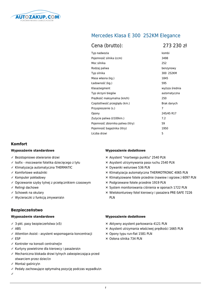 Mercedes Klasa E 300 252KM Elegance Cena (brutto): 273 230 zł Typ nadwozia kombi Pojemność silnika (ccm) 3498 Moc silnika 252 Rodzaj paliwa benzynowy Typ silnika 300 252KM Masa własna (kg.) 1845 Ładowność (kg.) 595 Klasa/segment wyższa średnia Typ skrzyni biegów automatyczna Prędkość maksymalna (km/h) 250 Częstotliwość przeglądu (km.) Brak danych Przyspieszenie (s.) 7 Opony 245/45 R17 Zużycie paliwa (l/100km.) 7.2 Pojemność zbiornika paliwa (litry) 59 Pojemność bagażnika (litry) 1950 Liczba drzwi 5 Komfort Wyposażenie standardowe Wyposażenie dodatkowe ✓ Bezstopniowe otwieranie drzwi ✕ Asystent "martwego punktu" 2540 PLN ✓ Isofix - mocowanie fotelika dziecięcego z tyłu ✕ Asystent utrzymywania pasa ruchu 2540 PLN ✓ Klimatyzacja automatyczna THERMATIC ✕ Dywaniki welurowe 536 PLN ✓ Komfortowe wskaźniki ✕ Klimatyzacja automatyczna THERMOTRONIC 4065 PLN ✓ Komputer pokładowy ✕ Klimatyzowane fotele przednie (nawiew i ogrzew.) 6097 PLN ✓ Ogrzewanie szyby tylnej z przełącznikiem czasowym ✕ Podgrzewane fotele przednie 1919 PLN ✓ Relingi dachowe ✕ System monitorowania ciśnienia w oponach 1722 PLN ✓ Schowek na okulary ✕ Wielokonturowy fotel kierowcy i pasażera PRE-SAFE 7226 ✓ Wycieraczki z funkcją zmywania\n PLN Bezpieczeństwo Wyposażenie standardowe Wyposażenie dodatkowe ✓ 3-pkt. pasy bezpieczeństwa (x5) ✕ Aktywny asystent parkowania 4121 PLN ✓ ABS ✕ Asystent utrzymania właściwej prędkości 1665 PLN ✓ Attention Assist - asystent wspomagania koncentracji ✕ Opony typu run-flat 1581 PLN ✓ ESP ✕ Osłona silnika 734 PLN ✓ Kontroler na konsoli centralnej\n ✓ Kurtyny powietrzne dla kierowcy i pasażera\n ✓ Mechaniczna blokada drzwi tylnych zabezpieczająca przed otwarciem przez dzieci\n ✓ Montaż gaśnicy\n ✓ Pedały zachowujące optymalną pozycję podczas wypadku\n ✓ 1 PRE-SAFE\n 2 ✓ System wspomagający gwałtowne hamowanie (BAS)\n ✓ Trójkąt ostrzegawczy\n ✓ Tylne światła przeciwmgłowe\n ✓ Układ antypoślizgowy (ASR)\n ✓ Wzmocnienia boczne\n ✓ Zabezpieczenie wnętrza pojazdu\n Dodatki Wyposażenie standardowe Wyposażenie dodatkowe ✓ 4-lamelowa osłona chłodnicy w kolorze srebrnym ✕ AIRMATIC 6379 PLN ✓ 4-ramienne, wielofunkcyjne koło kierownicy ✕ Aktywny asystent utrzymania pasa ruchu 2540 PLN ✓ 5 zagłówków indywidualnie regulowanych ✕ Becker Map Pilot 4912 PLN ✓ ADAPTIVE BRAKE z funkcją HOLD ✕ Becker Map Pilot - przygotowanie 1919 PLN ✓ Alarm antywłamaniowy (EDW) ✕ COMAND Online 14961 PLN ✓ Apteczka ✕ COMAND Online ze zmieniarką DVD 16654 PLN ✓ Asystent świateł przednich ✕ Dach szklany 6351 PLN ✓ Audio 20 CD ✕ EASY-PACK - system do mocowania bagażu 1665 PLN ✓ Automatyczna skrzynia biegów (7) ✕ Górna część deski rozdzielczej obszyta skórą ARTICO 3387 ✓ Bezpośredni wtrysk paliwa ✕ Hak holowniczy z funkcją stabilizacji ESP 5024 PLN ✓ Centralny zamek z blokadą od wewnątrz ✕ ILS - Dynamiczne reflektory w technologii LED 8186 PLN ✓ DIRECT CONTROL - podwozie ✕ InCar Hotspot - router Wi-Fi 2823 PLN ✓ DIRECT SELECT Elektroniczna regulacja ✕ Kamera 360° 3952 PLN ✓ display with TFT technology ✕ Kamera cofania 2258 PLN ✓ Dzwignia zmiany begów DIRECT SELECT ✕ KEYLESS-GO 5024 PLN ✓ EASY-PACK Rear sill protector ✕ Kierownica w drewnie i skórze 3331 PLN ✓ Elektryczne sterowanie szyb (x4) ✕ Ogrzewanie postojowe 7743 PLN ✓ Fully electrically adjustable front seats ✕ Opony zimowe (zamiast letnich) 1101 PLN ✓ Hamulec postojowy ✕ Panoramiczny dach szklany 9992 PLN ✓ Immobilizer ✕ Pilot radioodtwarzacza lub systemu COMAND 677 PLN ✓ Koło dojazdowe (minispare) ✕ Podgrzewane dysze spryskiwaczy szyby przedniej 960 PLN ✓ Lusterka zewnętrzne podgrzewane i elek. regulowane ✕ podsufitka designo DINAMICA w kolorze beżu makadamii PLN 9033 PLN ✓ Map pockets ✕ podsufitka designo DINAMICA w kolorze szarości alpaki 9033 PLN ✓ Mechaniczna regulacja kierownicy w pionie ✕ Podświetlane listwy progowe w przednich drzwiach 3218 PLN ✓ Mocowanie bagażu - 6 uchwytów ✕ Podwójny uchwyt na kubek 367 PLN ✓ Mocowanie ładunku w przestrzeni bagażowej ✕ Pogrzewane fotele tylne 1919 PLN ✓ Obrotomierz ✕ Popielniczka 254 PLN ✓ Oświetlenie dolnej przestrzeni wnętrza ✕ Poprzeczki do mocowania bagażników dachowych 960 PLN ✓ Oświetlenie przy wysiadaniu i św. odblaskowe ✕ Przyciemniane tylne szyby 2202 PLN ✓ Oświetlenie wnętrza Ambiente z regul. natężenia ✕ Przygotowanie do montażu telefonu komórkowego 2202 PLN ✓ Ozdobna listwa przyokienna, czarny, z połyskiem ✕ Radio Audio 20 ze zmieniarką 1694 PLN ✓ Pakiet oświetlenia wnętrza pojazdu ✕ Składana ławka w części bagażowej, obita tkaniną 5137 PLN ✓ Pakiet zabezpieczenia pojazdu ✕ SPLITVIEW 5645 PLN ✓ Poduszka powietrzna chroniąca kolana ✕ Sportowa kierownica z elementami dekoracyjnymi 3331 PLN ✓ Poduszka powietrzna kierowcy i pasażera ✕ System automatycznego regulowania świateł drogowych 565 PLN 3 ✓ Podłokietnik ze schowkiem ✕ System dźwiękowy Harman/Kardon Logic7 4742 PLN ✓ Power steering ✕ System multimedialny z tyłu pojazdu 11009 PLN ✓ Przyciemniane światła tylne i 3. światło stopu ✕ System multimedialny z tyłu pojazdu z ekranem 4742 PLN ✓ Reflektory bazujące na technologii LED ✕ System nagłaśniający Bang & Olufsen BeoSound AMG ✓ Regulacja położenia reflektorów ✕ System rozpoznawania fotelika dziecięcego (AKSE) 282 PLN ✓ Schowek w podłokietniku ✕ Wielofunkcyjne podgrzewane koło kierownicy 1468 PLN ✓ Schowki pod przednimi fotelami ✕ Worek na narty 1073 PLN ✓ Sidebag ✕ Zbiornik paliwa o zwiększonej pojemności (80 litrów) 565 ✓ Składane oparcie tylnej kanapy ✕ Zdalne PLN otwieranie drzwi garażowych 1270 PLN ✓ Stalowe listwy progowe ✕ Zintegrowane foteliki dziecięce (tylna kanapa) 1553 PLN ✓ Sterowana elektrycznie roleta szyby tylnej