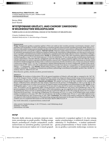 Medycyna Pracy, 2006;57(3):235 — 238 © Instytut Medycyny Pracy im. prof. J. Nofera w Łodzi www.imp.lodz.pl/oficyna 235 Bartosz Bilski Jacek Wysocki WYSTĘPOWANIE GRUŹLICY, JAKO CHOROBY ZAWODOWEJ W WOJEWÓDZTWIE WIELKOPOLSKIM TUBERCULOSIS AS AN OCCUPATIONAL DISEASE IN THE PROVINCE OF WIELKOPOLSKA Z Katedry Profilaktyki Zdrowotnej Akademii Medycznej im. K. Marcinkowskiego w Poznaniu Streszczenie Wstęp. Występowanie gruźlicy w populacji ogólnej w Polsce jest nadal na dość wysokim poziomie w porównaniu z krajami „starej” piętnastki Unii Europejskiej. W Polsce zachorowania na zawodową gruźlicę dotyczą przede wszystkim personelu służby zdrowia. Celem pracy była analiza występowania przypadków gruźlicy jako choroby zawodowej w województwie wielkopolskim z uwzględnieniem największej placówki o tym profilu w regionie. Materiał i metody. Dokonano analizy danych zawartych w kartach stwierdzenia choroby zawodowej, gromadzonych przez Państwową Inspekcję Sanitarną dla województwa wielkopolskiego oraz dotyczących zachorowalności na gruźlicę i zatrudnienia pracowników pochodzących z największej placówki służby zdrowia z terenu województwa wielkopolskiego o profilu pulmonologiczno-ftyzjatrycznym. Wyniki. W Wielkopolsce w latach 1999–2003 stwierdzono ogółem 40 przypadków zawodowej gruźlicy, w tym 7 (17,5%) wśród mężczyzn i 33 (82,5%) wśród kobiet. W tym okresie gruźlica nie była istotnie statystycznie częstsza wśród lekarzy (18,6/100 000/rok) i pielęgniarek (26,9/100 000/rok) aniżeli w populacji ogólnej (20,4/100 000/rok). Istotny czynnik wpływający na częstość rozpoznań zawodowej gruźlicy stanowił wiek. Charakterystyczne były rozpoznania tej choroby wśród stosunkowo młodych pielęgniarek (średnia wieku w momencie rozpoznania choroby zawodowej: 34,4 ± 6,5 lat) oraz starszych wiekiem i stażem pracy lekarzy (53,8 ± 12,1 lat). W największym szpitalu pulmonologicznym na terenie Wielkopolski (średnia liczba zatrudnionych w latach 1997–2003 to 419 osób) średnia zachorowalność wynosiła w tym okresie 4,7 przypadków na 1000 zatrudnionych/rok (lekarze – 7,1; pielęgniarki – 3,9). Wnioski. Wyniki analizy świadczą o wpływie wieku, płci i miejsca pracy na występowanie gruźlicy o podłożu zawodowym. W publikacji są dyskutowane problemy epidemiologii stwierdzanych przypadków gruźlicy jako choroby zawodowej. Med. Pr., 2006;57(3):235–238 Słowa kluczowe: gruźlica, choroba zawodowa, personel medyczny Abstract Background: The incidence of tuberculosis (TB) in the general population of Poland is still quite high as compared to the “old” Fifteen of the European Union. In Poland, occupational TB has recently been diagnosed almost entirely among medical personnel and social workers. The aim of the study was to analyze TB epidemiology in the province of Wielkopolska, taking account of the largest pulmonological hospital in this region. Material and Methods: The analysis was based on the data contained in the occupational disease certification forms collected by the State Sanitary Inspection for the province of Wielkopolska as well as on the data on TB incidence and employment of workers derived from the largest hospital of pulmonological and phthisiological profile. Results: In the Wielkopolska region, 7 cases (17.5%) of occupational TB in men and 33 cases (82.5%) in women were found in 1999–2003. In those years, TB incidence was not significantly higher among physicians (18.6/100,000/year) and nurses (26.9/100,000/year) than in the general population (20.4/100,000/year) of this region. In the study population, age was a significant factor influencing the incidence of occupational TB. Nurses were the occupational group that was at particular high risk of TB at the young age (mean, 34.4 ± 6.5 years). Physicians fell ill much later – the mean age of diagnosing TB in this group was 53.8 ± 12.1 years. In the hospital under study (median number of employees in the years 1997–2003 was 419 persons), the median morbidity from TB was 4.7 cases/1000 employees/year; 7.1/1000 physicians/year; and 3.9/nurses/year in 1997–2003. Conclusions: The results of this analysis confirmed the influence of age and character of the medical institution on TB epidemiology among medical personnel. In this paper the problems of epidemiology of certified cases of occupational tuberculosis are also discussed. Med Pr 2006;57(3):235–8 Key words: tuberculosis, occupational disease, medical staff Adres autorów: Smoluchowskiego 11, 60-179 Poznań, e-mail: [email protected] Nadesłano: 15.09.2005 Zatwierdzono: 9.02.2006 WSTĘP Placówki służby zdrowia są istotnym miejscem narażenia zawodowego na prątki gruźlicy. Według szeregu danych, pochodzących z krajów europejskich, ryzyko zachorowania na zawodową gruźlicę u personelu medycznego zazwyczaj jest większe niż w innych grupach Medycyna Pracy 3_2006.indd 235 zawodowych i w populacji ogólnej (1–6), choć istnieją analizy przedstawiające w niektórych krajach sytuację odmienną (7). Przykładowo – w analizie epidemiologicznej przeprowadzonej w Turcji ryzyko zachorowania na gruźlicę u personelu medycznego oceniono na 2006-06-08 11:22:31 236 B. Bilski, J. Wysocki 2,71 razy większe niż w populacji generalnej (1), przy zachorowalności w populacji ogólnej w tym kraju wynoszącej 35,4 przypadków/100 000 mieszkańców/ rok (1). Z kolei w kraju bliższym nam geograficznie – Estonii gruźlica występuje około 1,5 do 3 razy częściej wśród personelu służby zdrowia w porównaniu z populacją ogólną (średnio 91 przypadków/100 000 mieszkańców/rok) (3). Oceniono, że w szpitalach pulmonologicznych w tym kraju ryzyko zachorowania dla personelu medycznego jest aż 30–90 razy większe niż w populacji ogólnej. Natomiast w Serbii wśród pracowników belgradzkiego Instytutu Chorób Płuc ryzyko zachorowania na gruźlicę w ostatnich latach było 7,6 razy większe ni