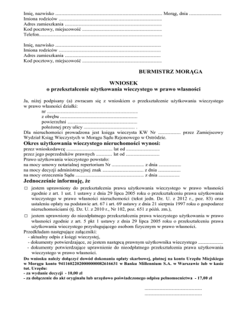 Imię, nazwisko ...................................................................................... Morąg, dnia .......................... Imiona rodziców ................................................................................... Adres zamieszkania .............................................................................. Kod pocztowy, miejscowość ................................................................ Telefon................................................................................................... Imię, nazwisko ..................................................................................... Imiona rodziców .................................................................................. Adres zamieszkania ............................................................................. Kod pocztowy, miejscowość ................................................................ BURMISTRZ MORĄGA WNIOSEK o przekształcenie użytkowania wieczystego w prawo własności Ja, niżej podpisany (a) zwracam się z wnioskiem o przekształcenie użytkowania wieczystego w prawo własności działki: nr ......................................................................... z obrębu .............................................................. powierzchni ........................................................ położonej przy ulicy ......................................... . Dla nieruchomości prowadzona jest księga wieczysta KW Nr .................. przez Zamiejscowy Wydział Ksiąg Wieczystych w Morągu Sądu Rejonowego w Ostródzie. Okres użytkowania wieczystego nieruchomości wynosi: przez wnioskodawcę ..................................... lat od ........................... przez jego poprzedników prawnych ............. lat od ........................... Prawo użytkowania wieczystego powstało: na mocy umowy notarialnej repertorium Nr .......................... z dnia .................. na mocy decyzji administracyjnej znak ................................. z dnia .................. na mocy orzeczenia Sądu ....................................................... z dnia ................. Jednocześnie informuję, że □ jestem uprawniony do przekształcenia prawa użytkowania wieczystego w prawo własności zgodnie z art. 1 ust. 1 ustawy z dnia 29 lipca 2005 roku o przekształceniu prawa użytkowania wieczystego w prawo własności nieruchomości (tekst jedn. Dz. U. z 2012 r., poz. 83) oraz ustaleniu opłaty na podstawie art. 67 i art. 69 ustawy z dnia 21 sierpnia 1997 roku o gospodarce nieruchomościami (tj. Dz. U. z 2010 r., Nr 102, poz. 651 z późń. zm.), □ jestem uprawniony do nieodpłatnego przekształcenia prawa wieczystego użytkowania w prawo własności zgodnie z art. 5 pkt 1 ustawy z dnia 29 lipca 2005 roku o przekształceniu prawa użytkowania wieczystego przysługującego osobom fizycznym w prawo własności. Przedkładam następujące załączniki: - aktualny odpis z księgi wieczystej, - dokumenty potwierdzające, ze jestem następcą prawnym użytkownika wieczystego .................... - dokumenty potwierdzające uprawnienie do nieodpłatnego przekształcenia prawa użytkowania wieczystego w prawo własności. Do wniosku należy dołączyć dowód dokonania opłaty skarbowej, płatnej na konto Urzędu Miejskiego w Morągu konto 94116022020000000082616631 w Banku Millennium S.A. w Warszawie lub w kasie tut. Urzędu: - za wydanie decyzji - 10,00 zł - za dołączenie do akt oryginału lub urzędowo poświadczonego odpisu pełnomocnictwa - 17,00 zł .............................................. ..............................................