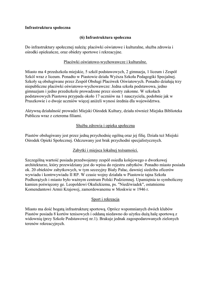 Infrastruktura społeczna (6) Infrastruktura społeczna Do infrastruktury społecznej należą: placówki oświatowe i kulturalne, służba zdrowia i ośrodki opiekuńcze, oraz obiekty sportowe i rekreacyjne. Placówki oświatowo-wychowawcze i kulturalne. Miasto ma 4 przedszkola miejskie, 5 szkól podstawowych, 2 gimnazja, 1 liceum i Zespół Szkól wraz z liceum. Ponadto w Piastowie działa Wyższa Szkoła Pedagogiki Specjalnej. Szkoły są obsługiwane przez Zespół Obsługi Placówek Oświatowych. Ponadto działają trzy niepubliczne placówki oświatowo-wychowawcze: Jedna szkoła podstawowa, jedno gimnazjum i jedno przedszkole prowadzone przez siostry zakonne. W szkołach podstawowych Piastowa przypada około 17 uczniów na 1 nauczyciela, podobnie jak w Pruszkowie i o dwoje uczniów więcej aniżeli wynosi średnia dla województwa. Aktywną działalność prowadzi Miejski Ośrodek Kultury, działa również Miejska Biblioteka Publicza wraz z czterema filiami. Służba zdrowia i opieka społeczna Piastów obsługiwany jest przez jedną przychodnię ogólną oraz jej filię. Działa też Miejski Ośrodek Opieki Społecznej. Odczuwany jest brak przychodni specjalistycznych. Zabytki i miejsca lokalnej tożsamości. Szczególną wartość posiada przedwojenny zespół osiedla kolejowego o dworkowej architekturze, który przewidziany jest do wpisu do rejestru zabytków. Ponadto miasto posiada ok. 20 obiektów zabytkowych, w tym secesyjny Biały Pałac, dawniej siedziba oficerów wywiadu i kontrwywiadu II RP. W czasie wojny działała w Piastowie tajna Szkoła Podhorążych i miasto było ważnym centrum Polski Podziemnej. Upamiętnia to symboliczny kamien poświęcony ge. Leopoldowi Okulickiemu, ps. "Niedżwiadek", ostatniemu Komendantowi Armii Krajowej, zamordowanemu w Moskwie w 1946 r. Sport i rekreacja Miasto ma dość bogatą infrastrukturę sportową. Oprócz wspomnianych dwóch klubów Piastów posiada 8 kortów tenisowych i oddaną niedawno do użytku dużą halę sportową z widownią (przy Szkole Podstawowej nr.1). Brakuje jednak zagospodarowanych zielonych terenów rekreacyjnych.