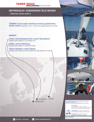 INDYWIDUALNY JEDNODNIOWY REJS MORSKI - OFERTA DLA CAŁEGO JACHTUT TERMINY: Od początku kwietnia do końca października. Każda sobota w godzinach 10.00 - 16.00 oraz do ustalenie dowolny inny termin. AKWENY: Zatoka Zachodniopomorska z portu Świnoujście: dostępne jachty: Delphia 37 i Sun Odyssey 379 Bałtyk z portu Kołobrzeg: dostępne jachty: Delphia 47, Bavaria 36 Cruiser Zatoka Gdańska z portu Gdynia: dostępne jachty: Bavaria 33 Cruiser, Bavaria 36 Cruiser, Bavaria 45 Cruiser KOŁOBRZEG ŚWINOUJŚCIE GDYNIA Cena jednodniowego rejsu za cały jacht: od 2 000 PLN Maksymalna liczba osób - 7. Końcowa cena zależy od wielkości jachtu oraz terminu. CENA ZAWIERA: jacht (sobota w godz. 10.00 - 16.00), usługę instruktora - skippera, opłaty portowe, paliwo do jachtu, poczęstunek (kawa herbata, ciastka). ubezpieczenie OPCJONALNIE: ubezpieczenie KL i NNW, można zamówić dodatkowo w trakcie procesu rezerwacji. OPCJONALNIE: sztormiak, można zamówić dodatkowo w trakcie procesu rezerwacji. terminarz i rezerwacje kontakt: [email protected] CENA NIE ZAWIERA: transportu do miejsca zaokrętowania i z miejsca wyokrętowania.