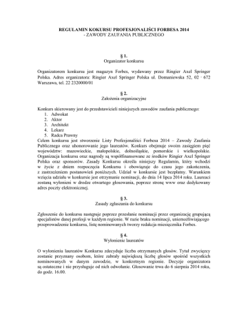 REGULAMIN KOKURSU PROFESJONALIŚCI FORBESA 2014 - ZAWODY ZAUFANIA PUBLICZNEGO § 1. Organizator konkursu Organizatorem konkursu jest magazyn Forbes, wydawany przez Ringier Axel Springer Polska. Adres organizatora: Ringier Axel Springer Polska ul. Domaniewska 52, 02‐672 Warszawa, tel. 22 2320000/01 § 2. Założenia organizacyjne Konkurs skierowany jest do przedstawicieli niniejszych zawodów zaufania publicznego: 1. Adwokat 2. Aktor 3. Architekt 4. Lekarz 5. Radca Prawny Celem konkursu jest stworzenie Listy Profesjonaliści Forbesa 2014 – Zawody Zaufania Publicznego oraz uhonorowanie jego laureatów. Konkurs obejmuje swoim zasięgiem pięć województw: mazowieckie, małopolskie, dolnośląskie, pomorskie i wielkopolskie. Organizacja konkursu oraz nagrody są współfinansowane ze środków Ringier Axel Springer Polska oraz sponsorów. Zasady Konkursu określa niniejszy Regulamin, który wchodzi w życie z dniem rozpoczęcia Konkursu i obowiązuje do czasu jego zakończenia, z zastrzeżeniem postanowień poniższych. Udział w konkursie jest bezpłatny. Warunkiem wzięcia udziału w konkursie jest otrzymanie nominacji, do dnia 14 lipca 2014 roku. Laureaci zostaną wyłonieni w drodze otwartego głosowania, poprzez stronę www oraz dedykowany adres poczty elektronicznej. § 3. Zasady zgłaszania do konkursu Zgłoszenie do konkursu następuje poprzez przesłanie nominacji przez organizację grupującą specjalistów danej profesji w każdym regionie. W razie braku nominacji, uniemożliwiającego przeprowadzenie konkursu, listę nominowanych tworzy redakcja miesięcznika Forbes. § 4. Wyłonienie laureatów O wyłonieniu laureatów Konkursu zdecyduje liczba otrzymanych głosów. Tytuł zwycięzcy zostanie przyznany osobom, które zabrały największą liczbę głosów spośród wszystkich nominowanych w danym zawodzie, w konkretnym regionie. Decyzje organizatora są ostateczne i nie przysługuje od nich odwołanie. Głosowanie trwa do 6 sierpnia 2014 roku, do godz. 16.00. § 5. Warunki ogólne Nadesłanie nominacji jest jednoznaczne z zaakceptowaniem niniejszego regulaminu. Organizator zastrzega sobie prawo do jego interpretacji. § 6. Nagrody Nagrody w postaci dyplomów oraz statuetek zostaną wręczone podczas uroczystej gali, na której ogłoszone zostaną wyniki rankingu. Gale wręczenia nagród odbędą się w pięciu miastach: 1. Gdańsku 2. Krakowie 3. Poznaniu 4. Warszawie 5. Wrocławiu O terminie oraz miejscu gali organizator poinformuje najpóźniej na 2 tygodnie przed spotkaniem. § 7. Postanowienia końcowe Wyniki rankingu zostaną opublikowane na stronie internetowej poświęconej projektowi znajdującej się pod adresem www.profesjonalisciforbesa.pl a także w magazynie Forbes nr 10/14 oraz wszystkich mediach promujących konkurs. Niniejszy regulamin zamieszczony jest pod adresem www.profesjonalisciforbesa.pl.
