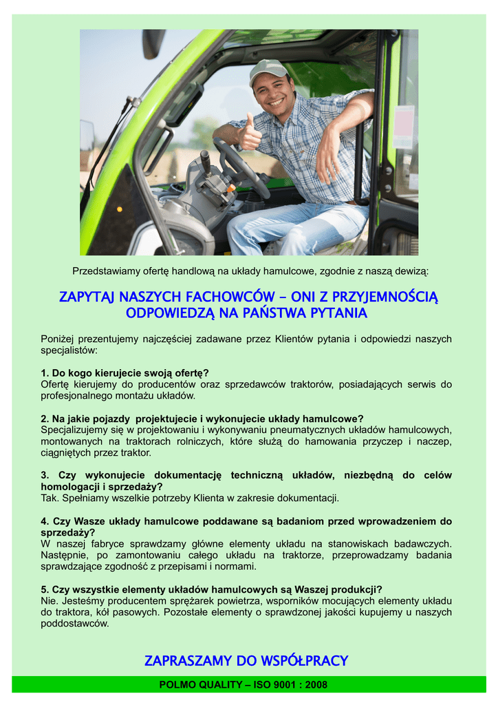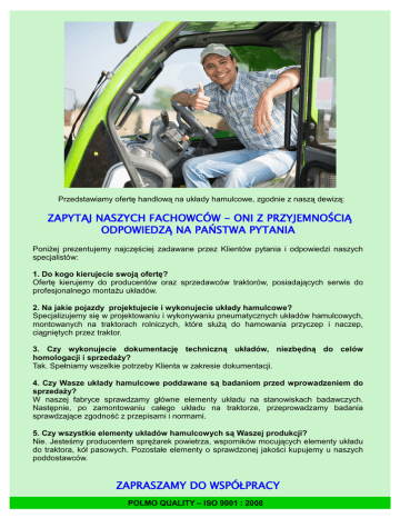 Przedstawiamy ofertę handlową na układy hamulcowe, zgodnie z naszą dewizą: ZAPYTAJ NASZYCH FACHOWCÓW - ONI Z PRZYJEMNOŚCIĄ ODPOWIEDZĄ NA PAŃSTWA PYTANIA Poniżej prezentujemy najczęściej zadawane przez Klientów pytania i odpowiedzi naszych specjalistów: 1. Do kogo kierujecie swoją ofertę? Ofertę kierujemy do producentów oraz sprzedawców traktorów, posiadających serwis do profesjonalnego montażu układów. 2. Na jakie pojazdy projektujecie i wykonujecie układy hamulcowe? Specjalizujemy się w projektowaniu i wykonywaniu pneumatycznych układów hamulcowych, montowanych na traktorach rolniczych, które służą do hamowania przyczep i naczep, ciągniętych przez traktor. 3. Czy wykonujecie dokumentację techniczną układów, niezbędną do celów homologacji i sprzedaży? Tak. Spełniamy wszelkie potrzeby Klienta w zakresie dokumentacji. 4. Czy Wasze układy hamulcowe poddawane są badaniom przed wprowadzeniem do sprzedaży? W naszej fabryce sprawdzamy główne elementy układu na stanowiskach badawczych. Następnie, po zamontowaniu całego układu na traktorze, przeprowadzamy badania sprawdzające zgodność z przepisami i normami. 5. Czy wszystkie elementy układów hamulcowych są Waszej produkcji? Nie. Jesteśmy producentem sprężarek powietrza, wsporników mocujących elementy układu do traktora, kół pasowych. Pozostałe elementy o sprawdzonej jakości kupujemy u naszych poddostawców. ZAPRASZAMY DO WSPÓŁPRACY POLMO QUALITY – ISO 9001 : 2008