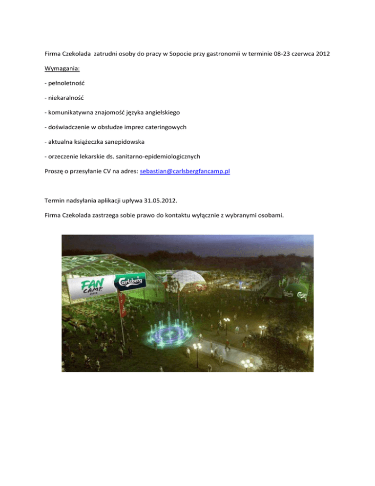 Firma Czekolada zatrudni osoby do pracy w Sopocie przy gastronomii w terminie 08-23 czerwca 2012 Wymagania: - pełnoletność - niekaralność - komunikatywna znajomość języka angielskiego - doświadczenie w obsłudze imprez cateringowych - aktualna książeczka sanepidowska - orzeczenie lekarskie ds. sanitarno-epidemiologicznych Proszę o przesyłanie CV na adres: [email protected] Termin nadsyłania aplikacji upływa 31.05.2012. Firma Czekolada zastrzega sobie prawo do kontaktu wyłącznie z wybranymi osobami.