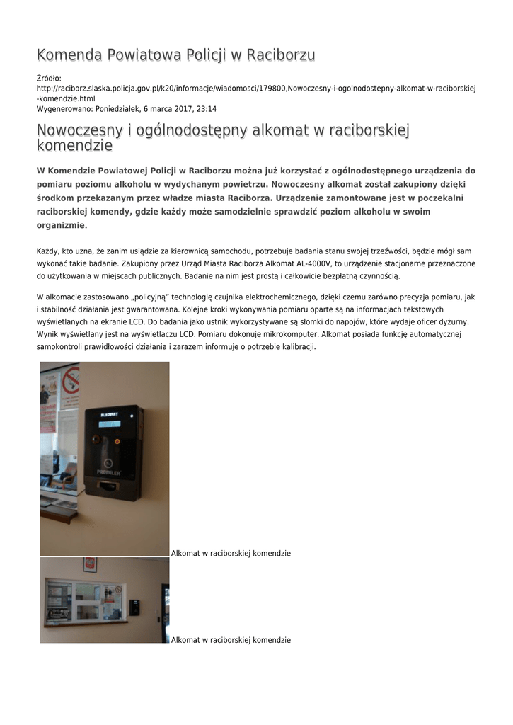 Komenda Powiatowa Policji w Raciborzu Źródło: http://raciborz.slaska.policja.gov.pl/k20/informacje/wiadomosci/179800,Nowoczesny-i-ogolnodostepny-alkomat-w-raciborskiej -komendzie.html Wygenerowano: Poniedziałek, 6 marca 2017, 23:14 Nowoczesny i ogólnodostępny alkomat w raciborskiej komendzie W Komendzie Powiatowej Policji w Raciborzu można już korzystać z ogólnodostępnego urządzenia do pomiaru poziomu alkoholu w wydychanym powietrzu. Nowoczesny alkomat został zakupiony dzięki środkom przekazanym przez władze miasta Raciborza. Urządzenie zamontowane jest w poczekalni raciborskiej komendy, gdzie każdy może samodzielnie sprawdzić poziom alkoholu w swoim organizmie. Każdy, kto uzna, że zanim usiądzie za kierownicą samochodu, potrzebuje badania stanu swojej trzeźwości, będzie mógł sam wykonać takie badanie. Zakupiony przez Urząd Miasta Raciborza Alkomat AL-4000V, to urządzenie stacjonarne przeznaczone do użytkowania w miejscach publicznych. Badanie na nim jest prostą i całkowicie bezpłatną czynnością. W alkomacie zastosowano „policyjną” technologię czujnika elektrochemicznego, dzięki czemu zarówno precyzja pomiaru, jak i stabilność działania jest gwarantowana. Kolejne kroki wykonywania pomiaru oparte są na informacjach tekstowych wyświetlanych na ekranie LCD. Do badania jako ustnik wykorzystywane są słomki do napojów, które wydaje oficer dyżurny. Wynik wyświetlany jest na wyświetlaczu LCD. Pomiaru dokonuje mikrokomputer. Alkomat posiada funkcję automatycznej samokontroli prawidłowości działania i zarazem informuje o potrzebie kalibracji. Alkomat w raciborskiej komendzie Alkomat w raciborskiej komendzie Alkomat w raciborskiej komendzie Ocena: 0/5 (0) Tweetnij