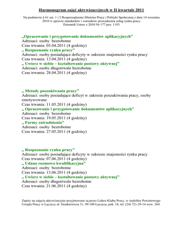 Harmonogram zajęć aktywizacyjnych w II kwartale 2011 Na podstawie § 61 ust. 1 i 2 Rozporządzenia Ministra Pracy i Polityki Społecznej z dnia 14 września 2010 w sprawie standardów i warunków prowadzenia usług rynku pracy Dziennik Ustaw z 2010 Nr 177 poz. 1193 „Opracowanie i przygotowanie dokumentów aplikacyjnych” Adresaci: osoby bezrobotne Czas trwania: 05.04.2011 (4 godziny) „ Rozpoznanie rynku pracy” Adresaci: osoby posiadające deficyty w zakresie znajomości rynku pracy Czas trwania: 13.04.2011 (4 godziny) „ Uwierz w siebie – kształtowanie postawy aktywnej” Adresaci: osoby długotrwale bezrobotne Czas trwania: 28.04.2011 (4 godziny) „ Metody poszukiwania pracy” Adresaci: osoby posiadające deficyt w zakresie poszukiwania pracy, osoby zmotywowane Czas trwania: 11.05.2011 (4 godziny) „ Opracowanie i przygotowanie dokumentów aplikacyjnych” Adresaci: osoby bezrobotne Czas trwania: 19.05.2011 (4 godziny) „ Formy zatrudnienia” Adresaci: osoby bezrobotne Czas trwania: 27.05.2011 (4 godziny) „ Rozpoznanie rynku pracy” Adresaci: osoby posiadające deficyty w zakresie znajomości rynku pracy Czas trwania: 07.06.2011 (4 godziny) „ Udana rozmowa kwalifikacyjna” Adresaci: osoby bezrobotne Czas trwania: 13.06.2011 (4 godziny) „ Uwierz w siebie – kształtowanie postawy aktywnej” Adresaci: osoby długotrwale bezrobotne Czas trwania: 21.06.2011 (4 godziny) Zapisy na zajęcia aktywizacyjne przyjmowane są przez Lidera Klubu Pracy, w siedzibie Powiatowego Urzędu Pracy w Łęczycy ul. Sienkiewicza 31, 99-100 Łęczyca, pok. 18, tel. (24) 721-29-14 wew. 264 Harmonogram „Rynek pracy” Adresaci: osoby posiadające deficyty w zakresie znajomości rynku pracy Czas trwania: 11.01.2011 (4 godziny) Autoprezentacja – rozmowa kwalifikacyjna” Adresaci: młodzież do 25 roku życia Czas trwania: 27.01.2011 (4 godziny) „ Uwierz w siebie – kształtowanie postawy aktywnej” Adresaci: osoby długotrwale bezrobotne Czas trwania: 08.02.2011 (4 godziny) „Rynek pracy” Adresaci: osoby posiadające deficyty w zakresie znajomości rynku pracy Czas trwania: 16.02.2011 (4 godziny) „ Formy zatrudnienia” Adresaci: osoby bezrobotne Czas trwania: 23.02.2011 (4 godziny) „Opracowanie i przygotowanie dokumentów aplikacyjnych” Adresaci: osoby bezrobotne Czas trwania: 02.03.2011 (4 godziny) „Rynek pracy” Adresaci: osoby posiadające deficyty w zakresie znajomości rynku pracy Czas trwania: 09.03.2011 (4 godziny) „Metody poszukiwania pracy” Adresaci: osoby posiadające deficyt w zakresie poszukiwania pracy, osoby zmotywowane Czas trwania: 16.03.2011 (4 godziny) „Portfolio kompetencji” Adresaci: osoby bezrobotne Czas trwania: 22.03.2011 (4 godziny) Zajęcia aktywizacyjne – „Opracowanie i przygotowanie dokumentów aplikacyjnych” L.p. 1 2 3 4 5 6 7 8 Imię i nazwisko Adres/telefon Nr decyzji Podpis 9 10 11 12 13 14 15 16 Zajęcia aktywizacyjne – „Rozpoznanie rynku pracy” L.p. 1 2 3 4 5 6 7 8 9 10 11 12 Imię i nazwisko Adres/telefon Nr decyzji Podpis 13 14 15 16 Zajęcia aktywizacyjne – „Uwierz w siebie – kształtowanie postawy aktywnej” L.p. 1 2 3 4 5 6 7 8 9 10 11 12 13 14 15 Imię i nazwisko Adres/telefon Nr decyzji Podpis 16 Zajęcia aktywizacyjne – „Metody poszukiwania pracy” L.p. 1 Imię i nazwisko Adres/telefon Nr decyzji Podpis 2 3 4 5 6 7 8 9 10 11 12 13 14 15 16 Zajęcia aktywizacyjne – „Formy zatrudnienia” L.p. 1 2 3 4 5 Imię i nazwisko Adres/telefon Nr decyzji Podpis 6 7 8 9 10 11 12 13 14 15 16 Zajęcia aktywizacyjne – „Udana rozmowa kwalifikacyjna” L.p. 1 2 3 4 5 6 7 8 Imię i nazwisko Adres/telefon Nr decyzji Podpis 9 10 11 12 13 14 15 16 Zajęcia aktywizacyjne – „ Opracowanie i przygotowanie dokumentów aplikacyjnych” 02.03.2011 L.p. 1 2 3 4 5 6 7 8 9 10 11 12 13 14 15 16 Imię i nazwisko Adres/telefon Nr decyzji Podpis Zajęcia aktywizacyjne – „ Rynek pracy” L.p. 1 2 Imię i nazwisko Adres/telefon Nr decyzji 09.03.2011 Podpis 3 4 5 6 7 8 9 10 11 12 13 14 15 16 Zajęcia aktywizacyjne – „Portfolio kompetencji” L.p. 1 2 Imię i nazwisko Adres/telefon Nr decyzji 22.03.2011 Podpis 3 4 5 6 7 8 9 10 11 12 13 14 15 16