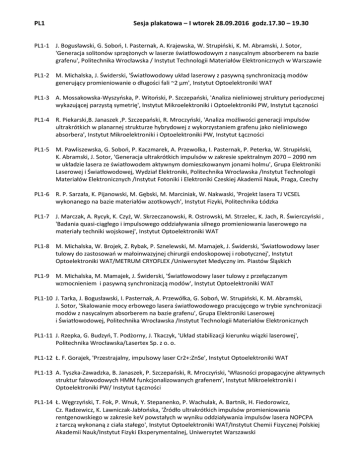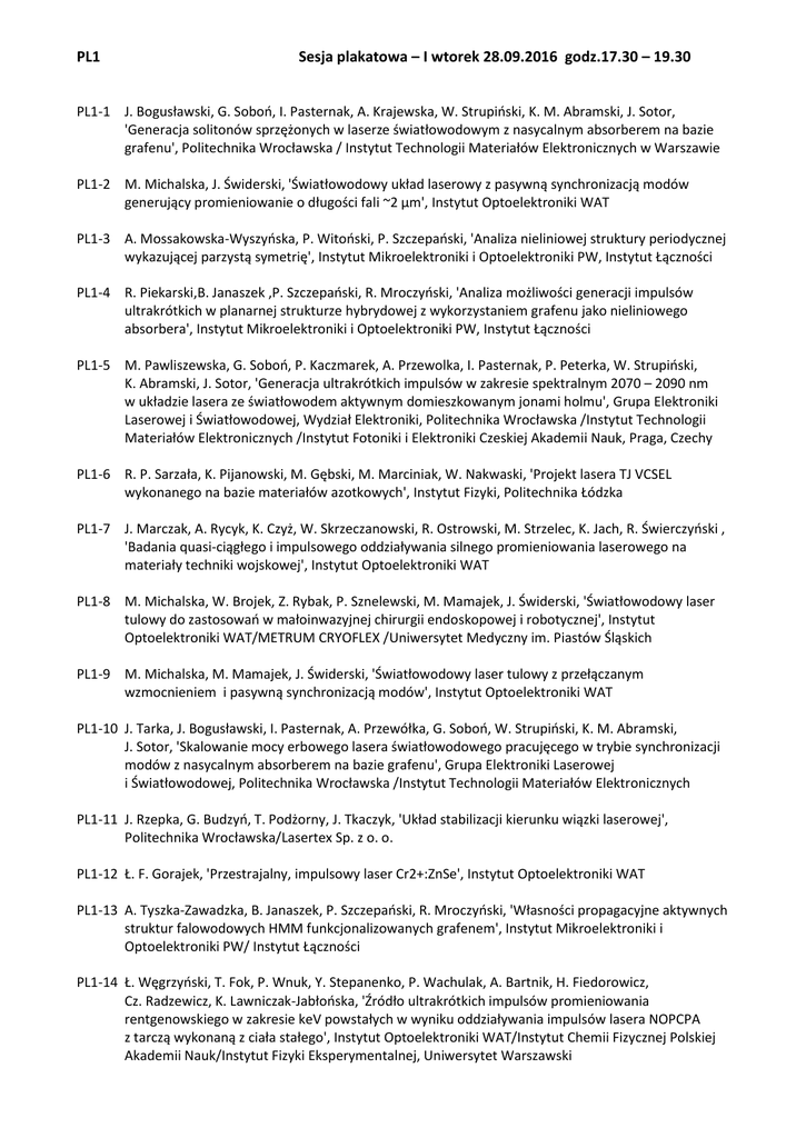 PL1 Sesja plakatowa – I wtorek 28.09.2016 godz.17.30 – 19.30 PL1-1 J. Bogusławski, G. Soboń, I. Pasternak, A. Krajewska, W. Strupiński, K. M. Abramski, J. Sotor, 'Generacja solitonów sprzężonych w laserze światłowodowym z nasycalnym absorberem na bazie grafenu', Politechnika Wrocławska / Instytut Technologii Materiałów Elektronicznych w Warszawie PL1-2 M. Michalska, J. Świderski, 'Światłowodowy układ laserowy z pasywną synchronizacją modów generujący promieniowanie o długości fali ~2 μm', Instytut Optoelektroniki WAT PL1-3 A. Mossakowska-Wyszyńska, P. Witoński, P. Szczepański, 'Analiza nieliniowej struktury periodycznej wykazującej parzystą symetrię', Instytut Mikroelektroniki i Optoelektroniki PW, Instytut Łączności PL1-4 R. Piekarski,B. Janaszek ,P. Szczepański, R. Mroczyński, 'Analiza możliwości generacji impulsów ultrakrótkich w planarnej strukturze hybrydowej z wykorzystaniem grafenu jako nieliniowego absorbera', Instytut Mikroelektroniki i Optoelektroniki PW, Instytut Łączności PL1-5 M. Pawliszewska, G. Soboń, P. Kaczmarek, A. Przewolka, I. Pasternak, P. Peterka, W. Strupiński, K. Abramski, J. Sotor, 'Generacja ultrakrótkich impulsów w zakresie spektralnym 2070 – 2090 nm w układzie lasera ze światłowodem aktywnym domieszkowanym jonami holmu', Grupa Elektroniki Laserowej i Światłowodowej, Wydział Elektroniki, Politechnika Wrocławska /Instytut Technologii Materiałów Elektronicznych /Instytut Fotoniki i Elektroniki Czeskiej Akademii Nauk, Praga, Czechy PL1-6 R. P. Sarzała, K. Pijanowski, M. Gębski, M. Marciniak, W. Nakwaski, 'Projekt lasera TJ VCSEL wykonanego na bazie materiałów azotkowych', Instytut Fizyki, Politechnika Łódzka PL1-7 J. Marczak, A. Rycyk, K. Czyż, W. Skrzeczanowski, R. Ostrowski, M. Strzelec, K. Jach, R. Świerczyński , 'Badania quasi-ciągłego i impulsowego oddziaływania silnego promieniowania laserowego na materiały techniki wojskowej', Instytut Optoelektroniki WAT PL1-8 M. Michalska, W. Brojek, Z. Rybak, P. Sznelewski, M. Mamajek, J. Świderski, 'Światłowodowy laser tulowy do zastosowań w małoinwazyjnej chirurgii endoskopowej i robotycznej', Instytut Optoelektroniki WAT/METRUM CRYOFLEX /Uniwersytet Medyczny im. Piastów Śląskich PL1-9 M. Michalska, M. Mamajek, J. Świderski, 'Światłowodowy laser tulowy z przełączanym wzmocnieniem i pasywną synchronizacją modów', Instytut Optoelektroniki WAT PL1-10 J. Tarka, J. Bogusławski, I. Pasternak, A. Przewółka, G. Soboń, W. Strupiński, K. M. Abramski, J. Sotor, 'Skalowanie mocy erbowego lasera światłowodowego pracujęcego w trybie synchronizacji modów z nasycalnym absorberem na bazie grafenu', Grupa Elektroniki Laserowej i Światłowodowej, Politechnika Wrocławska /Instytut Technologii Materiałów Elektronicznych PL1-11 J. Rzepka, G. Budzyń, T. Podżorny, J. Tkaczyk, 'Układ stabilizacji kierunku wiązki laserowej', Politechnika Wrocławska/Lasertex Sp. z o. o. PL1-12 Ł. F. Gorajek, 'Przestrajalny, impulsowy laser Cr2+:ZnSe', Instytut Optoelektroniki WAT PL1-13 A. Tyszka-Zawadzka, B. Janaszek, P. Szczepański, R. Mroczyński, 'Własności propagacyjne aktywnych struktur falowodowych HMM funkcjonalizowanych grafenem', Instytut Mikroelektroniki i Optoelektroniki PW/ Instytut Łączności PL1-14 Ł. Węgrzyński, T. Fok, P. Wnuk, Y. Stepanenko, P. Wachulak, A. Bartnik, H. Fiedorowicz, Cz. Radzewicz, K. Lawniczak-Jabłońska, 'Źródło ultrakrótkich impulsów promieniowania rentgenowskiego w zakresie keV powstałych w wyniku oddziaływania impulsów lasera NOPCPA z tarczą wykonaną z ciała stałego', Instytut Optoelektroniki WAT/Instytut Chemii Fizycznej Polskiej Akademii Nauk/Instytut Fizyki Eksperymentalnej, Uniwersytet Warszawski PL1-15 J. Marczak, R. Świerczyński, R. Ostrowski, A. Sarzyński, W. Skrzeczanowski, M. Strzelec, A. Rycyk, K. Czyż, 'Modelowanie procesów przetapiania tarcz metalowych impulsami lasera ciągłego działania z preimpulsami', Instytut Optoelektroniki WAT PL1-16 P. Kaczmarek, A. Wąż, G. Soboń, J. Sotor, K. M. Abramski, 'Układy synchronizacji fazy wiązek w światłowodowych wzmacniaczach do wykorzystania w układach koherentnego sumowania wiązek laserowych', Grupa Elektroniki Laserowej i Światłowodowej, Politechnika Wrocławska PL1-17 P. Kaczmarek, A. Wąż, G. Dudzik, D. Stachowiak, K. M. Abramski, 'Światłowodowy Wzmacniacz „eye-safe” do układów MOPA o mocy wyjściowej 20W', Politechnika Wrocławska/Wrocławskie Centrum Badań EIT+ PL1-18 M. Kaśków, W. Żendzian,' Pompowany poprzecznie laser Nd:YAG z samo-adaptującym rezonatorem', Instytut Optoelektroniki WAT PL1-19 R. Piekarski, B. Janaszek, M. Kieliszczyk, R. Piramidowicz, 'Analiza generacji w strukturze lasera światłowodowego z rezonatorem w konfiguracji typu theta', Instytut Mikroelektroniki i Optoelektroniki PW PL1-20 K. Krzempek, K. M.Abramski, 'Całkowicie światłowodowy laser z synchronizacją modów generujący impulsy o energii 2,1 µJ', Katedra Teorii Pola, Układów Elektronicznych i Optoelektroniki, Politechnika Wrocławska PL1-21 J. Kwiatkowski, W. Żendzian, J. K. Jabczyński, 'Pompowany diodowo laser Tm:YAP jako wydajne źródło pompujące na długości fali 1940 nm', Instytut Optoelektroniki WAT PL1-22 M. Kwaśny, A. Gietka, P. Kotowski, Z. Mierczyk, 'Źródła światła we współczesnej fotochemoterapii', Instytut Optoelektroniki WAT PL1-23 M. Naurecka, B. Sierakowski, M. Kwaśny, 'Badania własności spektroskopowych fotouczulaczy dla metody PDT', Instytut Optoelektroniki WAT PL1-24 A. Romiszewska, W. Kasprzycka, A. Padzik-Graczyk, 'Opracowanie metody analitycznej do oznaczania zawartości kwasu 5-ALA w maści stosowanej w terapii fotodynamicznej', Instytut Optoelektroniki WAT PL1-25 P. Szymczyk, G. Ziółkowski, A. Pawlak, B. Dybała, E. Chlebus, 'Wytwarzanie Biomechanicznych Struktur Funkcjonalnych za pomocą technologii Selective Laser Melting', Politechnika Wrocławska, Wydział Mechaniczny, Katedra Techno
