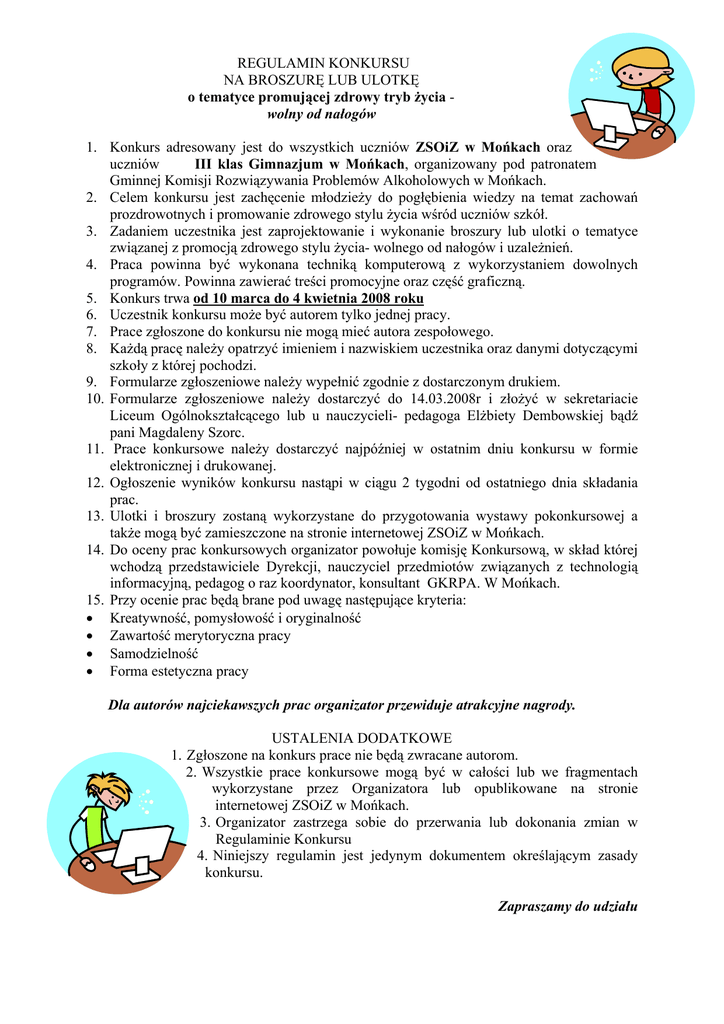 REGULAMIN KONKURSU NA BROSZURĘ LUB ULOTKĘ o tematyce promującej zdrowy tryb życia wolny od nałogów 1. Konkurs adresowany jest do wszystkich uczniów ZSOiZ w Mońkach oraz uczniów III klas Gimnazjum w Mońkach, organizowany pod patronatem Gminnej Komisji Rozwiązywania Problemów Alkoholowych w Mońkach. 2. Celem konkursu jest zachęcenie młodzieży do pogłębienia wiedzy na temat zachowań prozdrowotnych i promowanie zdrowego stylu życia wśród uczniów szkół. 3. Zadaniem uczestnika jest zaprojektowanie i wykonanie broszury lub ulotki o tematyce związanej z promocją zdrowego stylu życia- wolnego od nałogów i uzależnień. 4. Praca powinna być wykonana techniką komputerową z wykorzystaniem dowolnych programów. Powinna zawierać treści promocyjne oraz część graficzną. 5. Konkurs trwa od 10 marca do 4 kwietnia 2008 roku 6. Uczestnik konkursu może być autorem tylko jednej pracy. 7. Prace zgłoszone do konkursu nie mogą mieć autora zespołowego. 8. Każdą pracę należy opatrzyć imieniem i nazwiskiem uczestnika oraz danymi dotyczącymi szkoły z której pochodzi. 9. Formularze zgłoszeniowe należy wypełnić zgodnie z dostarczonym drukiem. 10. Formularze zgłoszeniowe należy dostarczyć do 14.03.2008r i złożyć w sekretariacie Liceum Ogólnokształcącego lub u nauczycieli- pedagoga Elżbiety Dembowskiej bądź pani Magdaleny Szorc. 11. Prace konkursowe należy dostarczyć najpóźniej w ostatnim dniu konkursu w formie elektronicznej i drukowanej. 12. Ogłoszenie wyników konkursu nastąpi w ciągu 2 tygodni od ostatniego dnia składania prac. 13. Ulotki i broszury zostaną wykorzystane do przygotowania wystawy pokonkursowej a także mogą być zamieszczone na stronie internetowej ZSOiZ w Mońkach. 14. Do oceny prac konkursowych organizator powołuje komisję Konkursową, w skład której wchodzą przedstawiciele Dyrekcji, nauczyciel przedmiotów związanych z technologią informacyjną, pedagog o raz koordynator, konsultant GKRPA. W Mońkach. 15. Przy ocenie prac będą brane pod uwagę następujące kryteria: • Kreatywność, pomysłowość i oryginalność • Zawartość merytoryczna pracy • Samodzielność • Forma estetyczna pracy Dla autorów najciekawszych prac organizator przewiduje atrakcyjne nagrody. USTALENIA DODATKOWE 1. Zgłoszone na konkurs prace nie będą zwracane autorom. 2. Wszystkie prace konkursowe mogą być w całości lub we fragmentach wykorzystane przez Organizatora lub opublikowane na stronie internetowej ZSOiZ w Mońkach. 3. Organizator zastrzega sobie do przerwania lub dokonania zmian w Regulaminie Konkursu 4. Niniejszy regulamin jest jedynym dokumentem określającym zasady konkursu. Zapraszamy do udziału