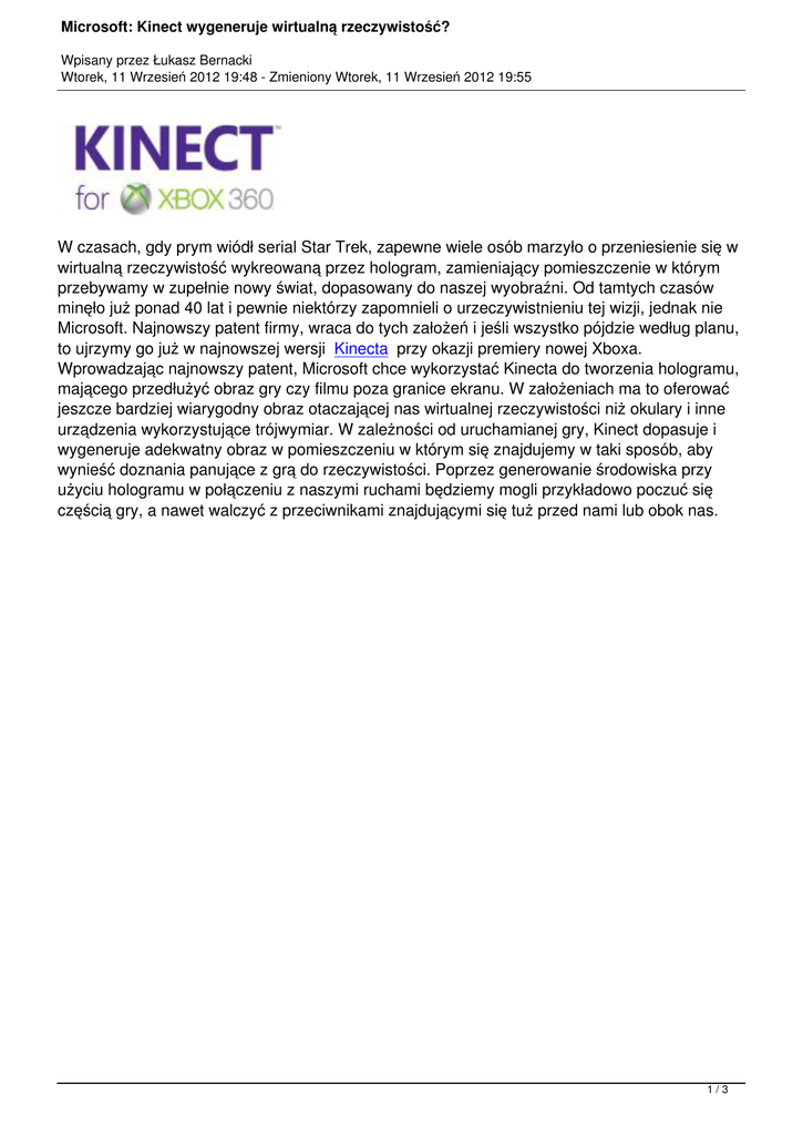 Microsoft: Kinect wygeneruje wirtualną rzeczywistość? Wpisany przez Łukasz Bernacki Wtorek, 11 Wrzesień 2012 19:48 - Zmieniony Wtorek, 11 Wrzesień 2012 19:55 W czasach, gdy prym wiódł serial Star Trek, zapewne wiele osób marzyło o przeniesienie się w wirtualną rzeczywistość wykreowaną przez hologram, zamieniający pomieszczenie w którym przebywamy w zupełnie nowy świat, dopasowany do naszej wyobraźni. Od tamtych czasów minęło już ponad 40 lat i pewnie niektórzy zapomnieli o urzeczywistnieniu tej wizji, jednak nie Microsoft. Najnowszy patent firmy, wraca do tych założeń i jeśli wszystko pójdzie według planu, to ujrzymy go już w najnowszej wersji Kinecta przy okazji premiery nowej Xboxa. Wprowadzając najnowszy patent, Microsoft chce wykorzystać Kinecta do tworzenia hologramu, mającego przedłużyć obraz gry czy filmu poza granice ekranu. W założeniach ma to oferować jeszcze bardziej wiarygodny obraz otaczającej nas wirtualnej rzeczywistości niż okulary i inne urządzenia wykorzystujące trójwymiar. W zależności od uruchamianej gry, Kinect dopasuje i wygeneruje adekwatny obraz w pomieszczeniu w którym się znajdujemy w taki sposób, aby wynieść doznania panujące z grą do rzeczywistości. Poprzez generowanie środowiska przy użyciu hologramu w połączeniu z naszymi ruchami będziemy mogli przykładowo poczuć się częścią gry, a nawet walczyć z przeciwnikami znajdującymi się tuż przed nami lub obok nas. 1/3 Microsoft: Kinect wygeneruje wirtualną rzeczywistość? Wpisany przez Łukasz Bernacki Wtorek, 11 Wrzesień 2012 19:48 - Zmieniony Wtorek, 11 Wrzesień 2012 19:55 2/3 Microsoft: Kinect wygeneruje wirtualną rzeczywistość? Wpisany przez Łukasz Bernacki Wtorek, 11 Wrzesień 2012 19:48 - Zmieniony Wtorek, 11 Wrzesień 2012 19:55 wirtualnej Opis Wszystko technologię poczekać. konkurencję? może rzeczywistości wskazuje Czy i nawet brzmi Bez faktycznie względu niczym wwięc przeciągu może na pomysł wyjęty na to,to mieć 2-3 żejaką zten możemy filmów lat, miejsce się otrzymamy choć sprawdzi s-f, doczekać do szybciej, jednak oficjalnej odpowiedź lubpatent się zostanie niżzapowiedzi gier nam ten pewne wykorzystujących się podchwycony jużwydaje. został jest, będziemy że oficjalnie uczestniczenie przez musieli omawianą zgłoszony. jeszcze w Źródło: Patentbolt 3/3