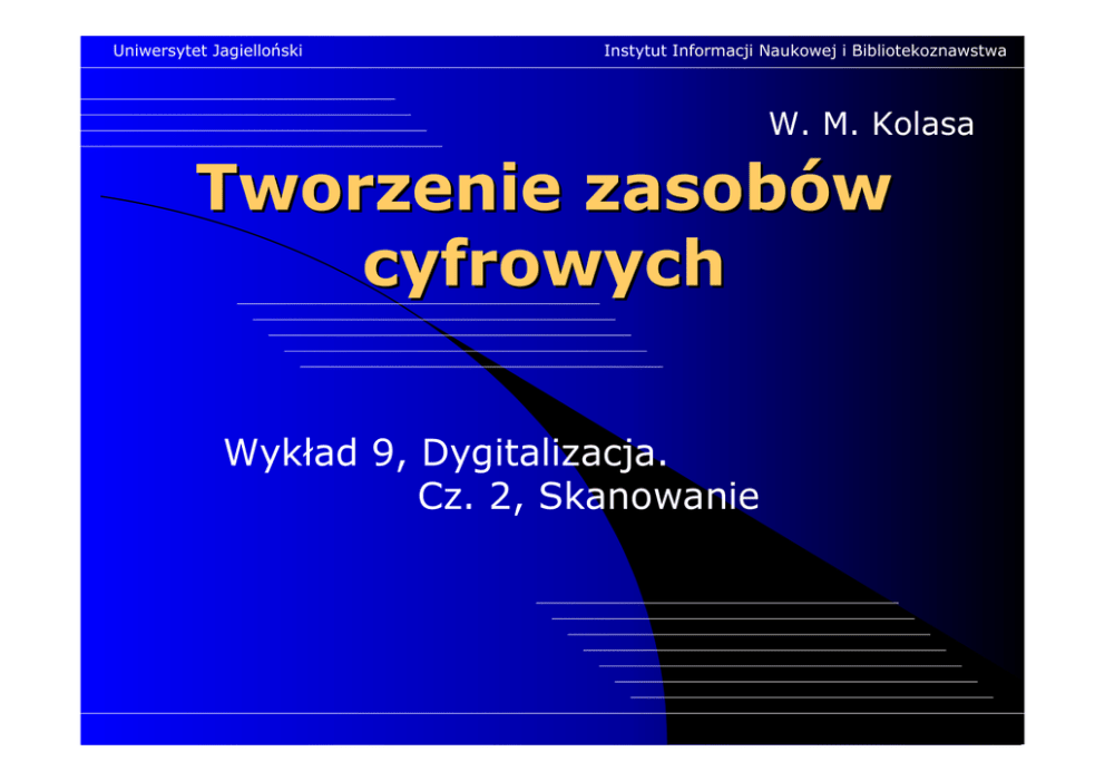 Uniwersytet Jagielloński Instytut Informacji Naukowej i Bibliotekoznawstwa W. M. Kolasa Tworzenie zasobów cyfrowych Wykład 9, Dygitalizacja. Cz. 2, Skanowanie Uniwersytet Jagielloński Instytut Informacji Naukowej i Bibliotekoznawstwa Technologia czy sztuka? W. M. Kolasa Uniwersytet Jagielloński Instytut Informacji Naukowej i Bibliotekoznawstwa Technologia W. M. Kolasa Uniwersytet Jagielloński Instytut Informacji Naukowej i Bibliotekoznawstwa Technologia W. M. Kolasa Uniwersytet Jagielloński Instytut Informacji Naukowej i Bibliotekoznawstwa Sztuka W. M. Kolasa Uniwersytet Jagielloński Instytut Informacji Naukowej i Bibliotekoznawstwa Profesja W. M. Kolasa Uniwersytet Jagielloński Instytut Informacji Naukowej i Bibliotekoznawstwa Wybrane parametry skanerów • Obsługiwany format (nośnika) - Od mikrofilmów do A0 (+ mat. transparentne) • Rozdzielczość optyczna (od ... do 12 000 dpi) • Głębia barwna (do 48 bitów) • Szybkość skanowania - od 50 s/strona do 1 s/strona • Funkcje dodatkowe (specjalne) - możliwości korekty parametrów skanowania - automatyzacja czynności - ergonomia (sposób umieszczenia skanowanego mat.) W. M. Kolasa Uniwersytet Jagielloński Instytut Informacji Naukowej i Bibliotekoznawstwa Technika skanowania • Obsługa wsadowa • Parametry skanowania • wsadowy retusz (korekta) W. M. Kolasa Uniwersytet Jagielloński Instytut Informacji Naukowej i Bibliotekoznawstwa Obsługa wsadowa Ogólne: • Program do automatyzacji zapisu skanów • System notacji (nazewnictwo, _, Aa, cyfry) gazeta_polska_1867_nr_078_s_0001 • Nośnik Problemy: • Pliki jedno- i wielostronicowe • Skanowanie stron nieparzystych • Skanowanie mat. w różnych trybach (bitonal, gray) W. M. Kolasa Uniwersytet Jagielloński Instytut Informacji Naukowej i Bibliotekoznawstwa Obsługa wsadowa W. M. Kolasa Uniwersytet Jagielloński Instytut Informacji Naukowej i Bibliotekoznawstwa Obsługa wsadowa Kompresja (zob. wykład o formatach archiw.) W. M. Kolasa Uniwersytet Jagielloński Instytut Informacji Naukowej i Bibliotekoznawstwa Przygotowanie do skanowania • Poprawne umiejscowienie materiału • Otoczenie (oświetlenia, kurz, zakłócenia magnetyczne) • Kalibracja urządzeń • Skanowanie wstępne Więcej: Leśniewski – rozdz. 4.8 W. M. Kolasa Ocena obrazów źródłowych - stan fizyczny charakterystyka tonalna naświetlenie ostrość nośnik Uniwersytet Jagielloński Instytut Informacji Naukowej i Bibliotekoznawstwa Wybrane parametry • Rozdzielczość (por. wykład o formatach archiwalnych) - bezpieczne 600 dpi • Tryb / głębia - kolor, odcienie szarości, bitonal • Filtry • autoton, unsharp masc, descreen • kontrast / nasycenie • korekta histogramowa • Skanowanie obiektów przestrzennych • Oświetlenie W. M. Kolasa Przeznaczenie skanu: druk czy monitor Rozdzielczość wyjścia dla monitorów Piksele: Rozmiar: W: 800x600 11,0’x8,3’ 72 ppi 1024x768 12,8’x9,6’ 80 ppi 1280x1024 13,8’x11,1’ 92 ppi 1600x1200 15,5’x11,6’ 103 ppi Uniwersytet Jagielloński Instytut Informacji Naukowej i Bibliotekoznawstwa Aplikacja - sterownik Dowolna aplikacja graficzna Sterownik (najczęściej TWAIN) W. M. Kolasa Uniwersytet Jagielloński Instytut Informacji Naukowej i Bibliotekoznawstwa Okno sterownika Canon W. M. Kolasa Uniwersytet Jagielloński Instytut Informacji Naukowej i Bibliotekoznawstwa Typowe filtry W. M. Kolasa Uniwersytet Jagielloński Instytut Informacji Naukowej i Bibliotekoznawstwa Autoton – descreen – unshap... W. M. Kolasa Uniwersytet Jagielloński Instytut Informacji Naukowej i Bibliotekoznawstwa Korekty W. M. Kolasa Uniwersytet Jagielloński Instytut Informacji Naukowej i Bibliotekoznawstwa Korekty W. M. Kolasa Uniwersytet Jagielloński Instytut Informacji Naukowej i Bibliotekoznawstwa Korekty W. M. Kolasa Uniwersytet Jagielloński Instytut Informacji Naukowej i Bibliotekoznawstwa Skan obiektu przestrzennego W. M. Kolasa Uniwersytet Jagielloński Instytut Informacji Naukowej i Bibliotekoznawstwa Inne zasady Jakość skanów zależy też od: - rodzaju papieru - rodzaju użytej czcionki - techniki druku - typu grafiki (np. bardzo zrastrowana, staloryty) Parametry skanowania prawie w każdym przypadku należy ustalać drogą eksperymentu. W. M. Kolasa Uniwersytet Jagielloński Instytut Informacji Naukowej i Bibliotekoznawstwa Skanowanie z mikrofilmów Urządzenie ze specjalnym podajnikiem - materiał transparentny - klatki w statywie Skanowanie bitonalne Przystawka do skanera płaskiego Szczegóły: Leśniewski – rodz. 3.2 W. M. Kolasa Uniwersytet Jagielloński Instytut Informacji Naukowej i Bibliotekoznawstwa Skanowanie z mikrofilmów W. M. Kolasa Uniwersytet Jagielloński Instytut Informacji Naukowej i Bibliotekoznawstwa Skanowanie z mikrofilmów W. M. Kolasa Uniwersytet Jagielloński Instytut Informacji Naukowej i Bibliotekoznawstwa Urządzenia W. M. Kolasa Uniwersytet Jagielloński Instytut Informacji Naukowej i Bibliotekoznawstwa Skanery profesjonalne Wybrane parametry skanerów Zeutschel - szybkość - 1 skan na sekundę - krótki czas naświetlania zimnym światłem, które nie oślepia i nie emituje ciepła oraz promieni UV; - brak refleksów przy skanowaniu powierzchni błyszczących; - skanowanie z maksymalną rozdzielczością 600 dpi dla formatu A2 - możliwość skanowania w kolorze, odcieniach szarości lub bitonalu; - obsługa standardowych formaty zapisu danych: TIFF, JPEG, PDF itp. - wbudowane funkcje korekty grafiki (Phoshop). W. M. Kolasa Uniwersytet Jagielloński Instytut Informacji Naukowej i Bibliotekoznawstwa Zeutschel OS 8000-3S W. M. Kolasa Uniwersytet Jagielloński Instytut Informacji Naukowej i Bibliotekoznawstwa Zeutschel OS 10000 A0 Pokaz: http://www.digital-center.pl/index1.php?v=os10000_jak_skanuje W. M. Kolasa Uniwersytet Jagielloński Instytut Informacji Naukowej i Bibliotekoznawstwa Zeutschel OS 12000 W. M. Kolasa Uniwersytet Jagielloński Instytut Informacji Naukowej i Bibliotekoznawstwa Hybrydy Urz