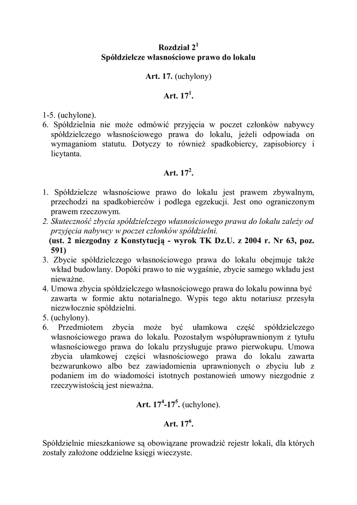 Rozdział 21 Spółdzielcze własnościowe prawo do lokalu Art. 17. (uchylony) Art. 171. 1-5. (uchylone). 6. Spółdzielnia nie może odmówić przyjęcia w poczet członków nabywcy spółdzielczego własnościowego prawa do lokalu, jeżeli odpowiada on wymaganiom statutu. Dotyczy to również spadkobiercy, zapisobiorcy i licytanta. Art. 172. 1. Spółdzielcze własnościowe prawo do lokalu jest prawem zbywalnym, przechodzi na spadkobierców i podlega egzekucji. Jest ono ograniczonym prawem rzeczowym. 2. Skuteczność zbycia spółdzielczego własnościowego prawa do lokalu zależy od przyjęcia nabywcy w poczet członków spółdzielni. (ust. 2 niezgodny z Konstytucją - wyrok TK Dz.U. z 2004 r. Nr 63, poz. 591) 3. Zbycie spółdzielczego własnościowego prawa do lokalu obejmuje także wkład budowlany. Dopóki prawo to nie wygaśnie, zbycie samego wkładu jest nieważne. 4. Umowa zbycia spółdzielczego własnościowego prawa do lokalu powinna być zawarta w formie aktu notarialnego. Wypis tego aktu notariusz przesyła niezwłocznie spółdzielni. 5. (uchylony). 6. Przedmiotem zbycia może być ułamkowa część spółdzielczego własnościowego prawa do lokalu. Pozostałym współuprawnionym z tytułu własnościowego prawa do lokalu przysługuje prawo pierwokupu. Umowa zbycia ułamkowej części własnościowego prawa do lokalu zawarta bezwarunkowo albo bez zawiadomienia uprawnionych o zbyciu lub z podaniem im do wiadomości istotnych postanowień umowy niezgodnie z rzeczywistością jest nieważna. Art. 174-175. (uchylone). Art. 176. Spółdzielnie mieszkaniowe są obowiązane prowadzić rejestr lokali, dla których zostały założone oddzielne księgi wieczyste. Art. 177. Jeżeli w wyniku ostatecznego rozliczenia kosztów budowy powstała różnica pomiędzy wysokością wstępnie ustalonego wkładu budowlanego a kosztami budowy lokalu, uprawniony albo zobowiązany z tego tytułu jest członek albo osoba niebędąca członkiem spółdzielni, którym w chwili dokonania tego rozliczenia przysługuje spółdzielcze własnościowe prawo do lokalu. Art. 178. 1-3. (uchylone). Art. 179. 1. Jeżeli spółdzielcze własnościowe prawo do lokalu przeszło na kilku spadkobierców, powinni oni, w terminie jednego roku od dnia otwarcia spadku, wyznaczyć spośród siebie pełnomocnika w celu dokonywania czynności prawnych związanych z wykonywaniem tego prawa, włącznie z zawarciem w ich imieniu umowy o przeniesienie własności lokalu. W razie bezskutecznego upływu tego terminu, na wniosek spadkobierców lub spółdzielni, sąd w postępowaniu nieprocesowym wyznaczy przedstawiciela. 2. W razie śmierci jednego z małżonków, którym spółdzielcze własnościowe prawo do lokalu przysługiwało wspólnie, przepis ust. 1 stosuje się odpowiednio. Art. 1710. W przypadku długotrwałych zaległości z zapłatą opłat, o których mowa w art. 4 ust. 1, 11 i 5, rażącego lub uporczywego wykraczania osoby korzystającej z lokalu przeciwko obowiązującemu porządkowi domowemu albo niewłaściwego zachowania tej osoby czyniącego korzystanie z innych lokali lub nieruchomości wspólnej uciążliwym, przepis art. 16 ustawy z dnia 24 czerwca 1994 r. o własności lokali stosuje się odpowiednio. Z żądaniem, o którym mowa w tym przepisie, występuje zarząd spółdzielni na wniosek rady nadzorczej. Art. 1711. 1. W wypadku wygaśnięcia spółdzielczego własnościowego prawa do lokalu spółdzielnia wypłaca osobie uprawnionej wartość rynkową lokalu. Przysługująca osobie uprawnionej wartość rynkowa, ustalona w sposób przewidziany w ust. 2, nie może być wyższa od kwoty, jaką spółdzielnia uzyska od osoby obejmującej lokal w wyniku przetargu przeprowadzonego przez spółdzielnię, zgodnie z postanowieniami statutu. 2. Z wartości rynkowej lokalu potrąca się niewniesioną przez osobę, której przysługiwało spółdzielcze własnościowe prawo do lokalu, część wkładu budowlanego, a w wypadku gdy nie został spłacony kredyt zaciągnięty przez spółdzielnię na sfinansowanie kosztów budowy danego lokalu - potrąca się kwotę niespłaconego kredytu wraz z odsetkami. 3. Warunkiem wypłaty wartości spółdzielczego własnościowego prawa do lokalu jest opróżnienie lokalu, o którym mowa w art. 7 ust. 1. Art. 1712. 1. W wypadkach gdy ustawa przewiduje wygaśnięcie spółdzielczego własnościowego prawa do lokalu, prawo to, jeżeli jest obciążone hipoteką, nie wygasa, lecz przechodzi z mocy prawa na spółdzielnię. 2. Prawo do lokalu, nabyte w sposób określony w ust. 1, spółdzielnia powinna zbyć w drodze przetargu w terminie 6 miesięcy. 3. Spółdzielnia jest obowiązana uiścić osobie uprawnionej wartość nabytego prawa po potrąceniu należności wymienionych w art. 1711 ust. 2 oraz z tytułu obciążenia hipoteką. Obowiązek spółdzielni powstaje dopiero z chwilą zbycia prawa w drodze przetargu. Art. 1713. Do egzekucji ze spółdzielczego własnościowego prawa do lokalu stosuje się odpowiednio przepisy o egzekucji z nieruchomości. Art. 1714. 1. Na pisemne żądanie członka lub osoby niebędącej członkiem spółdzielni, którym przysługuje spółdzielcze własnościowe prawo do lokalu, spółdzielnia mieszkaniowa jest obowiązana zawrzeć umowę przeniesienia własności lokalu po dokonaniu przez niego: 1) spłaty przypadających na ten lokal części zobowiązań spółdzielni związanych z budową, w tym w szczególności odpowiedniej części zadłużenia kredytowego spółdzielni wraz z odsetkami, 2) spłaty zadłużenia z tytułu opłat, o których mowa w art. 4 ust. 1. 1 1 . Spółdzielnia mieszkaniowa zawiera umowę, o której mowa w ust. 1, w terminie 6 miesięcy od dnia złożenia wniosku przez osobę uprawnioną, chyba że nieruchomość posiada nieuregulowany stan prawny w rozumieniu art. 113 ust. 6 ustawy z dnia 21 sierpnia 1997 r. o gospodarce nieruchomościami lub spółdzielni nie przysługuje prawo własności lub użytkowania wiecz