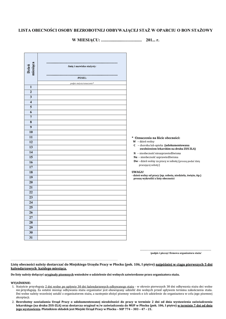LISTA OBECNOŚCI OSOBY BEZROBOTNEJ ODBYWAJĄCEJ STAŻ W OPARCIU O BON STAŻOWY Dzień miesiąca W MIESIĄCU: ........................................... 201... r. ........................................................................... /Imię i nazwisko stażysty/ ........................................................................... /PESEL/ podpis stażysty/oznaczenie* 1 2 3 4 5 6 7 8 9 10 11 12 13 14 15 16 17 18 19 20 21 22 23 24 25 26 27 28 29 30 31 * Oznaczenia na liście obecności: W – dzień wolny C – choroba lub opieka (udokumentowana zwolnieniem lekarskim na druku ZUS ZLA) N – nieobecność nieusprawiedliwiona Nu – nieobecność usprawiedliwiona Dw – dzień wolny za pracę w sobotę (proszę podać datę pracującej soboty) UWAGA! - dzień wolny od pracy (np. sobota, niedziela, święto, itp.) proszę wykreślić z listy obecności UWAGA! UWAGA ........................................................................... /podpis i pieczęć firmowa organizatora stażu/ Listę obecności należy dostarczać do Miejskiego Urzędu Pracy w Płocku (pok. 106, I piętro) najpóźniej w ciągu pierwszych 5 dni kalendarzowych każdego miesiąca. Do listy należy dołączyć oryginały pisemnych wniosków o udzielenie dni wolnych zatwierdzone przez organizatora stażu. WYJAŚNIENIE: 1. Stażyście przysługują 2 dni wolne po upływie 30 dni kalendarzowych odbywanego stażu - w okresie pierwszych 30 dni odbywania stażu dni wolne nie przysługują. Za ostatni miesiąc odbywania stażu organizator jest obowiązany udzielić dni wolnych przed upływem terminu zakończenia stażu. Dni wolne należy wcześniej ustalić z organizatorem stażu, a nastepnie złożyć pisemny wniosek o ich udzielenie do organizatora w celu jego pisemnej akceptacji. 2. Bezrobotny zawiadamia Urząd Pracy o udokumentowanej niezdolności do pracy w terminie 2 dni od dnia wystawienia zaświadczenia lekarskiego (na druku ZUS-ZLA) oraz dostarcza oryginał w/w zaświadczenia do MUP w Płocku (pok. 106, I piętro) w terminie 7 dni od dnia jego wystawienia. Płatnikiem składek jest Miejski Urząd Pracy w Płocku – NIP 774 – 303 – 47 – 21.