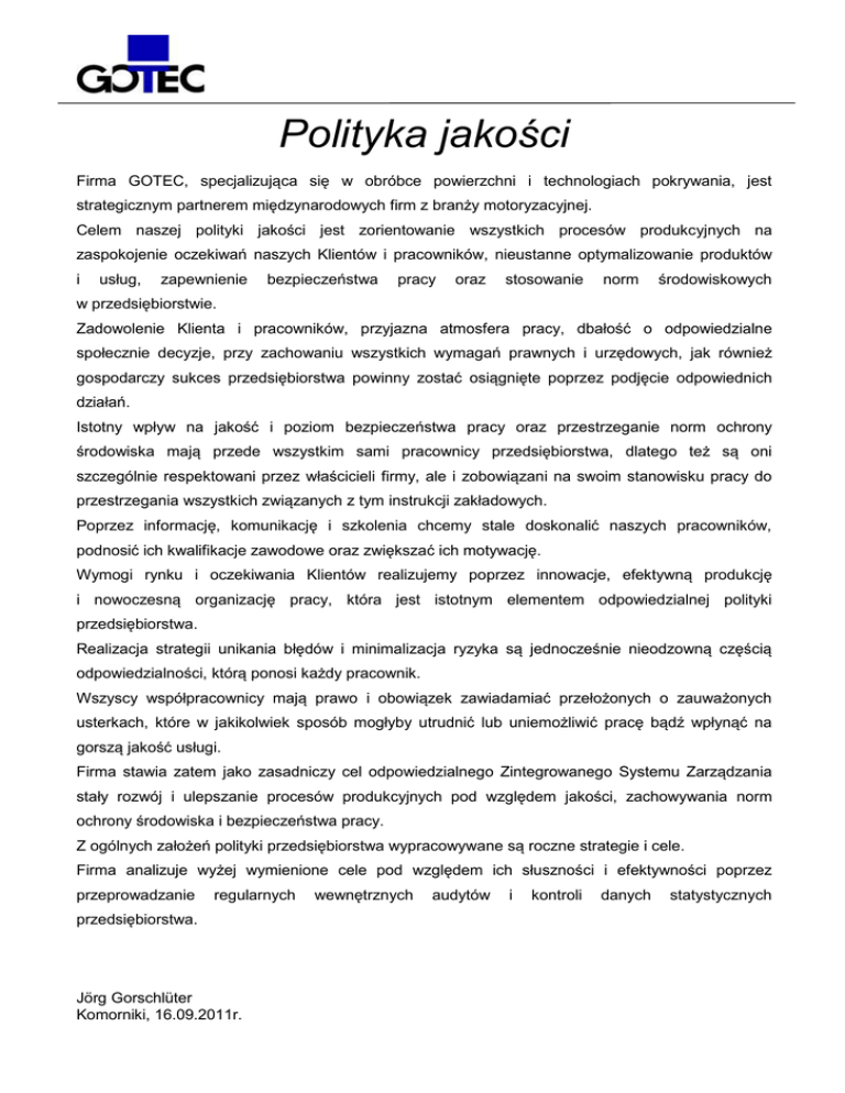 Polityka jakości Firma GOTEC, specjalizująca się w obróbce powierzchni i technologiach pokrywania, jest strategicznym partnerem międzynarodowych firm z branży motoryzacyjnej. Celem naszej polityki jakości jest zorientowanie wszystkich procesów produkcyjnych na zaspokojenie oczekiwań naszych Klientów i pracowników, nieustanne optymalizowanie produktów i usług, zapewnienie bezpieczeństwa pracy oraz stosowanie norm środowiskowych w przedsiębiorstwie. Zadowolenie Klienta i pracowników, przyjazna atmosfera pracy, dbałość o odpowiedzialne społecznie decyzje, przy zachowaniu wszystkich wymagań prawnych i urzędowych, jak również gospodarczy sukces przedsiębiorstwa powinny zostać osiągnięte poprzez podjęcie odpowiednich działań. Istotny wpływ na jakość i poziom bezpieczeństwa pracy oraz przestrzeganie norm ochrony środowiska mają przede wszystkim sami pracownicy przedsiębiorstwa, dlatego też są oni szczególnie respektowani przez właścicieli firmy, ale i zobowiązani na swoim stanowisku pracy do przestrzegania wszystkich związanych z tym instrukcji zakładowych. Poprzez informację, komunikację i szkolenia chcemy stale doskonalić naszych pracowników, podnosić ich kwalifikacje zawodowe oraz zwiększać ich motywację. Wymogi rynku i oczekiwania Klientów realizujemy poprzez innowacje, efektywną produkcję i nowoczesną organizację pracy, która jest istotnym elementem odpowiedzialnej polityki przedsiębiorstwa. Realizacja strategii unikania błędów i minimalizacja ryzyka są jednocześnie nieodzowną częścią odpowiedzialności, którą ponosi każdy pracownik. Wszyscy współpracownicy mają prawo i obowiązek zawiadamiać przełożonych o zauważonych usterkach, które w jakikolwiek sposób mogłyby utrudnić lub uniemożliwić pracę bądź wpłynąć na gorszą jakość usługi. Firma stawia zatem jako zasadniczy cel odpowiedzialnego Zintegrowanego Systemu Zarządzania stały rozwój i ulepszanie procesów produkcyjnych pod względem jakości, zachowywania norm ochrony środowiska i bezpieczeństwa pracy. Z ogólnych założeń polityki przedsiębiorstwa wypracowywane są roczne strategie i cele. Firma analizuje wyżej wymienione cele pod względem ich słuszności i efektywności poprzez przeprowadzanie regularnych przedsiębiorstwa. Jörg Gorschlüter Komorniki, 16.09.2011r. wewnętrznych audytów i kontroli danych statystycznych