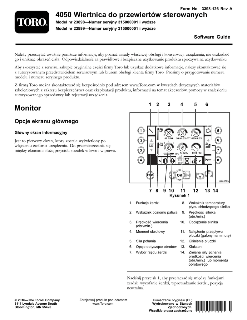 Form No. 3398-126 Rev A 4050 Wiertnica do przewiertów sterowanych Model nr 23898—Numer seryjny 315000001 i wyższe Model nr 23899—Numer seryjny 315000001 i wyższe Software Guide Należy przeczytać uważnie poniższe informacje, aby poznać zasady właściwej obsługi i konserwacji urządzenia, nie uszkodzić go i uniknąć obrażeń ciała. Odpowiedzialność za prawidłowe i bezpieczne użytkowanie produktu spoczywa na użytkowniku. Aby skorzystać z serwisu, zakupić oryginalne części firmy Toro lub uzyskać dodatkowe informacje, należy skontaktować się z autoryzowanym przedstawicielem serwisowym lub biurem obsługi klienta firmy Toro. Prosimy o przygotowanie numeru modelu i numeru seryjnego produktu. Z firmą Toro można skontaktować się bezpośrednio pod adresem www.Toro.com w kwestiach dotyczących materiałów szkoleniowych z zakresu bezpieczeństwa oraz eksploatacji produktu, informacji na temat akcesoriów, pomocy w znalezieniu autoryzowanego sprzedawcy lub rejestracji urządzenia. Monitor Opcje ekranu głównego Główny ekran informacyjny Jest to pierwszy ekran, który zostaje wyświetlony po włączeniu zasilania urządzenia. Do przemieszczania się między ekranami służą przyciski strzałek w lewo i w prawo. Rysunek 1 1. Funkcje żerdzi 8. Wskaźnik temperatury płynu chłodzącego silnika 2. Wskaźnik poziomu paliwa 9. Prędkość silnika (obr./min.) 3. Prędkość wiercenia (obr./min.) 10. Obciążenie silnika 4. Moment obrotowy 11. Natężenie przepływu płuczki (galony na minutę) 5. Siła pchania 12. Ciśnienie płuczki 6. Opcje dotyczące obrotów 13. Klakson 7. Wybór rzędu żerdzi 14. Zmiana siły pchania, prędkości wiercenia (obr./min.) lub momentu obrotowego Naciśnij przycisk 1, aby przełączać się między funkcjami żerdzi: wycofanie żerdzi, wprowadzanie żerdzi, pozycja neutralna. © 2016—The Toro® Company 8111 Lyndale Avenue South Bloomington, MN 55420 Zarejestruj produkt pod adresem www.Toro.com. Tłumaczenie oryginału (PL) Wydrukowano w Stanach Zjednoczonych. Wszelkie prawa zastrzeżone *3398-126* A Naciśnij przycisk 5, aby przełączać się między siłą pchania, prędkością wiercenia (obr./min.) i momentem obrotowym. Za pomocą strzałek w górę i w dół ustaw wartości graniczne maksymalnej prędkości wiercenia (obr./min.), momentu obrotowego i siły pchania. • Siła pchania: zmieniaj siłę pchania za pomocą przycisków 6 lub 7. • Prędkość wiercenia (obr./min.): zmieniaj prędkość wiercenia za pomocą przycisków 6 lub 7. • Moment obrotowy: zmieniaj moment obrotowy za pomocą przycisków 6 lub 7. Rysunek 3 Ekran zużycia płuczki Aby przejść do tego ekranu, naciśnij przycisk 2 na ekranie godzin. Ekran ten pokazuje zużycie płuczki (w galonach) przez maszynę. Całkowitego zużycia płuczki nie można zmienić. Dzienne zużycie płuczki można skasować. Rysunek 2 1. Wycofanie żerdzi 4. Siła pchania 2. Wprowadzanie żerdzi 5. Prędkość wiercenia (obr./min.) 3. Moment obrotowy Opcje ekranu godzin i liczników Ekran liczby motogodzin Aby przejść do tego ekranu, naciśnij przycisk 1 na ekranie godzin. Rysunek 4 Ekran ten pokazuje liczbę roboczogodzin maszyny. Wskazań licznika Maszyna 1 nie można zmienić. Licznik Maszyna 2 można skasować. Ekrany smarowania i konserwacji Aby przejść do tego ekranu, naciśnij przycisk 3 na ekranie godzin. Ekrany te pokazują użytkownikowi harmonogramy konserwacji z okresami międzyserwisowymi dziennymi oraz wynoszącymi 50, 250, 500 i 1000 godzin. Aby skasować okres międzyserwisowy, naciśnij trzykrotnie przyciski 5–8 odpowiedniego okresu serwisowego, po czym wprowadź kod pin 12356. Aby przejść do kolejnego harmonogramu konserwacji, należy nacisnąć odpowiednie przyciski: 2 • Przycisk 3 – 10-godzinny harmonogram konserwacji (Rysunek 5) • Przycisk 5 – 50-godzinny harmonogram konserwacji (Rysunek 6) • Przycisk 6 – 250-godzinny harmonogram konserwacji (Rysunek 7) • Przycisk 7 – 500-godzinny harmonogram konserwacji (Rysunek 8) • Przycisk 8 – 1000-godzinny harmonogram konserwacji (Rysunek 9) Rysunek 7 Rysunek 5 Rysunek 8 Rysunek 6 Rysunek 9 Opcje ekranu ustawień Ekran ustawień wózka Naciśnij przycisk 1 na ekranie ustawień. 3 podajnik rur minie punkt chwytania krzywki, chwytak automatycznie się otworzy. Ekran ten pozwala na zmianę ustawień wózka. Za pomocą strzałek w górę i w dół można przełączać się między: wycofaniem żerdzi, wprowadzaniem żerdzi i pozycją neutralną. • Powrót krzywki do pozycji wyjściowej Obróć krzywkę w kierunku kosza na żerdzie. Krzywka zatrzyma się przy rzędzie wybranym przez operatora. Unieś podnośnik i cofnij krzywkę do położenia wyjściowego. • Cofanie wózka Podczas wycofywania żerdzi wózek zatrzyma się w pozycji chwytania i złącze żerdzi zostanie rozdzielone. Następnie wózek zatrzyma się w pozycji załadunku, aby ustawić żerdź przed umieszczeniem jej w koszu. Położenie neutralne Krzywka zatrzymuje się przy wybranym rzędzie żerdzi podczas ruchu w dowolnym kierunku, natomiast wózek zatrzymuje się w pozycjach chwytania i załadunku. Ekran trybu sterowania Naciśnij przycisk 2 na ekranie ustawień. Ekran ten pozwala na wybór jednego z 2 sposobów działania joysticków sterujących. Naciśnij przycisk 2, aby przełączyć między trybem I a trybem II. Rysunek 10 Wprowadzanie żerdzi • Przekręcenie krzywki przed załadunkiem żerdzi Krzywka zatrzymuje się w pozycji wyznaczonego rzędu. Opuść podnośnik i przekręć krzywkę z żerdzią do pozycji załadunku. Uruchom podajnik żerdzi, aby przesunąć żerdź w kierunku punktu mocowania. Gdy podajnik mija punkt chwytania, chwytaki automatycznie zaciskają się na żerdzi. • Powrót krzywki do pozycji wyjściowej Po zamocowaniu żerdzi do współpracującej żerdzi wycofaj ramię podajnika do pozycji wyjściowej i unieś podnośnik. Po wycofaniu ramienia podajnika krzywka może powrócić do pozycji wyj