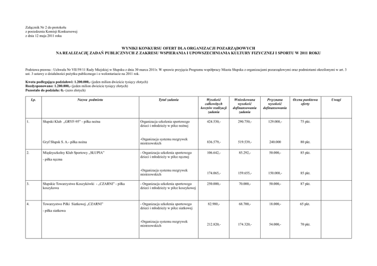 Załącznik Nr 2 do protokołu z posiedzenia Komisji Konkursowej z dnia 12 maja 2011 roku WYNIKI KONKURSU OFERT DLA ORGANIZACJI POZARZĄDOWYCH NA REALIZACJĘ ZADAŃ PUBLICZNYCH Z ZAKRESU WSPIERANIA I UPOWSZECHNIANIA KULTURY FIZYCZNEJ I SPORTU W 2011 ROKU Podstawa prawna : Uchwała Nr VII/59/11 Rady Miejskiej w Słupsku z dnia 30 marca 2011r. W sprawie przyjęcia Programu współpracy Miasta Słupska z organizacjami pozarządowymi oraz podmiotami określonymi w art. 3 ust. 3 ustawy o działalności pożytku publicznego i o wolontariacie na 2011 rok. Kwota podlegająca podziałowi: 1.200.000,- (jeden milion dwieście tysięcy złotych) Rozdysponowano: 1.200.000,- (jeden milion dwieście tysięcy złotych) Pozostało do podziału: 0,- (zero złotych) Lp. 1. Nazwa podmiotu Słupski Klub „GRYF-95” - piłka nożna Gryf Słupsk S. A.- piłka nożna 2. Międzyszkolny Klub Sportowy „SŁUPIA” - piłka ręczna Tytuł zadania Organizacja szkolenia sportowego dzieci i młodzieży w piłce nożnej -Organizacja systemu rozgrywek mistrzowskich - Organizacja szkolenia sportowego dzieci i młodzieży w piłce ręcznej -Organizacja systemu rozgrywek mistrzowskich Wysokość całkowitych kosztów realizacji zadania Wnioskowana wysokość dofinansowania zadania Przyznana wysokość dofinansowania Ocena punktowa oferty 424.530,- 290.750,- 129.000,- 75 pkt. 836.579,- 519.539,- 240.000 80 pkt. 106.642,- 85.292,- 50.000,- 85 pkt. 174.065,- 159.655,- 150.000,- 85 pkt. 3. Słupskie Towarzystwo Koszykówki - „CZARNI” - piłka koszykowa - Organizacja szkolenia sportowego dzieci i młodzieży w piłce koszykowej 250.000,- 70.000,- 50.000,- 87 pkt. 4. Towarzystwo Piłki Siatkowej „CZARNI” - Organizacja szkolenia sportowego dzieci i młodzieży w piłce siatkowej 82.980,- 68.700,- 18.000,- 65 pkt. 212.820,- 174.320,- 54.000,- 70 pkt. - piłka siatkowa -Organizacja systemu rozgrywek mistrzowskich Uwagi Lp. 5. Nazwa podmiotu Słupski Klub Badmintona „PIAST” - badminton Tytuł zadania Wysokość całkowitych kosztów realizacji zadania Wnioskowana wysokość dofinansowania zadania Przyznana wysokość dofinansowania Ocena punktowa oferty - Ogólnopolski Turniej Piłki Siatkowej Kobiet o Puchar Prezydenta Miasta 6.744,- 5.600,- 2.700,- 65 pkt. 145.532,- 102.460,- 18.000,- 65pkt. 80.020,- 59.280,- 44.000,- 60 pkt. 115.955,- 56.440,- 42.000,- 82 pkt. 16.660,- 10.400,- 4.000,- 75 pkt. 203.004,- 176.524,- 111.500,- 68 pkt. 23.125,- 12.230,- 9.000,- 80 pkt. -Organizacja szkolenia sportowego dzieci i młodzieży w badmintonie -Organizacja systemu rozgrywek mistrzowskich 6. Słupskie Towarzystwo Sportowe „GRYF-3” -judo -Organizacja szkolenia sportowego dzieci i młodzieży w judo -Międzynarodowy Turniej Judo im. Zbigniewa Kwiatkowskiego 7. Słupski Klub Lekkiej Atletyki – lekka atletyka -Organizacja szkolenia sportowego dzieci i młodzieży -,,Pomorska Mila” Bieg Niepodległościowy 8. 9. Towarzystwo Pływackie „SKALAR” -Szkolenie dzieci i młodzieży w pływaniu oraz propagowanie i rozwój sportu pływackiego 295.673,- 87.500,- 28.000,- 85 pkt. -pływanie Słupski Klub Bokserski „CZARNI” -pięściarstwo -Organizacja szkolenia sportowego dzieci i młodzieży w boksie 138.703,- 83.000,- 56.000,- 75 pkt. 17.100,- 5.600,- 3.600,- 70 pkt. 16.300,- 5.600,- 3.600,- 70 pkt. - Turniej Pięściarski „Srebrne Rękawice” - Turniej Pięściarski „im. Aleksego Antkiewicza” Uwagi Lp. 10. Nazwa podmiotu Klub Strzelecki „GRYF SŁUPSKI” - strzelectwo sportowe Tytuł zadania Wysokość całkowitych kosztów realizacji zadania Wnioskowana wysokość dofinansowania zadania Przyznana wysokość dofinansowania Ocena punktowa oferty -Organizacja szkolenie sportowe młodzieży w strzelectwie sportowym. 190.000,- 40.000,- 37.500,- 80 pkt. 11. Słupski Szkolny Związek Sportowy – sport szkolny dzieci i młodzieży -Organizacja imprez sportowych dla dzieci i młodzieży. 95.052,- 78.501,- 55.000,- 85 pkt. 12. Stowarzyszenie Międzynarodowy Festiwal Brydża Sportowego „Solidarność” - Organizacja XV Mistrzostw Ziemi Słupskiej w Scrabble o puchar Przewodniczącego Rady Miejskiej w Słupsku 8.600,- 4.000,- 1.200,- 82 pkt. -XI Kongres Brydża Sportowego z okazji Dnia Niepodległości 14.650,- 5.000,- 1.300,- 75 pkt. 443.000,- 50.000,- 27.000,- 80 pkt. 14.200,- 5.000,- 1.200,- 75 pkt. 13.400,- 6.000,- 4.500,- 75 pkt. 50.460,- 13.185,- 5.000,- 82 pkt. -w piłce nożnej 36.300,- 12.000,- 4.500,- 80 pkt. -w piłce koszykowej 46.500,- 10.200,- 4.500,- 80 pkt. - Festyn im. Zbigniewa Żynisa 14.000,- 10.000,- 500,- 65 pkt. - brydż sportowy -XXI Międzynarodowy Festiwal Brydża Sportowego ,,Solidarność” -Organizacja XII Memoriału Szachowego im. Sotero Wismonta -Udział zespołu brydża sportowego ,,Festiwal Słupsk” w rozgrywkach I ligi państwowej 13. Uczniowski Klub Sportowy „BYKI” - piłka nożna -Organizacja szkolenia sportowego dzieci i młodzieży w sekcjach sportowych 14. Stowarzyszenie Lokalne „SALOS” - piłka nożna i koszykowa -Szkolenie sportowe dzieci i młodzieży Uwagi Lp. Nazwa podmiotu Tytuł zadania Wysokość całkowitych kosztów realizacji zadania Wnioskowana wysokość dofinansowania zadania Przyznana wysokość dofinansowania Ocena punktowa oferty 15. Słupskie Stowarzyszenie Tańca Sportowego „CHEERLEADERS MAXI” -taniec sportowy -Organizacja szkolenia sportowego dzieci i młodzieży w sekcjach sportowych. 32.450,72 16.480,- 6.550,- 80 pkt. 16. Słupski Klub Tańca Sportowego „PAKTAN” -taniec sportowy -Pomorskie warsztaty taneczne- Taniec z Mistrzami 24.172,89 14.670,- 4.500,- 82 pkt. 69.643,- 36.600,- 10.000,- 83 pkt. 21.510,- 14.810,- 4.500,- 71 pkt. 3.860,- 2.710,- 1.800,- 73 pkt. 1.430,- 1.030,- 800,- 73 pkt. - Słupski Festiwal Tańca ,,Baltic Amber Pearl” 17. Słupskie Towarzystwo Tenisowe – tenis ziemny -Organizacja szkolenia sportowego dzieci i młodzieży w tenisie ziemnym: -szkółka tenisowa - Turniej tenisa ziemnego o puchar Prezydenta Miasta Słupska