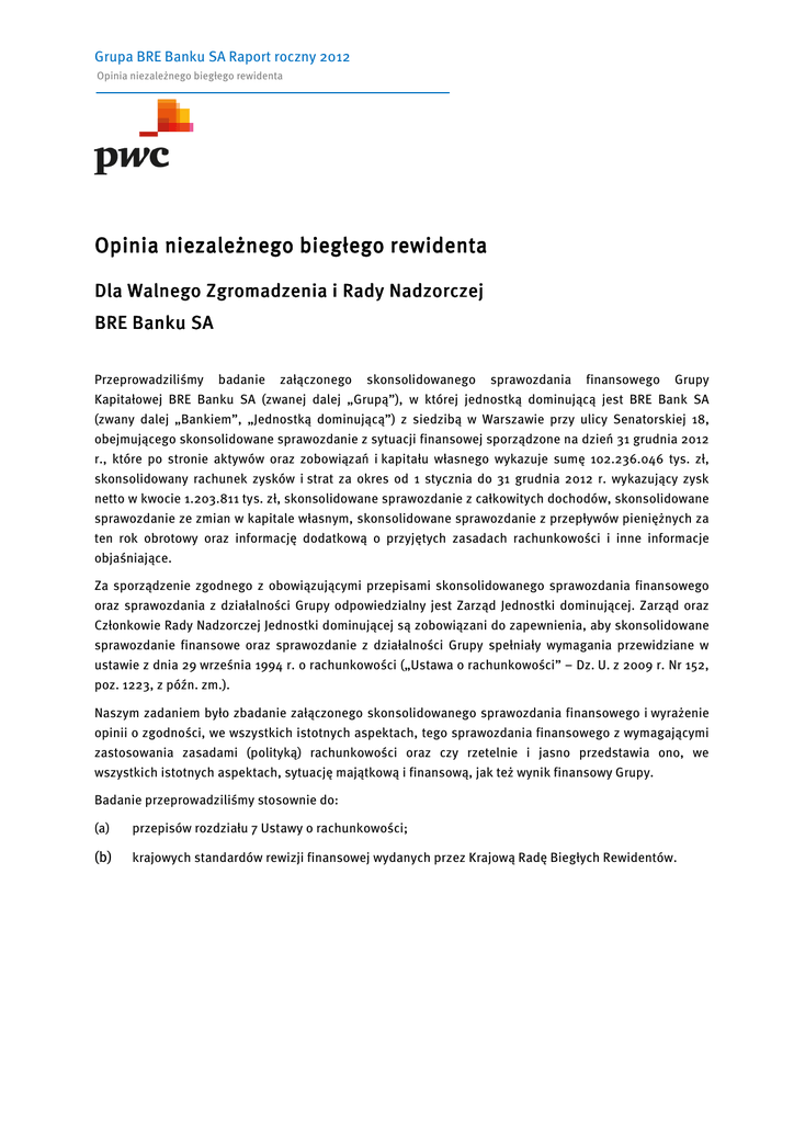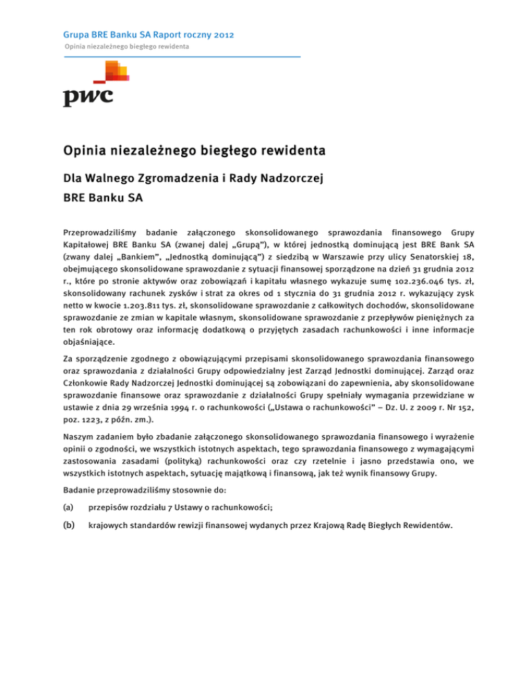 Grupa BRE Banku SA Raport roczny 2012 Opinia niezależnego biegłego rewidenta Opinia niezależnego biegłego rewidenta Dla Walnego Zgromadzenia i Rady Nadzorczej BRE Banku SA Przeprowadziliśmy badanie załączonego skonsolidowanego sprawozdania finansowego Grupy Kapitałowej BRE Banku SA (zwanej dalej „Grupą”), w której jednostką dominującą jest BRE Bank SA (zwany dalej „Bankiem”, „Jednostką dominującą”) z siedzibą w Warszawie przy ulicy Senatorskiej 18, obejmującego skonsolidowane sprawozdanie z sytuacji finansowej sporządzone na dzień 31 grudnia 2012 r., które po stronie aktywów oraz zobowiązań i kapitału własnego wykazuje sumę 102.236.046 tys. zł, skonsolidowany rachunek zysków i strat za okres od 1 stycznia do 31 grudnia 2012 r. wykazujący zysk netto w kwocie 1.203.811 tys. zł, skonsolidowane sprawozdanie z całkowitych dochodów, skonsolidowane sprawozdanie ze zmian w kapitale własnym, skonsolidowane sprawozdanie z przepływów pieniężnych za ten rok obrotowy oraz informację dodatkową o przyjętych zasadach rachunkowości i inne informacje objaśniające. Za sporządzenie zgodnego z obowiązującymi przepisami skonsolidowanego sprawozdania finansowego oraz sprawozdania z działalności Grupy odpowiedzialny jest Zarząd Jednostki dominującej. Zarząd oraz Członkowie Rady Nadzorczej Jednostki dominującej są zobowiązani do zapewnienia, aby skonsolidowane sprawozdanie finansowe oraz sprawozdanie z działalności Grupy spełniały wymagania przewidziane w ustawie z dnia 29 września 1994 r. o rachunkowości („Ustawa o rachunkowości” – Dz. U. z 2009 r. Nr 152, poz. 1223, z późn. zm.). Naszym zadaniem było zbadanie załączonego skonsolidowanego sprawozdania finansowego i wyrażenie opinii o zgodności, we wszystkich istotnych aspektach, tego sprawozdania finansowego z wymagającymi zastosowania zasadami (polityką) rachunkowości oraz czy rzetelnie i jasno przedstawia ono, we wszystkich istotnych aspektach, sytuację majątkową i finansową, jak też wynik finansowy Grupy. Badanie przeprowadziliśmy stosownie do: (a) przepisów rozdziału 7 Ustawy o rachunkowości; (b) krajowych standardów rewizji finansowej wydanych przez Krajową Radę Biegłych Rewidentów. Grupa BRE Banku SA Raport roczny 2012 Opinia niezależnego biegłego rewidenta Opinia niezależnego biegłego rewidenta Dla Walnego Zgromadzenia i Rady Nadzorczej BRE Banku SA (cd) Badanie zostało zaplanowane i przeprowadzone tak, aby uzyskać wystarczającą pewność, że skonsolidowane sprawozdanie finansowe nie zawiera istotnych błędów i przeoczeń. Badanie obejmowało między innymi sprawdzenie, na podstawie wybranej próby, dowodów potwierdzających kwoty i informacje wykazane w skonsolidowanym sprawozdaniu finansowym. Badanie obejmowało również ocenę zasad rachunkowości stosowanych przez Grupę oraz istotnych oszacowań dokonywanych przy sporządzeniu skonsolidowanego sprawozdania finansowego, a także ogólną ocenę jego prezentacji. Uważamy, że nasze badanie stanowiło wystarczającą podstawę dla wyrażenia opinii. Naszym zdaniem, załączone skonsolidowane sprawozdanie finansowe we wszystkich istotnych aspektach: (a) przedstawia rzetelnie i jasno sytuację majątkową i finansową Grupy na dzień 31 grudnia 2012 r. oraz wynik finansowy za rok obrotowy od 1 stycznia do 31 grudnia 2012 r. zgodnie z Międzynarodowymi Standardami Sprawozdawczości Finansowej zatwierdzonymi przez Unię Europejską; (b) jest zgodne w formie i treści z obowiązującymi Grupę przepisami prawa; (c) zostało sporządzone na podstawie prawidłowo prowadzonej dokumentacji konsolidacyjnej. Informacje zawarte w sprawozdaniu z działalności Grupy za rok obrotowy od 1 stycznia do 31 grudnia 2012 r. uwzględniają postanowienia Rozporządzenia Ministra Finansów z dnia 19 lutego 2009 r. w sprawie informacji bieżących i okresowych przekazywanych przez emitentów papierów wartościowych oraz warunków uznawania za równoważne informacji wymaganych przepisami prawa państwa niebędącego państwem członkowskim („Rozporządzenie” – Dz. U. nr 33 poz. 259, z późn. zm.) i są zgodne z informacjami zawartymi w zbadanym skonsolidowanym sprawozdaniu finansowym. Przeprowadzający badanie w imieniu PricewaterhouseCoopers Sp. z o.o., spółki wpisanej na listę podmiotów uprawnionych do badania sprawozdań finansowych pod numerem 144: Agnieszka Accordi-Krawiec Biegły Rewident Grupy, Kluczowy Biegły Rewident Numer ewidencyjny 11665 Warszawa, 7 marca 2013 r. Grupa BRE Banku SA Raport roczny 2012 Raport z badania skonsolidowanego sprawozdania finansowego za rok obrotowy od 1 stycznia do 31 grudnia 2012 r. Grupa Kapitałowa BRE Banku SA Raport z badania skonsolidowanego sprawozdania finansowego za rok obrotowy od 1 stycznia do 31 grudnia 2012 r. Grupa BRE Banku SA Raport roczny 2012 Raport z badania skonsolidowanego sprawozdania finansowego za rok obrotowy od 1 stycznia do 31 grudnia 2012 r. Raport z badania skonsolidowanego sprawozdania finansowego za rok obrotowy od 1 stycznia do 31 grudnia 2012 r. Dla Walnego Zgromadzenia i Rady Nadzorczej BRE Banku SA Niniejszy raport zawiera 15 kolejno ponumerowanych stron i składa się z następujących części: Strona I. Ogólna charakterystyka Grupy…………………………………………………………………………………. ................. 17 II. Informacje dotyczące przeprowadzonego badania……………………………………………………… .............. 22 III. Charakterystyka wyników, sytuacji finansowej Grupy oraz istotnych pozycji skonsolidowanego sprawozdania finansowego……………………………………………………………........................................... 23 IV. Stwierdzenia niezależnego biegłego rewidenta…………………………………………………………. ............... 30 V. Informacje i uwagi końcowe……………………………………………