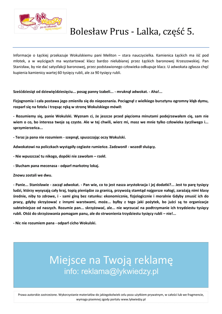 Bolesław Prus - Lalka, część 5. Informacje o Łęckiej przekazuje Wokulskiemu pani Meliton – stara nauczycielka. Kamienica Łęckich ma iśd pod młotek, a w wyścigach ma wystartowad klacz bardzo nielubianej przez Łęckich baronowej Krzeszowskiej. Pan Stanisław, by nie dad satysfakcji baronowej, przez podstawionego człowieka odkupuje klacz. U adwokata zgłasza chęd kupienia kamienicy wartej 60 tysięcy rubli, ale za 90 tysięcy rubli. Sześddziesiąt od dziewięddziesięciu... posag panny Izabeli... - mruknął adwokat. - Aha!... Fizjognomia i cała postawa jego zmieniła się do niepoznania. Pociągnął z wielkiego bursztynu ogromny kłąb dymu, rozparł się na fotelu i trzęsąc ręką w stronę Wokulskiego mówił: - Rozumiemy się, panie Wokulski. Wyznam ci, że jeszcze przed pięcioma minutami podejrzewałem cię, sam nie wiem o co, bo interesa twoje są czyste. Ale w tej chwili, wierz mi, masz we mnie tylko człowieka życzliwego i... sprzymierzeoca... - Teraz ja pana nie rozumiem - szepnął, spuszczając oczy Wokulski. Adwokatowi na policzkach wystąpiły ceglaste rumieoce. Zadzwonił - wszedł służący. - Nie wpuszczad tu nikogo, dopóki nie zawołam – rzekł. - Słucham pana mecenasa - odparł markotny lokaj. Znowu zostali we dwu. - Panie... Stanisławie - zaczął adwokat. - Pan wie, co to jest nasza arystokracja i jej dodatki?... Jest to parę tysięcy ludzi, którzy wysysają cały kraj, topią pieniądze za granicą, przywożą stamtąd najgorsze nałogi, zarażają nimi klasy średnie, niby to zdrowe, i - sami giną bez ratunku: ekonomicznie, fizjologicznie i moralnie Gdyby zmusid ich do pracy, gdyby skrzyżowad z innymi warstwami, może... byłby z tego jaki pożytek, bo jużci są to organizacje subtelniejsze od naszych. Rozumie pan... skrzyżowad, ale... nie wyrzucad na podtrzymanie ich trzydziestu tysięcy rubli. Otóż do skrzyżowania pomagam panu, ale do strwonienia trzydziestu tysięcy rubli – nie!... - Nic nie rozumiem pana - odparł cicho Wokulski. Prawa autorskie zastrzeżone. Wykorzystanie materiałów do jakiegokolwiek celu poza użytkiem prywatnym, w całości lub we fragmencie, wymaga pisemnej zgody portalu www.lykwiedzy.pl - Rozumiesz, tylko nie ufasz mi. Wielka to cnota nieufnośd, leczyd z niej pana nie będę. Tyle ci powiem: Łęcki bankrut może zostad... krewnym nawet kupca, a tym bardziej kupca - szlachcica. Ale Łęcki z trzydziestoma tysiącami rubli w kieszeni!... - Panie mecenasie - przerwał Wokulski - czy zechce pan w moim imieniu stanąd do licytacji tego domu? - Stanę, lecz ponad to, co da pani Krzeszowska, postąpię najwyżej parę tysięcy. Wybacz pan, panie Wokulski, ale sam z sobą licytowad się nie będę. - A jeżeli znajdzie się trzeci licytant? - Ha! w takim razie i jego zdystansuję, ażeby dogodzid paoskiemu kaprysowi. Wokulski wstał. - Dziękuję panu - rzekł - za parę słów szczerszych. Ma pan rację, ale i ja mam moje racje... Pieniądze przyniosę panu jutro; teraz do widzenia. - Żal mi pana - odpowiedział adwokat ściskając go za rękę. - Dlaczegóż to? - Dlatego, panie, że kto chce zdobyd, musi zwyciężyd, zdusid przeciwnika, nie zaś karmid go z własnej spiżarni. Popełniasz pan błąd, który cię raczej odsunie, aniżeli zbliży do celu. - Myli się pan. - Romantyk!... romantyk!... - powtarzał adwokat z uśmiechem. Wyścig wygrywa klacz Wokulskiego (ta okupiona od baronowej). Cieszy to ludzi, bo kupiecki koo pokonał konie arystokratów. Wokulski z paczką banknotów zwrócił się do panny Izabeli: - Czy pozwoli pani, ażebym na jej ręce złożył to dla ochrony pao?... Panna Izabela przyjęła paczkę z uśmiechem i prześlicznym spojrzeniem. Wtem ktoś potrącił Wokulskiego. Był to baron Krzeszowski. Blady z gniewu zbliżył się do powozu i wyciągając rękę do panny Izabeli zawołał po francusku: Prawa autorskie zastrzeżone. Wykorzystanie materiałów do jakiegokolwiek celu poza użytkiem prywatnym, w całości lub we fragmencie, wymaga pisemnej zgody portalu www.lykwiedzy.pl - Cieszę się, kuzynko, że twoi wielbiciele triumfują... Przykro mi tylko, że na mój koszt... Witam panie! - dodał kłaniając się hrabinie i prezesowej. Twarz hrabiny powlokła się chmurą; pan Łęcki był zakłopotany, panna Izabela zbladła. Baron w impertynencki sposób osadził spadające mu binokle i ciągle patrząc na pannę Izabelę mówił: - Tak jest... Mam szczególniejsze szczęście do wielbicieli kuzynki... - Baronie... - wtrąciła prezesowa. - Przecież nie mówię nic złego... Mówię tylko, że mam szczęście do... Stojący za nim Wokulski dotknął jego ramienia. - Słówko, panie baronie – rzekł. - Ach, to pan - odparł baron przypatrując mu się. Odeszli na bok. - Pan mnie potrącił, panie baronie... - Bardzo przepraszam... - To mi nie wystarcza... - Czyżby pan chciał satysfakcji? - spytał baron. - Właśnie. - W takim razie służę - rzekł baron szukając biletu. - Ach, do licha! Nie wziąłem biletów... Może pan ma notatnik z ołówkiem, panie Wokulski?... Wokulski podał mu bilet i notatnik, w którym baron zapisał adres i swoje nazwisko nie omieszkawszy zrobid przy nim zakrętu. - Miło mi będzie - dodał kłaniając się Wokulskiemu - dokooczyd rachunku za moją Sułtankę... Na drugi dzieo dochodzi do pojedynku. Pierwszy strzela baron, ale pudłuje. Kula wystrzelona przez Wokulskiego wpada do lufy pistoletu Krzeszowskiego. Pistolet uderza barona w szczękę, wybijając ząb. Panowie godzą się i rozjeżdżają. Wokulski zapytany: Po co ten pojedynek? Odpowiada: Obrażono kobietę. Prawa autorskie zastrzeżone. Wykorzystanie materiałów do jakiegokolwiek celu poza użytkiem prywatnym, w całości lub we fragmencie, wymaga pisemnej zgody portalu www.lykwiedzy.pl Adwokat księcia odradza Wokulskiemu kupowania kamienicy, gdyż wydając w ten sposób pieniądze, straci majątek. Takie zachowanie może odstraszyd udziałowców spółki. Wokulski nie ustęp