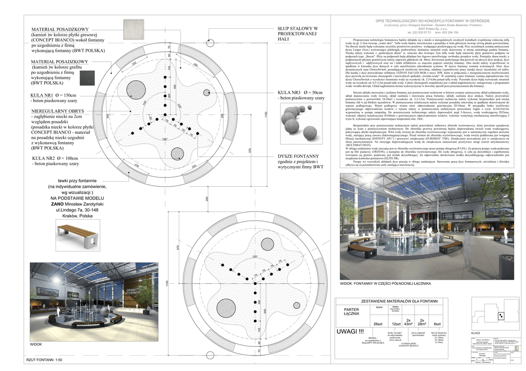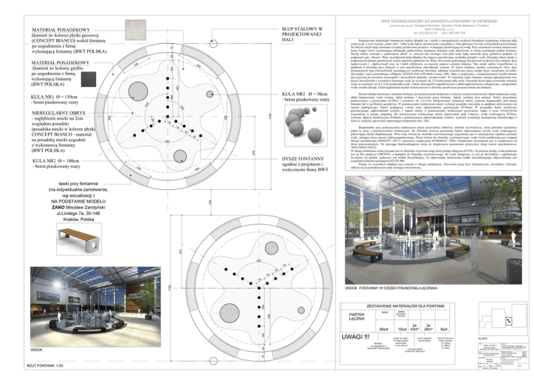 (wykonany przez BWT Polska Sp. z o.o. 60 70 PROJEKTOWANEJ HALI 0 23 145 35 445 (BWT POLSKA) 0 Proponowana technologia fontannowa z niecki o nieregularnych owalnych wody na 2-3cm Tafla wody zniwelowana z w holu Na obrysie niecki wykonane szczeliny przelewowe przelewy Przy szczelinach umieszczone dysze Leaper (5szt.) laminarny wody skierowany w centralnego punktu fontanny. z tz. sztuczne dno 2cm wody granitowe podparte na podporach typu. na podporach bez fugowo swobodny wody. dnem niecki, a podpieranymi granitowymi ok. 40cm. Stworzenie dna pozwoli na ukrycie dysz atrakcji, dysz i oraz rur i kabli co znacznie poprawi fontanny. Dno niecki ze spadkiem w kierunku dysz dennych w celu odwodnienia systemu. W niecce fontanny zostanie wykonanych 18szt. dysz dynamicznych typu ChoreoSwitch, dowolnej, pracy dyszy od siebie. Dla z dysz przewidziano reflektory LEDV03 Full LED RGB o mocy 30W, w z nieograniczonymi dysz na tworzenie choreografii i spektakli W centralnej fontanny zaprojektowane trzy dysze ChoreoSwitch o strumienia wody na ok. 5,5-6,0m ponad wody. dysze wody na od. 0,3-3,5m ponad wody. choreografii jest o zintegrowany z programami 300 KULA NR1 - beton piaskowany szary - beton piaskowany szary 350 350 1150 NIEREGULARNY OBRYS Sercem sterowania i zasilania fontanny jest pomieszczenie techniczne w zostanie umieszczony uzdatniania wody, dopuszczania wody zasilania i sterowania fontanny, zasilania dysz atrakcji. pomieszczenie o powierzchni 18-20m2 i ok. 2,3-2,5m. Pomieszczenie techniczne pod fontanny lub w jej bliskim W pomieszczeniu technicznym ze spadkami skierowanymi do wpustu Wpust winien odprowadzenie grawitacyjne D110mm. W przypadku braku grawitacyjnego odprowadzenia z wpustu w pomieszczeniu technicznym o wym. 0,5x0,5x0,5m w Do pomieszczenia technicznego 3-fazowy, D32mm, kanalizacyjne D160mm z grawitacyjnym odprowadzeniem 5 75 75 75 75 - beton piaskowany szary 575 (BWT POLSKA) 23 0 DYSZE FONTANNY zgodnie z projektem i wytycznymi firmy BWT 0 23 Pompy we wszystkich dysz w obiegu Sterowanie dysz fontannowych, i 575 200 wg wizualizacji ) NA PODSTAWIE MODELU ZANO ul.Lindego 7a, 30-148 przy pomieszczeniu technicznym zbiornik powinien ze z pomieszczeniem technicznym. Do zbiornika doprowadzana woda ubytki eksploatacyjne. Wlot wody do zbiornika jest w automatyczny regulator poziomu wody, zaworu elektromagnetycznego. Przed wlotem do zbiornika woda poddawana jest filtracji mechanicznej (INFINITY i procesowi (EUROMAT 75SE). prowadzone jest w na jonowymiennym. Na do zastosowano przerywacz strugi -MULTIMAT DN25). W obiegu uzdatniania woda zasysana jest ze zbiornika przez (P-UFL). Za pompy woda podawana jest na filtr piaskowy (TRITON), a do zbiornika Do wody obiegowej, w celu jej dezynfekcji i rozwijania podawany jest Za odpowiednie dawkowanie odpowiedzialne jest 75 75 75 70 WIDOK KLUCZ 60 145 445 300 1150 75 BIURO PROJEKTOWE "NOWA BRAMA" ARCH.KRZYSZTOF KIEPUSZEWSKI AS.ARCH.MARTYNA DATA RZUT FONTANN 1:50