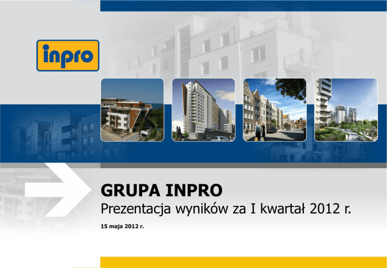 GRUPA INPRO Prezentacja wyników za I kwartał 2012 r. 15 maja 2012 r. GRUPA INPRO. Prezentacja wyników za 1Q 2012 r. Podsumowanie wyników w I kwartale 2012 r. Skonsolidowany zysk z działalności operacyjnej EBIT wygenerowany w I kwartale 2012 roku przez Grupę Kapitałową Inpro wzrósł o ponad 300% do 2,99 mln zł w stosunku do wyniku uzyskanego w I kwartale 2011 roku, kiedy to wypracowano 746 tys. zł. Przychody ze sprzedaży w I kwartale 2012 roku wyniosły 26,42 mln zł i wzrosły o 44% w stosunku do 18,35 mln zł w analizowanym okresie roku ubiegłego. Skonsolidowany zysk netto przypisany akcjonariuszom jednostki dominującej osiągnął poziom 2,1 mln zł wobec straty 336 tys. powstałej w analogicznym okresie roku ubiegłego. Bardzo dobre wyniki w I kwartale 2012 roku odnotowała również Spółka Inpro S.A., która wypracowała 3,29 mln zł zysku z działalności operacyjnej, czyli o 115 % więcej niż w I kwartale 2011 roku, kiedy to uzyskała 1,53 mln zł. Spółka odnotowała w I kwartale 2012 roku 70% wzrost przychodów netto ze sprzedaży, generując 26,05 mln zł wobec 15,29 mln zł w analogicznym okresie roku ubiegłego. GRUPA INPRO. Prezentacja wyników za 1Q 2012 r. 2 Struktura sprzedaży Grupy Struktura sprzedaży Grupy Inpro w pierwszym kwartale 2012 r. Rugby; 2% Dom Zdrojowy; 3% INPRO+Domesta; 95% Inpro S.A. jest jednym z liderów rynku mieszkaniowego Trójmiasta: lider segmentu mieszkań o podwyższonym standardzie – wysoki standard wykończenia mieszkań, atrakcyjne lokalizacje, 2. miejsce w badaniu Mieszkaniowa Marka Roku, w kategorii rozpoznawalności marki na rynku trójmiejskim, najstarszy deweloper w Gdańsku – prawie 3 tys. oddanych lokali. W maju 2012 r. jubileusz 25 lat. W listopadzie 2011 roku inwestycja Kwartał Kamienic zdobyła I miejsce w konkursie „Buduj bezpiecznie” organizowanym przez Okręgowy Inspektorat Państwowej Inspekcji Pracy w Gdańsku. W marcu 2012 r. Inpro uzyskało tytuł Budowlana Firma Roku 2011 w kategorii Deweloper, przyznawane przez miesięcznik Builder. GRUPA INPRO. Prezentacja wyników za 1Q 2012 r. 3 Podsumowanie sprzedaży w I kwartale 2012 r. W pierwszym kwartale 2012 roku Grupa Kapitałowa Inpro podpisała łącznie 98 umów przedwstępnych na sprzedaż netto (107 umów brutto). W marcu 2012 roku Inpro SA* podpisała 48 umów netto, czyli o 30% więcej niż łącznie w dwóch poprzednich miesiącach (37 umów). Największym zainteresowaniem cieszyły się dwie inwestycje - City Park ze względu na atrakcyjną lokalizację oraz Osiedle Jabłoniowa z uwagi na konkurencyjne ceny. Spółka zależna - Przedsiębiorstwo Budowlane Domesta Sp. z o.o. zawarła w I kwartale 2012 r. 13 umów przedwstępnych na sprzedaż. W I kwartale 2012 roku Grupa Kapitałowa Inpro wprowadziła do sprzedaży łącznie 167 lokali: • budynek D na Osiedlu City Park w Gdańsku z 84 mieszkaniami i 2 lokalami usługowymi • budynki I i J na Osiedlu Jabłoniowa w Gdańsku z 48 mieszkaniami • budynek nr 9 na Osiedlu Leszczynowym z 33 mieszkaniami *dane dotyczące Inpro S.A. uwzględniają condohotel w Mikołajkach GRUPA INPRO. Prezentacja wyników za 1Q 2012 r. 4 Kwartalna sprzedaż mieszkań Inpro S.A. 120 100 80 60 40 20 100 91 95 90 74 54 53 61 59 57 54 55 I kw 2008 II kw 2008 III kw 2008 IV kw 2008 48 72 71 56 52 55 I kw 2009 II kw 2009 III kw 2009 91 73 67 62 111 102 10898 82 111 99 79 61 94 85 67 0 ilość sprzed. lokali brutto IV kw 2009, I kw 2010 II kw 2010 III kw 2010 IV w 2010 I kw 2011 II kw 2011 III kw 2011 IV kw 2011 I kw. 2012 ilość sprzed. lokali netto Spółka Inpro S.A. podpisała 85 umów przedwstępnych na sprzedaż netto (94 umowy brutto). W analogicznym okresie 2011 roku Spółka zawarła 102 umowy netto, a w okresie trzech pierwszych miesięcy 2010 roku - 62 umowy netto. Wzrost zainteresowania lokalami budowanymi przez Spółkę to przede wszystkim zasługa atrakcyjnych lokalizacji (np. osiedle City Park w Gdańsku), konkurencyjnych cen (np. osiedle Jabłoniowa w Gdańsku) oraz przemyślanych rozkładów mieszkań. *dane dotyczące Inpro S.A. uwzględniają condohotel w Mikołajkach GRUPA INPRO. Prezentacja wyników za 1Q 2012 r. 5 Sprzedaż w kolejnych okresach Przeważająca część obrotów Spółek INPRO i DOMESTA przypadać będzie na kolejne, a szczególnie dwa ostatnie kwartały 2012 r., kiedy to zgodnie z harmonogramem zrealizowane zostaną następujące projekty: Osiedle Leszczynowe - budynki nr 7 i nr 8 - odpowiednio II i IV kwartał 2012 r. Osiedle Jabłoniowa - budynki A,B,C,D,E oraz F,G,H- odpowiednio III i IV kwartał 2012 r. Kwartał Kamienic - III kwartał 2012 r. Wróbla Staw domy - etap B oraz bliźniaki etapu C - odpowiednio III i IV kwartał 2012 r. City Park - budynki A i B - IV kwartał 2012 r. Golf Park - część etapu B - IV kwartał 2012 r. Prognozowany przychód łączny z wymienionych powyżej projektów, który zostanie zaksięgowany w 2012 r. wyniesie około 120 mln zł. GRUPA INPRO. Prezentacja wyników za 1Q 2012 r. 6 Rezygnacje w latach 2009 - 2012 25 20 15 10 18 20 16 12 5 9 5 5 IV kw 2009, I kw 2010 9 9 10 IV w 2010 I kw 2011 II kw 2011 12 12 9 0 I kw 2009 II kw 2009 III kw 2009 II kw 2010 III kw 2010 III kw 2011 IV kw 2011 I kw. 2012 ilosć umów rozwiązanych Średni roczny udział rezygnacji w stosunku do podpisanych umów brutto spadł z 19% w roku 2009 do 11% w roku 2011. GRUPA INPRO. Prezentacja wyników za 1Q 2012 r. 7 Plany na 2012 rok Plan Grupy Inpro na 2012 rok zakłada: osiągniecie 144 mln zł skonsolidowanych przychodów ze sprzedaży poszerzenie aktualnej oferty o 466 nowych mieszkań i domów, w tym 400 będzie wprowadzonych przez Inpro S.A. Prognozowana na 2012 rok ilość podpisanych umów przedwstępnych na sprzedaż brutto wynosi 510, z czego przez spółkę Inpro S.A. (wraz z Hotelem Mikołajki Sp. z o.o.) zakładane jest podpisanie 450 umów. *dane dotyczące Inpro S.A. uwzględniają condohotel w Mikołajkach GRUPA INPRO. Prezentacja wyników za 1Q 2012 r. 8 W