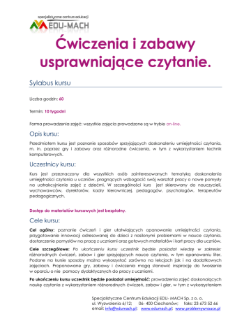 Ćwiczenia i zabawy usprawniające czytanie. Sylabus kursu Liczba godzin: 60 Termin: 10 tygodni Forma prowadzenia zajęć: wszystkie zajęcia prowadzone są w trybie on-line. Opis kursu: Przedmiotem kursu jest poznanie sposobów sprzyjających doskonaleniu umiejętności czytania, m. in. poprzez gry i zabawy oraz różnorodne ćwiczenia, w tym z wykorzystaniem technik komputerowych. Uczestnicy kursu: Kurs jest przeznaczony dla wszystkich osób zainteresowanych tematyką doskonalenia umiejętności czytania u uczniów, pragnących wzbogacić swój warsztat pracy o nowe pomysły na uatrakcyjnienie zajęć z dziećmi. W szczególności kurs jest skierowany do nauczycieli, wychowawców, dyrektorów, kadry kierowniczej, pedagogów, psychologów, terapeutów pedagogicznych. Dostęp do materiałów kursowych jest bezpłatny. Cele kursu: Cel ogólny: poznanie ćwiczeń i gier ułatwiających opanowanie umiejętności czytania, przygotowanie innowacji adresowanej do dzieci z nasilonymi problemami w nauce czytania, dostarczenie pomysłów na pracę z uczniami oraz gotowych materiałów i kart pracy dla uczniów. Cele szczegółowe: Po ukończeniu kursu uczestnik będzie posiadał wiedzę w zakresie: różnorodnych ćwiczeń, zabaw i gier sprzyjających nauce czytania, w tym opanowaniu liter. Podane na kursie sposoby można wykorzystać zarówno na lekcjach jak i na dodatkowych zajęciach. Proponowane gry, zabawy i ćwiczenia mogą stanowić inspirację do tworzenia w oparciu o nie pomocy dydaktycznych do pracy z uczniami. Po ukończeniu kursu uczestnik będzie posiadał umiejętność: prowadzenia zajęć doskonalących naukę czytania z wykorzystaniem różnorodnych ćwiczeń, zabaw i gier, w tym z wykorzystaniem Specjalistyczne Centrum Edukacji EDU- MACH Sp. z o. o. ul. Wyzwolenia 6/12; 06- 400 Ciechanów; faks: 23 673 52 66 email: [email protected]; www.edumach.pl; www.problemywnauce.pl aplikacji internetowych oraz zaplanowania innowacji sprzyjającej zwiększeniu umiejętności w zakresie czytania. Organizacja kursu: Kurs składa się z 5 modułów realizowanych przez internet w rytmie co dwa tygodnie. Łącznie więc kurs obejmuje 10 tygodni. Co dwa tygodnie (co drugi poniedziałek) będą udostępniane nowe materiały do studiowania i zadania online. Po każdym module odbywają się testy, a niekiedy wykonywane są zadania/ ćwiczenia dodatkowe. Nie wszystkie zadania są obowiązkowe. Kurs kończy się egzaminem on-line (dla osób, które pragną otrzymać certyfikat). Materiały kursu zostały podzielone na materiały podstawowe (obowiązkowe) oraz uzupełniające. Konsultacje online w sprawach merytorycznych: odbywają się na forum ogólnym kursu. Pytania uczestników są grupowane wg pojawiających się problemów i udzielna jest raz w tygodniu odpowiedź na forum. Program i harmonogram kursu: Moduły kursu Treść kursu Moduł 1: Przygotowanie do nauki czytania. 1. 2. 3. 4. Gotowość do nauki czytania i pisania. Przyczyny trudności w nauce. Etapy pracy z dzieckiem z nasilonymi trudnościami w czytaniu. Zabawy przygotowujące do nauki czytania oraz zabawy usprawniające zaburzone funkcje.. Moduł 2: Ćwiczenia utrwalające litery. Różnicowanie mylonych liter. 1. 2. 3. Ćwiczenia sprzyjające opanowaniu liter. Zabawy i gry utrwalające litery. Ćwiczenia dla uczniów mylących litery. Moduł 3: Ćwiczenia w czytaniu przykłady. 24.04. – 08.05.2017 r. 1. 2. 3. Analiza procesu czytania. Zabawy związane z nauką czytania. Karty pracy dla dzieci z trudnościami w nauce czytania. Moduł 4: Wykorzystanie gier w nauce czytania. 1. 2. Gry związane z nauką czytania (karciane, losowe, planszowe). Strony internetowe pozwalające na samodzielne tworzenie gier związanych z doskonaleniem czytania. Moduł 5: Ćwiczenia w czytaniu ze zrozumieniem. 1. 2. Książki polecane dzieciom do czytania. Zalecenia dla rodziców dziecka z nasilonymi trudnościami w czytaniu. Karty pracy do ćwiczeń czytania ze zrozumieniem. Przygotowanie innowacji: „Trening czytania z wykorzystaniem gier i zabaw”. 27.03.2017 r. – 10.04.2017 r. 10.04. – 24.04.2017 r. 08.05. – 22.05.2017 r. 22.05. – 05.06.2017 r. 3. 4. Specjalistyczne Centrum Edukacji EDU- MACH Sp. z o. o. ul. Wyzwolenia 6/12; 06- 400 Ciechanów; faks: 23 673 52 66 email: [email protected]; www.edumach.pl; www.problemywnauce.pl EGZAMIN KOŃCOWY 22.05. – 05.06.2017 r. obowiązkowy w przypadku potrzeby otrzymania zaświadczenia Rodzaje aktywności wymagane w poszczególnych modułach kursu (nie wszystkie w każdym module): przeczytać obowiązkowe materiały, rozwiązać test tj. odpowiedzieć na kilka pytań związanych z kursem (obowiązkowe w przypadku potrzeby otrzymania zaświadczenia o ukończeniu kursu), wziąć udział w dyskusji na forum (zadanie dodatkowe), wykonać ćwiczenie/ zadanie dodatkowe (nieobowiązkowe), obejrzeć filmik, wykonać ćwiczenia do samokontroli, odwiedzić podane strony internetowe. Warunki zaliczenia i uzyskania certyfikatu: Warunki zaliczenia kursu i uzyskania zaświadczenia są następujące: wzięcie udziału w 5 mini-testach online z każdego modułu (wynik testu nie ma wpływu na zaliczenie kursu), uzyskanie pozytywnej oceny z egzaminu końcowego. Warunkiem udziału w egzaminie online jest: zaliczenie testów z poszczególnych modułów, przesłanie zgłoszenia na egzamin, opłacenie egzaminu i certyfikatu (50zł. za certyfikat w wersji elektronicznej lub 60 zł. za certyfikat w wersji papierowej i elektronicznej). Dla uczestników, którzy z różnych względów nie będą mogli zakończyć kursu w terminie i którym nie uda się zaliczyć przewidzianych w danym terminie testów z poszczególnych modułów będzie możliwość pod koniec kursu (od przedostatniego modułu) uzyskania dostępu do materiałów i zaliczenia zaległych testów. Uwagi końcowe: Wszelkie problemy techniczne i inne związane z organizacją kursu należy zgłaszać drogą elektroniczną na adres: [email protected] Zgłaszane problem