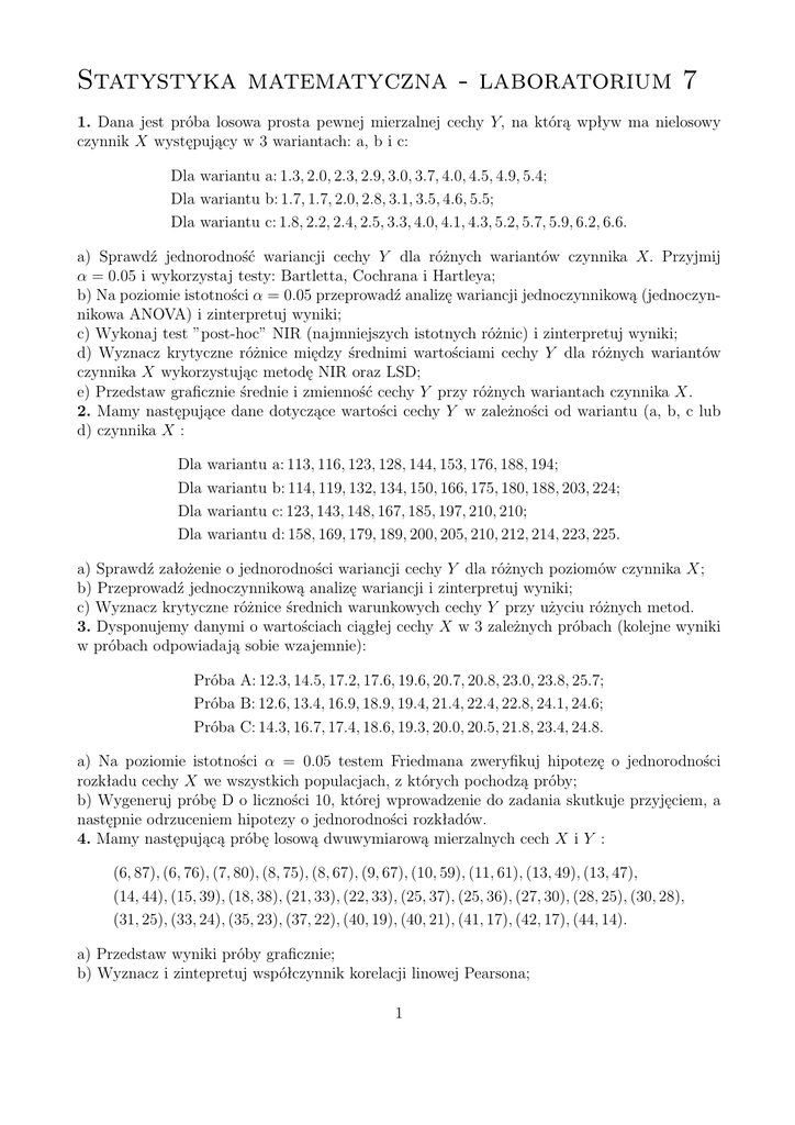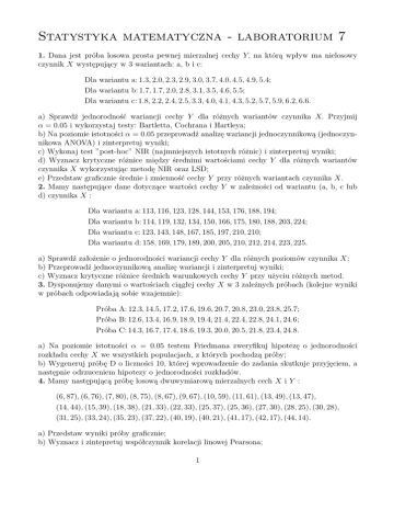 Statystyka matematyczna - laboratorium 7 1. Dana jest próba losowa prosta pewnej mierzalnej cechy Y, na którą wpływ ma nielosowy czynnik X występujący w 3 wariantach: a, b i c: Dla wariantu a: 1.3, 2.0, 2.3, 2.9, 3.0, 3.7, 4.0, 4.5, 4.9, 5.4; Dla wariantu b: 1.7, 1.7, 2.0, 2.8, 3.1, 3.5, 4.6, 5.5; Dla wariantu c: 1.8, 2.2, 2.4, 2.5, 3.3, 4.0, 4.1, 4.3, 5.2, 5.7, 5.9, 6.2, 6.6. a) Sprawdź jednorodność wariancji cechy Y dla różnych wariantów czynnika X. Przyjmij α = 0.05 i wykorzystaj testy: Bartletta, Cochrana i Hartleya; b) Na poziomie istotności α = 0.05 przeprowadź analizę wariancji jednoczynnikową (jednoczynnikowa ANOVA) i zinterpretuj wyniki; c) Wykonaj test ”post-hoc” NIR (najmniejszych istotnych różnic) i zinterpretuj wyniki; d) Wyznacz krytyczne różnice między średnimi wartościami cechy Y dla różnych wariantów czynnika X wykorzystując metodę NIR oraz LSD; e) Przedstaw graficznie średnie i zmienność cechy Y przy różnych wariantach czynnika X. 2. Mamy następujące dane dotyczące wartości cechy Y w zależności od wariantu (a, b, c lub d) czynnika X : Dla Dla Dla Dla wariantu wariantu wariantu wariantu a: 113, 116, 123, 128, 144, 153, 176, 188, 194; b: 114, 119, 132, 134, 150, 166, 175, 180, 188, 203, 224; c: 123, 143, 148, 167, 185, 197, 210, 210; d: 158, 169, 179, 189, 200, 205, 210, 212, 214, 223, 225. a) Sprawdź założenie o jednorodności wariancji cechy Y dla różnych poziomów czynnika X; b) Przeprowadź jednoczynnikową analizę wariancji i zinterpretuj wyniki; c) Wyznacz krytyczne różnice średnich warunkowych cechy Y przy użyciu różnych metod. 3. Dysponujemy danymi o wartościach ciągłej cechy X w 3 zależnych próbach (kolejne wyniki w próbach odpowiadają sobie wzajemnie): Próba A: 12.3, 14.5, 17.2, 17.6, 19.6, 20.7, 20.8, 23.0, 23.8, 25.7; Próba B: 12.6, 13.4, 16.9, 18.9, 19.4, 21.4, 22.4, 22.8, 24.1, 24.6; Próba C: 14.3, 16.7, 17.4, 18.6, 19.3, 20.0, 20.5, 21.8, 23.4, 24.8. a) Na poziomie istotności α = 0.05 testem Friedmana zweryfikuj hipotezę o jednorodności rozkładu cechy X we wszystkich populacjach, z których pochodzą próby; b) Wygeneruj próbę D o liczności 10, której wprowadzenie do zadania skutkuje przyjęciem, a następnie odrzuceniem hipotezy o jednorodności rozkładów. 4. Mamy następującą próbę losową dwuwymiarową mierzalnych cech X i Y : (6, 87), (6, 76), (7, 80), (8, 75), (8, 67), (9, 67), (10, 59), (11, 61), (13, 49), (13, 47), (14, 44), (15, 39), (18, 38), (21, 33), (22, 33), (25, 37), (25, 36), (27, 30), (28, 25), (30, 28), (31, 25), (33, 24), (35, 23), (37, 22), (40, 19), (40, 21), (41, 17), (42, 17), (44, 14). a) Przedstaw wyniki próby graficznie; b) Wyznacz i zintepretuj współczynnik korelacji linowej Pearsona; 1 c) Wyznacz parametry strukturalne równania prostej regresji Y względem X wraz z błędami standardowymi estymacji tych parametrów; d) Wyznacz wariancję składnika resztowego modelu; e) Oceń dopasowanie modelu do empirycznych danych; f) Wyznacz prognozę średniej wartości cechy Y dla wartości X równych 12 (interpolacja) i 45 (ekstrapolacja). 5. Dwuwymiarowa próba cech X i Y dała rezultaty: Cecha X / Cecha Y Liczebność 0-2 12 2-4 4-6 23 34 6-8 8-10 45 43 10-12 30 12-14 22 14-16 16-18 19 10 a) Wyznacz i zinterpretuj współczynnik korelacji liniowej między cechami X i Y ; b) Wyznacz równanie prostej regresji i oceń jej dopasowanie do empirycznych danych. 6. Próba losowa pewnej mierzalnej cechy X o rozkładzie normalnym N (m, 5) dała następujące wyniki: 18, 21, 19, 23, 20, 20, 27, 21, 19, 28, 29, 23, 26, 22, 30, 32, 35. a) Przeprowadź sekwencyjny test hipotezy H0 : m = 24 wobec alternatywy H1 : m = 26, przyjmując α = β = 0.05. b) Czy próba jest wystarczająco liczna do zakończenia procedury sekwencyjnej ? 2