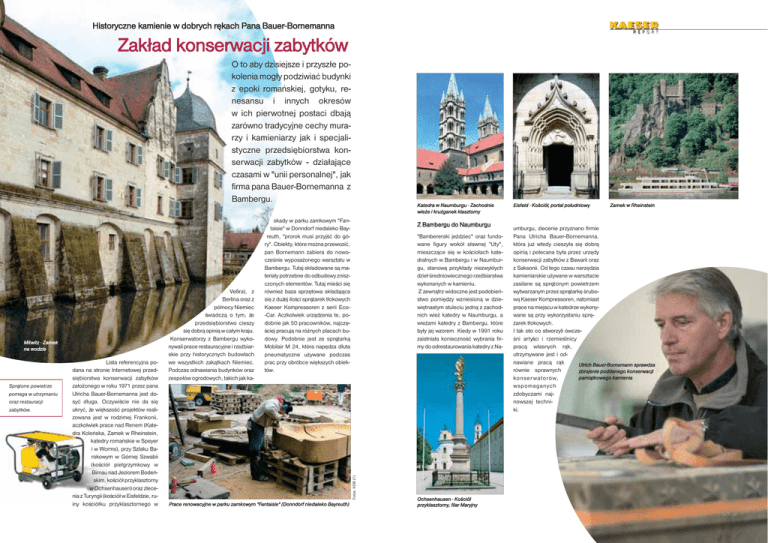 Historyczne kamienie w dobrych rêkach Pana Bauer-B Bornemanna Zak³ad konserwacji zabytków O to aby dzisiejsze i przysz³e pokolenia mog³y podziwiaæ budynki z epoki romañskiej, gotyku, renesansu i innych okresów w ich pierwotnej postaci dbaj¹ zarówno tradycyjne cechy murarzy i kamieniarzy jak i specjalistyczne przedsiêbiorstwa konserwacji zabytków - dzia³aj¹ce czasami w "unii personalnej", jak firma pana Bauer-Bornemanna z Bambergu. Sprê¿one powietrze pomaga w utrzymaniu oraz restauracji zabytków. Lista referencyjna podana na stronie Internetowej przedsiêbiorstwa konserwacji zabytków za³o¿onego w roku 1971 przez pana Ulricha Bauer-Bornemanna jest dosyæ d³uga. Oczywiœcie nie da siê ukryæ, ¿e wiêkszoœæ projektów realizowana jest w rodzimej Frankonii, aczkolwiek prace nad Renem (Katedra Koloñska, Zamek w Rheinstein, katedry romañskie w Speyer i w Worms), przy Szlaku Barokowym w Górnej Szwabii (koœció³ pielgrzymkowy w Birnau nad Jeziorem Bodeñskim, koœció³ przyklasztorny w Ochsenhausen) oraz zlecenia z Turyngii (koœció³ w Eisfeldzie, ruiny koœció³ku przyklasztornego w skady w parku zamkowym "Fantaisie" w Donndorf niedaleko Bayreuth, "prorok musi przyjœæ do góry". Obiekty, które mo¿na przewoziæ, pan Bornemann zabiera do nowoczeœnie wyposa¿onego warsztatu w Bambergu. Tutaj sk³adowane s¹ materia³y potrzebne do odbudowy zniszczonych elementów. Tutaj mieœci siê równie¿ baza sprzêtowa sk³adaj¹ca siê z du¿ej iloœci sprê¿arek t³okowych Kaeser Kompressoren z serii Eco-Car. Aczkolwiek urz¹dzenia te, podobnie jak 50 pracowników, najczêœciej pracuj¹ na ró¿nych placach budowy. Podobnie jest ze sprê¿ark¹ Mobilair M 24, która napêdza d³uta pneumatyczne u¿ywane podczas prac przy obróbce wiêkszych obiektów. Z Bambergu do Naumburgu "Bambererski jeŸdziec" oraz fundowane figury wokó³ s³awnej "Uty", mieszcz¹ce siê w koœcio³ach katedralnych w Bambergu i w Naumburgu, stanow¹ przyk³ady niezwyk³ych dzie³ œredniowiecznego rzeŸbiarstwa wykonanych w kamieniu. Z zewn¹trz widoczne jest podobieñstwo pomiêdzy wzniesion¹ w dziewiêtnastym stuleciu jedn¹ z zachodnich wie¿ katedry w Naumburgu, a wie¿ami katedry z Bambergu, które by³y jej wzorem. Kiedy w 1991 roku zaistnia³a koniecznoœæ wybrania firmy do odrestaurowania katedry z Na- Fotos: KDB (7) Mitwitz - Zamek na wodzie Veßra), z Berlina oraz z pó³nocy Niemiec œwiadcz¹ o tym, ¿e przedsiêbiorstwo cieszy siê dobr¹ opini¹ w ca³ym kraju. Konserwatorzy z Bambergu wykonywali prace restauracyjne i rzeŸbiarskie przy historycznych budowlach we wszystkich zak¹tkach Niemiec. Podczas odnawiania budynków oraz zespo³ów ogrodowych, takich jak ka- Katedra w Naumburgu - Zachodnie wie¿e i kru¿ganek klasztorny Prace renowacyjne w parku zamkowym "Fantaisie" (Donndorf niedaleko Bayreuth) Ochsenhausen - Koœció³ przyklasztorny, filar Maryjny Eisfeld - Koœció³, portal po³udniowy Zamek w Rheinstein umburgu, zlecenie przyznano firmie Pana Ulricha Bauer-Bornemanna, która ju¿ wtedy cieszy³a siê dobr¹ opini¹ i polecana by³a przez urzêdy konserwacji zabytków z Bawarii oraz z Saksonii. Od tego czasu narzêdzia kamieniarskie u¿ywane w warsztacie zasilane s¹ sprê¿onym powietrzem wytwarzanym przez sprê¿arkê œrubow¹ Kaeser Kompressoren, natomiast prace na miejscu w katedrze wykonywane s¹ przy wykorzystaniu sprê¿arek t³okowych. I tak oto co stworzyli ówczeœni artyœci i rzemieœlnicy prac¹ w³asnych r¹k, utrzymywane jest i odnawiane prac¹ r¹k Ulrich Bauer-B Bornemann sprawdza równie sprawnych zbrojenie poddanego konserwacji pami¹tkowego kamienia konser watorów, wspomaganych zdobyczami najnowszej techniki.